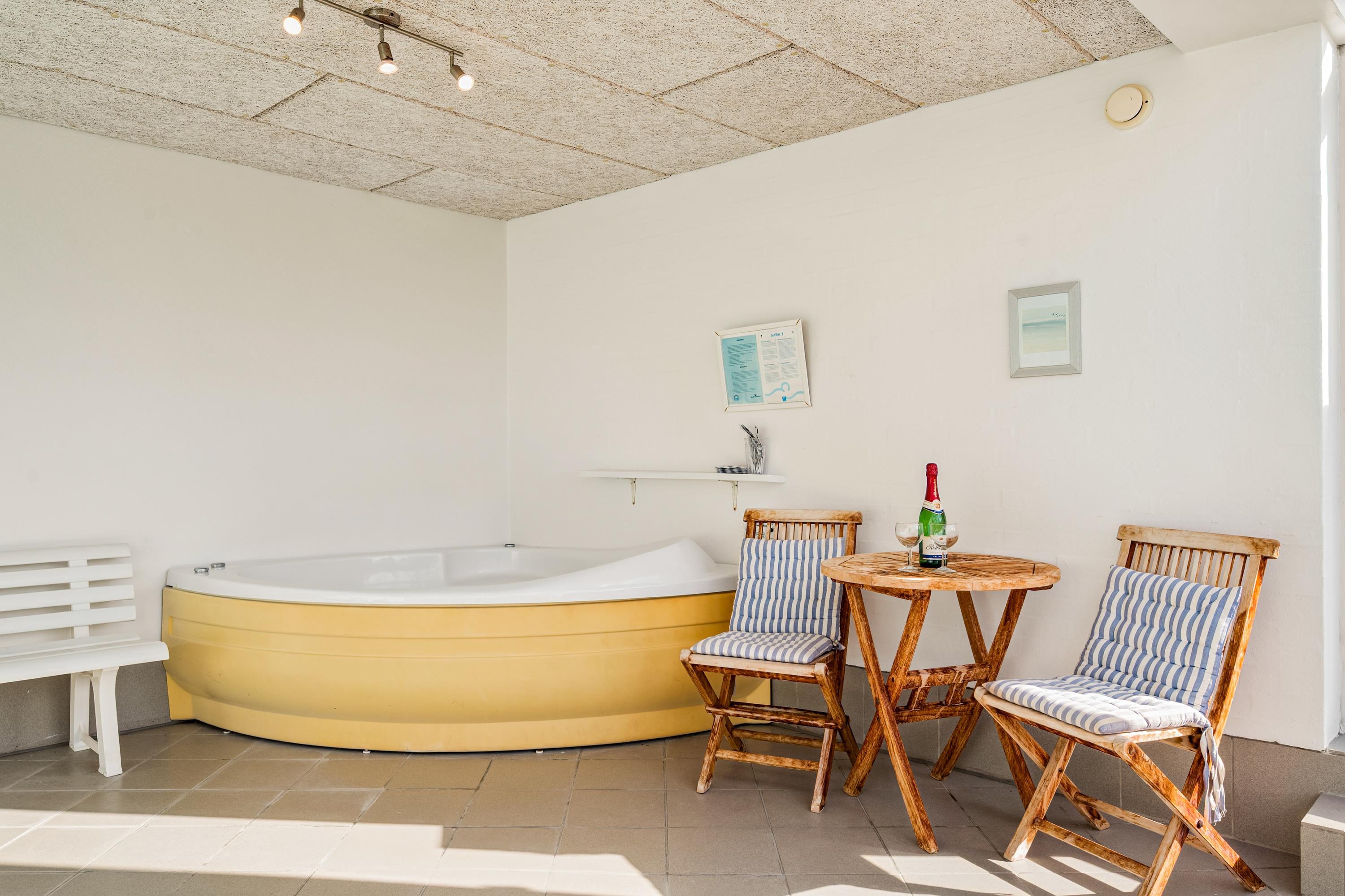 A good staircase leads down to the lower floor, where you’ll find another bedroom with a double bed, an additional bathroom, a sauna, and – not least – the pool area, which also features a hot tub. From the pool area, there is access to a terrace with sun loungers. The house is not suitable for guests with limited mobility, as all access is via stairs.