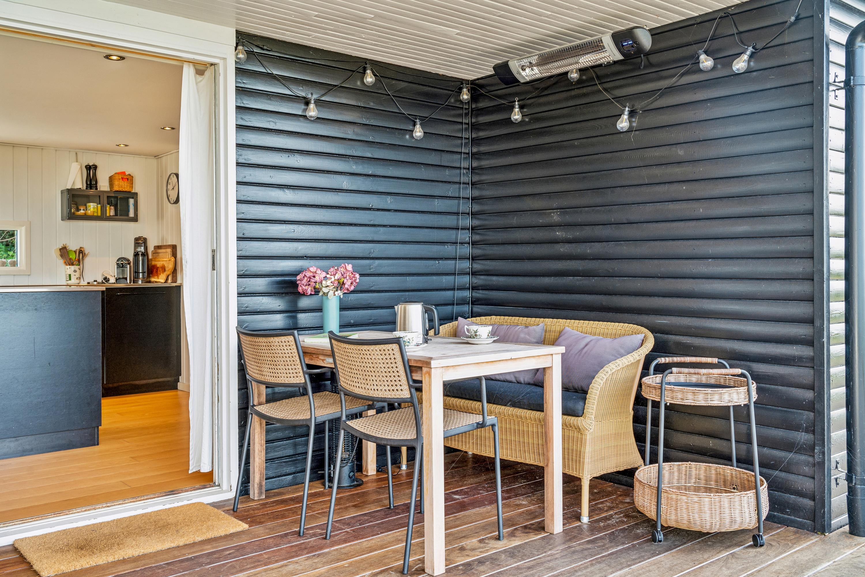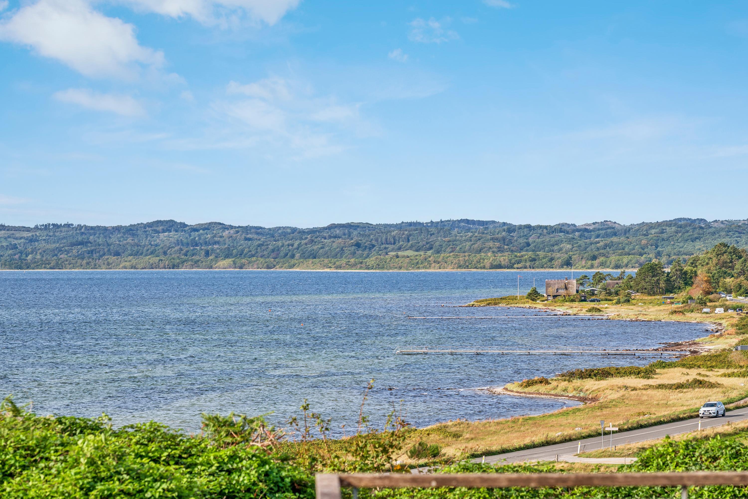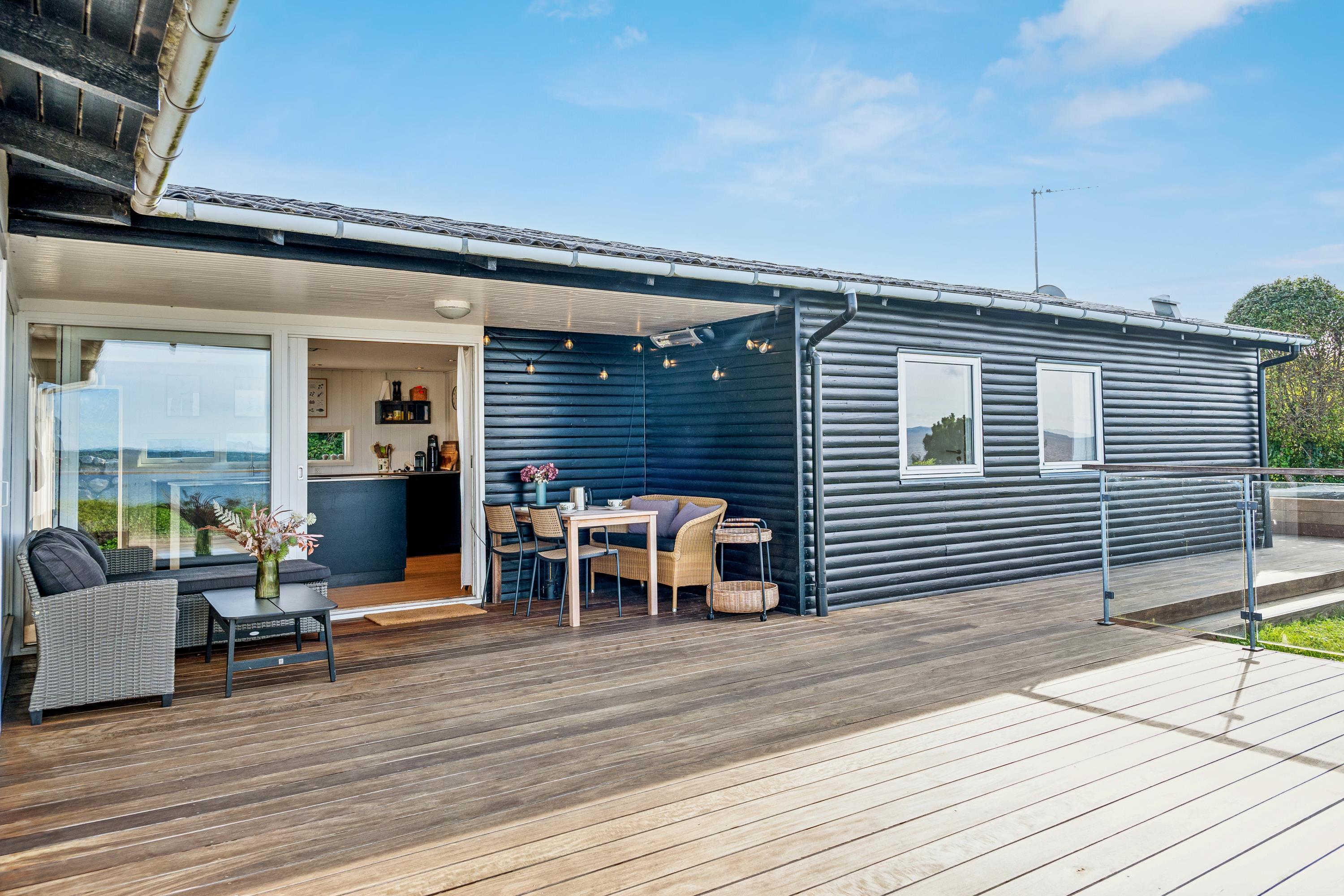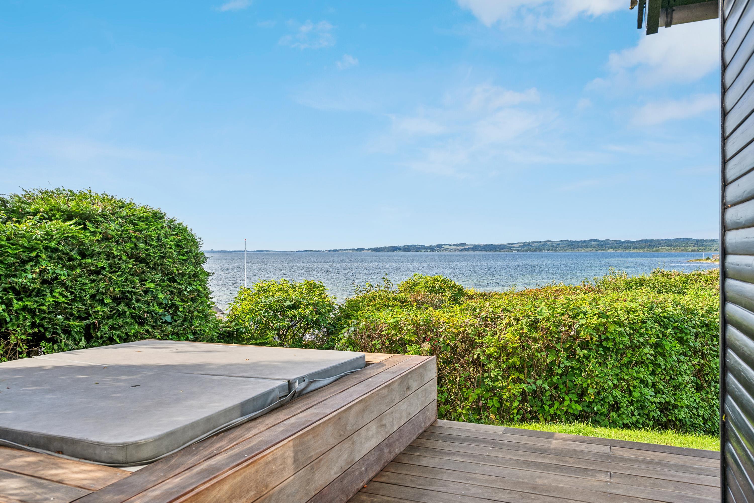 On an elevated natural plot with panoramic views over Ebeltoft Vig, this spacious and well-maintained house stands out as modern and luxurious after a complete renovation in 2011, showcasing quality materials and attention to detail. The house is surrounded by a lovely, sheltered wooden terrace, partially covered, with a large outdoor spa from which you can enjoy the view. It includes quality outdoor furniture, sun loungers, and a grill.