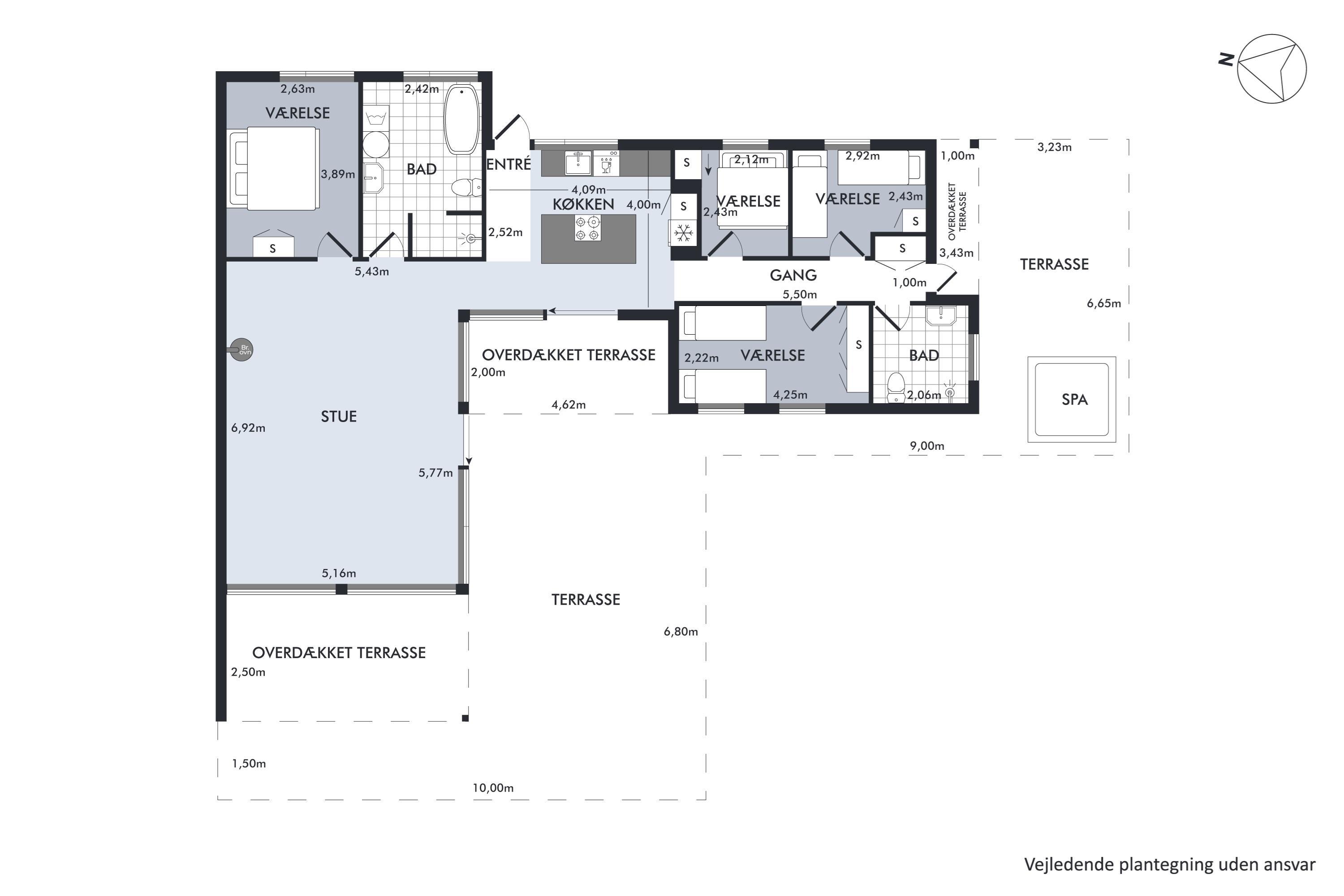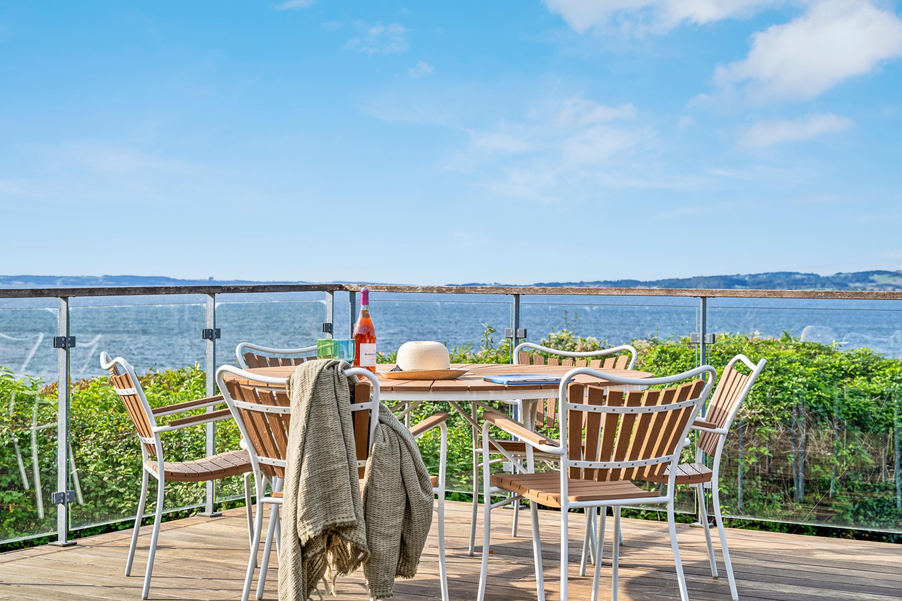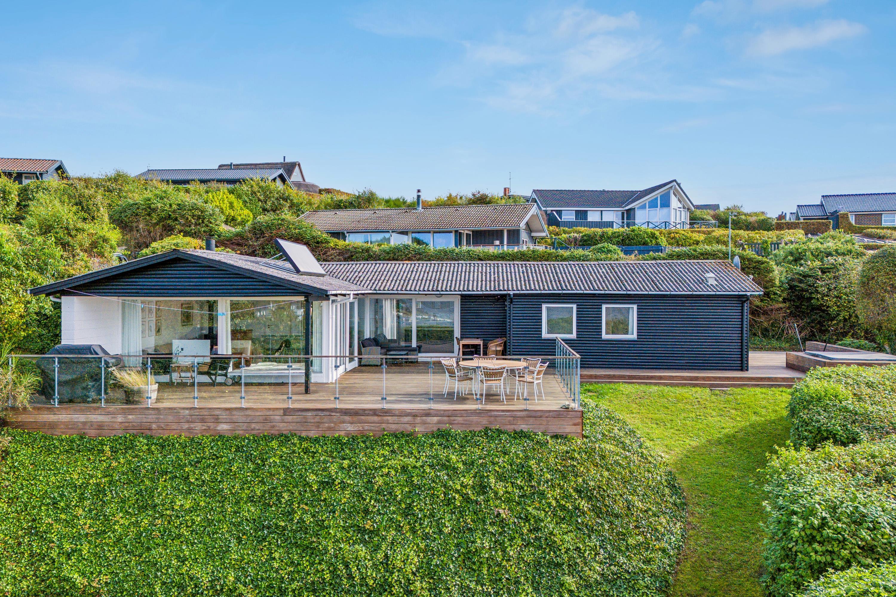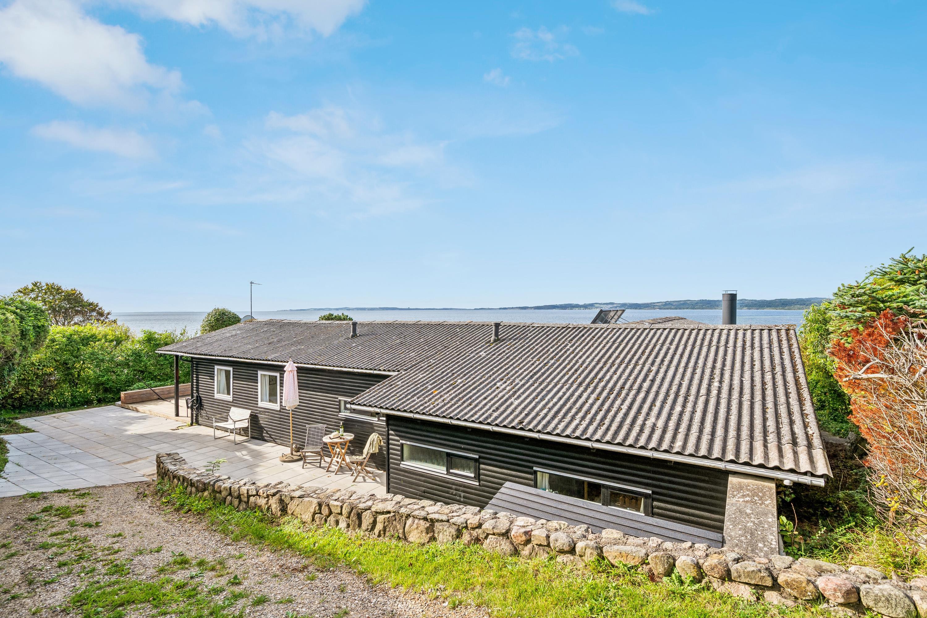 On an elevated natural plot with panoramic views over Ebeltoft Vig, this spacious and well-maintained house stands out as modern and luxurious after a complete renovation in 2011, showcasing quality materials and attention to detail. The house is surrounded by a lovely, sheltered wooden terrace, partially covered, with a large outdoor spa from which you can enjoy the view. It includes quality outdoor furniture, sun loungers, and a grill.