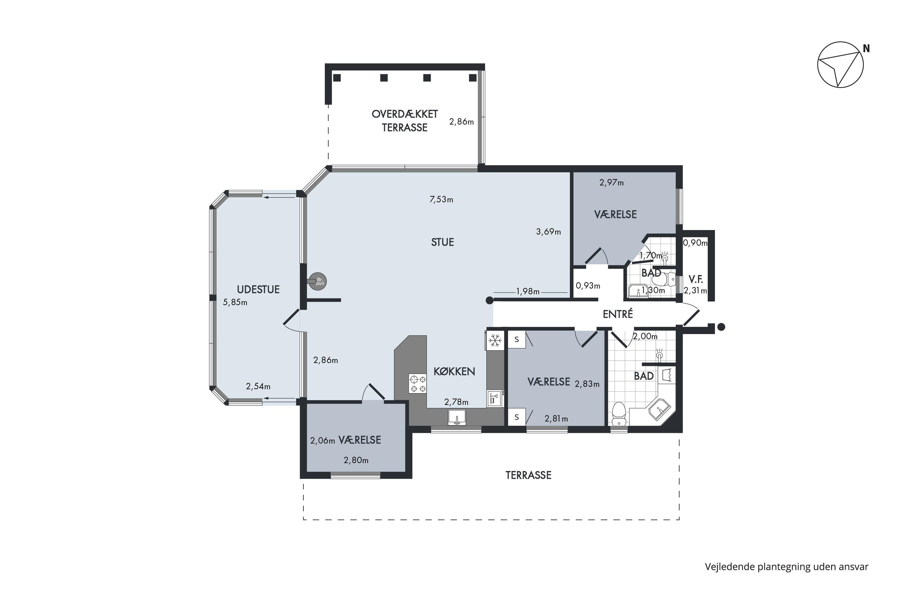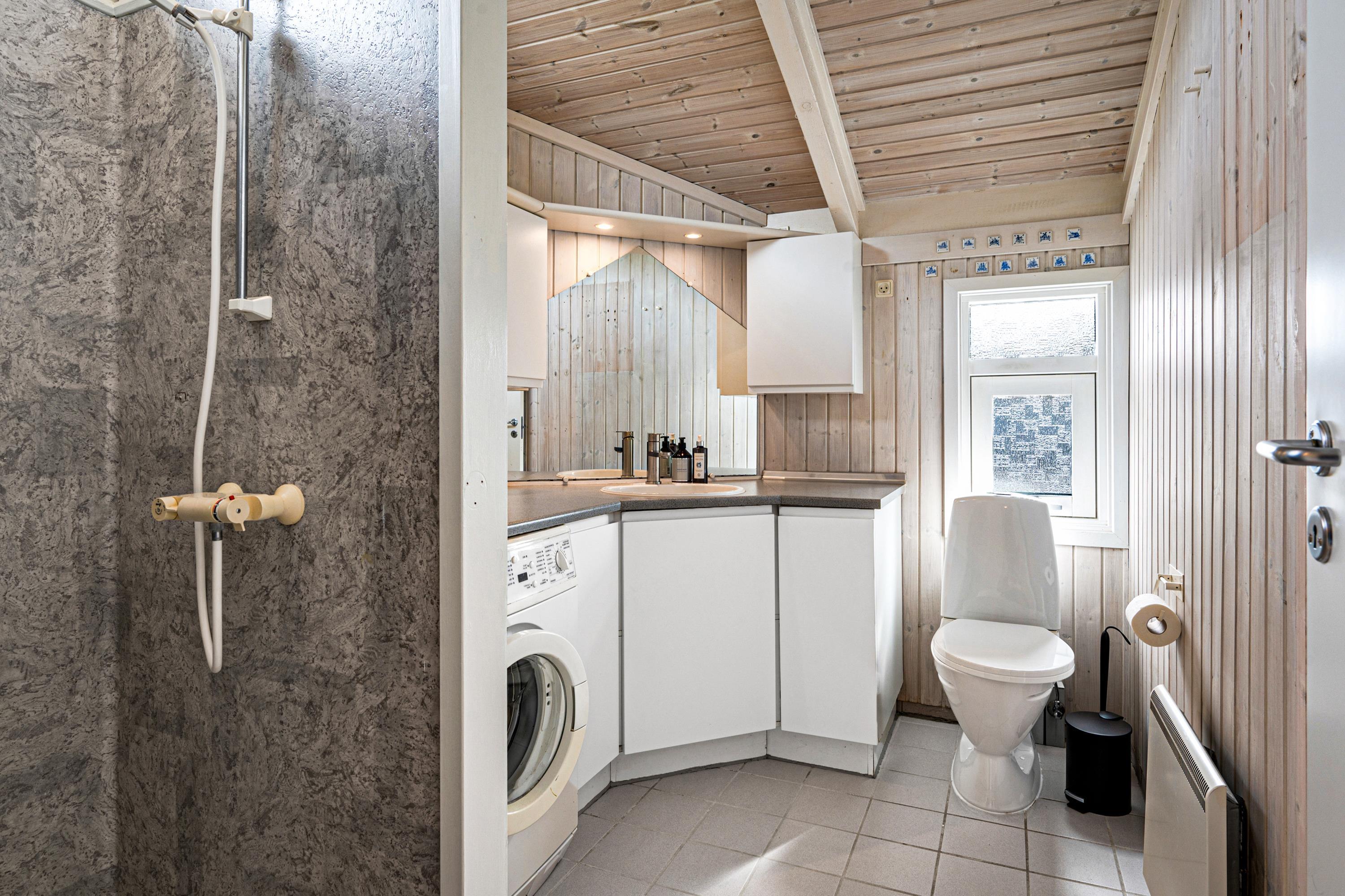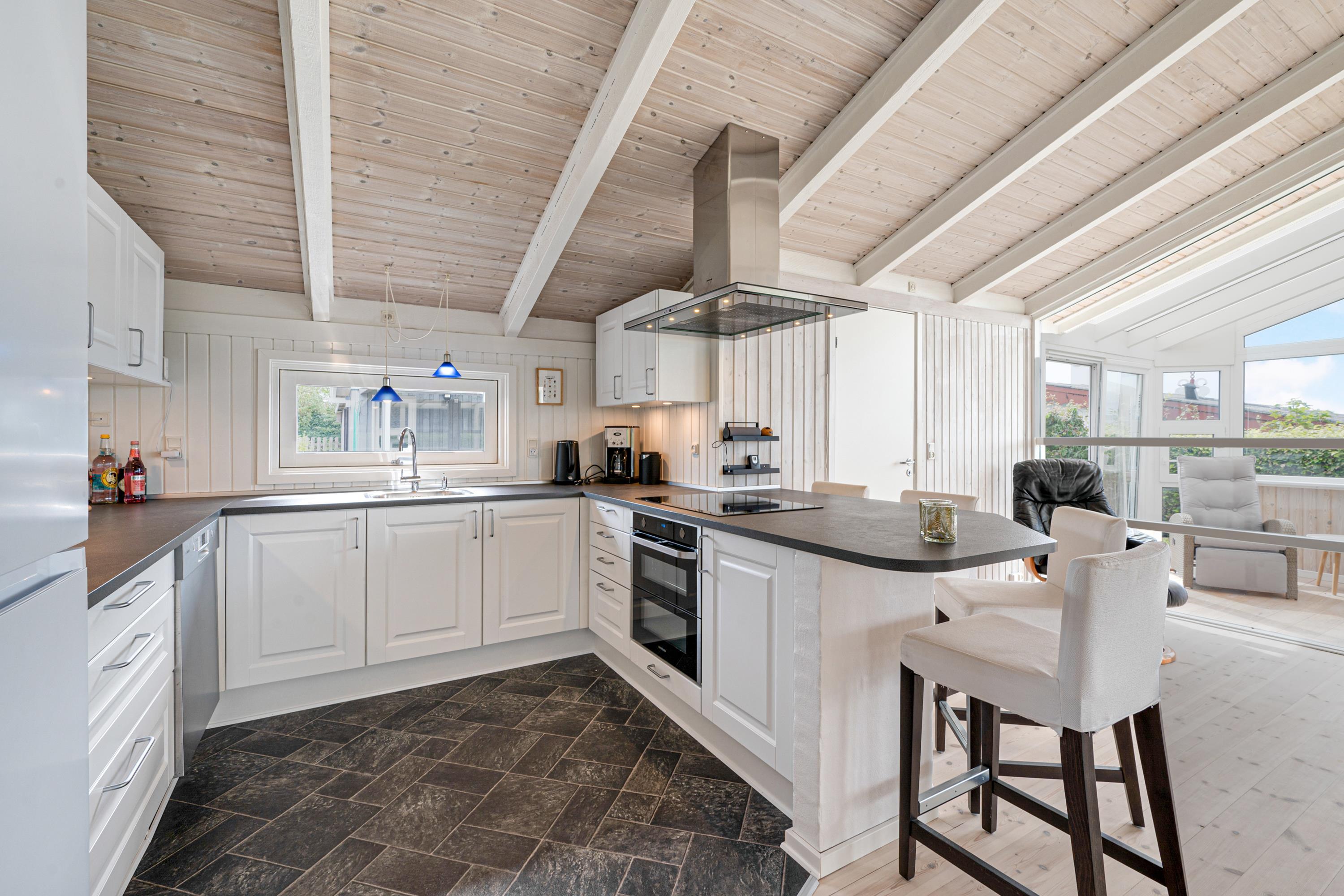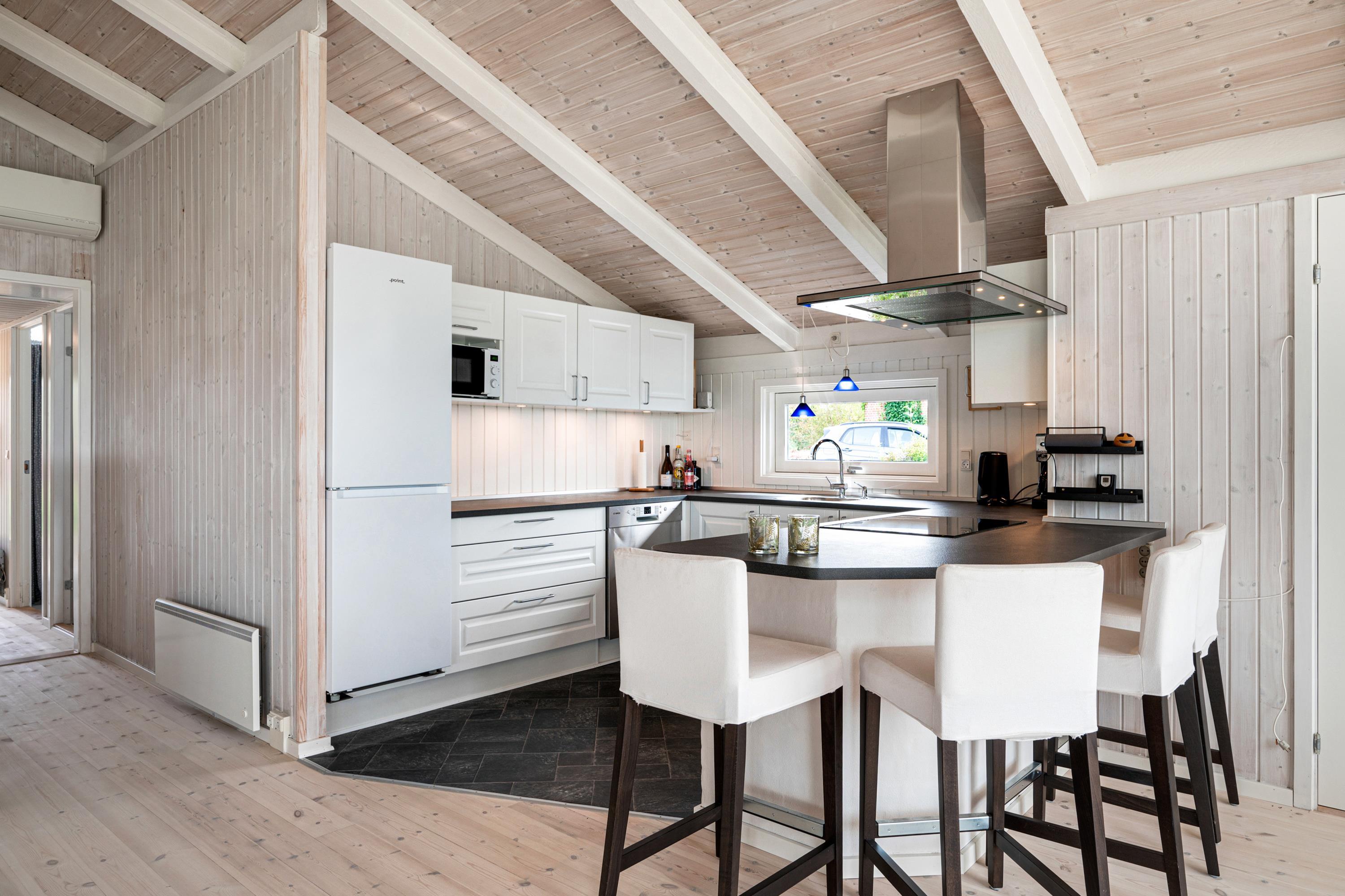 Just a few minutes' drive from Ebeltoft, you'll find this beautiful and well-maintained holiday home. The house features a lovely, bright living room, tastefully furnished with comfortable furniture, a wood-burning stove, and a heat pump. The spacious kitchen area, which includes a dishwasher, is connected to the living room. There are three good-sized bedrooms, all with double beds, one of which is 160x200 cm. The two stylish bathrooms have underfloor heating, one of which also has access to a washing machine.