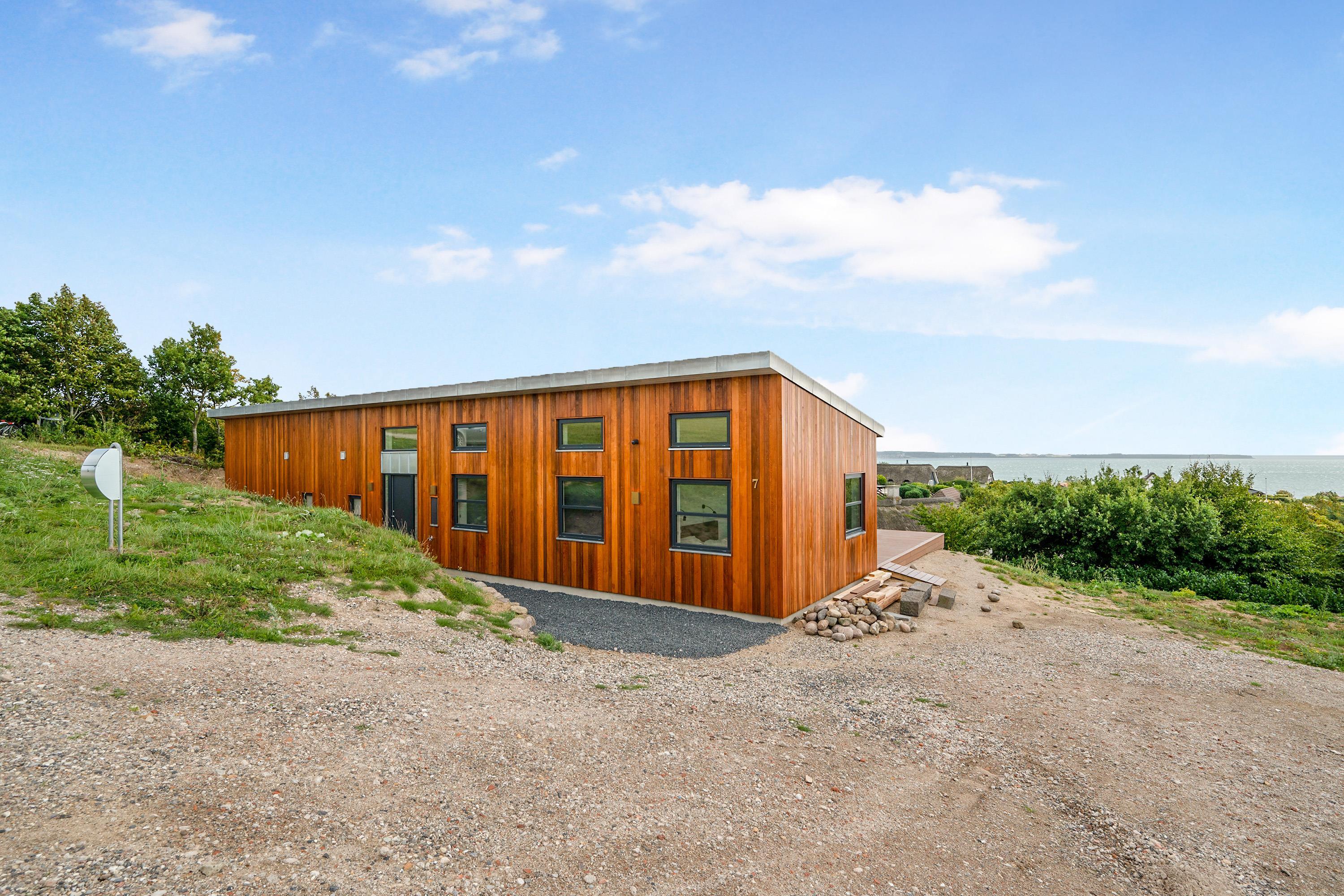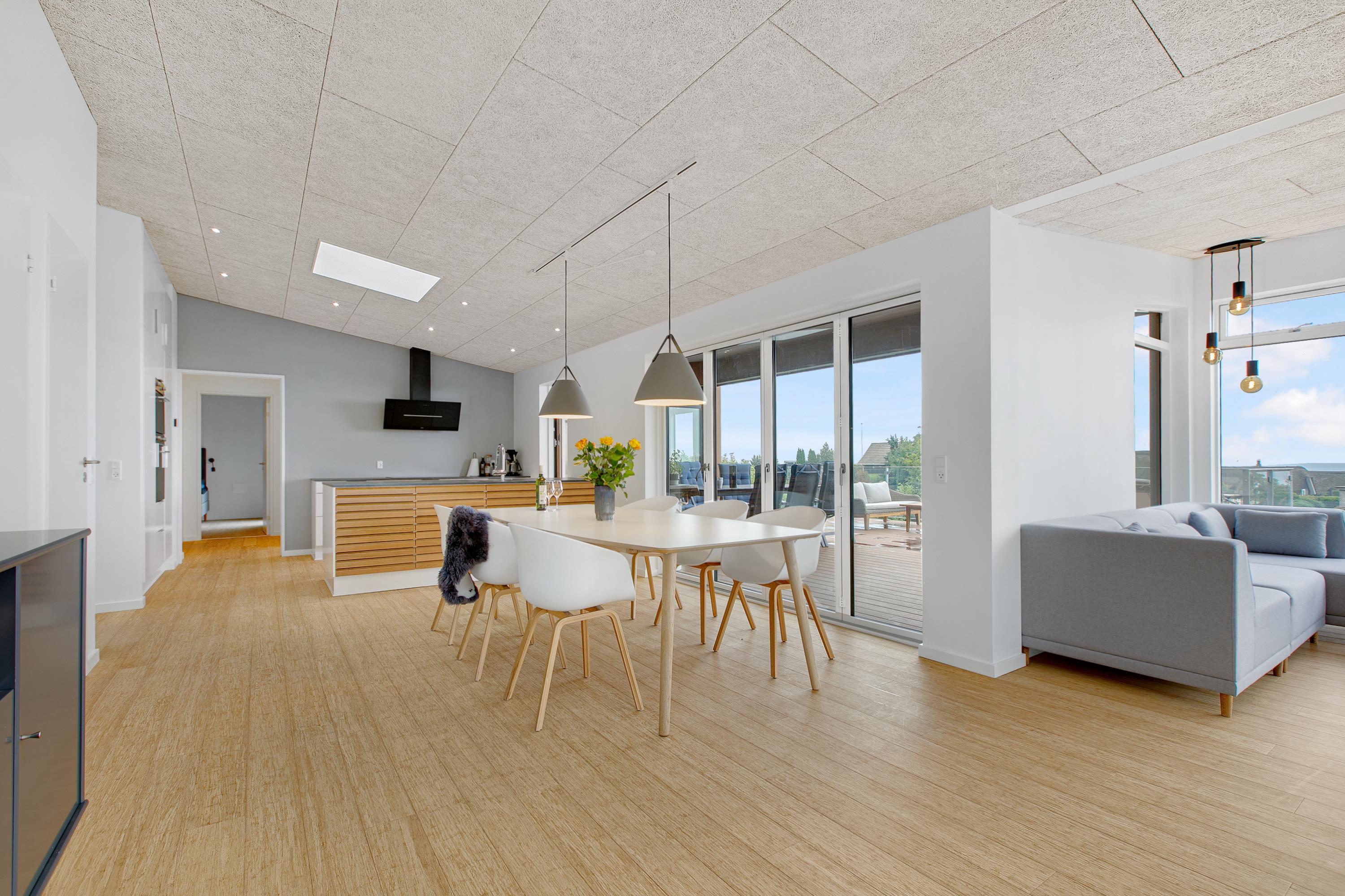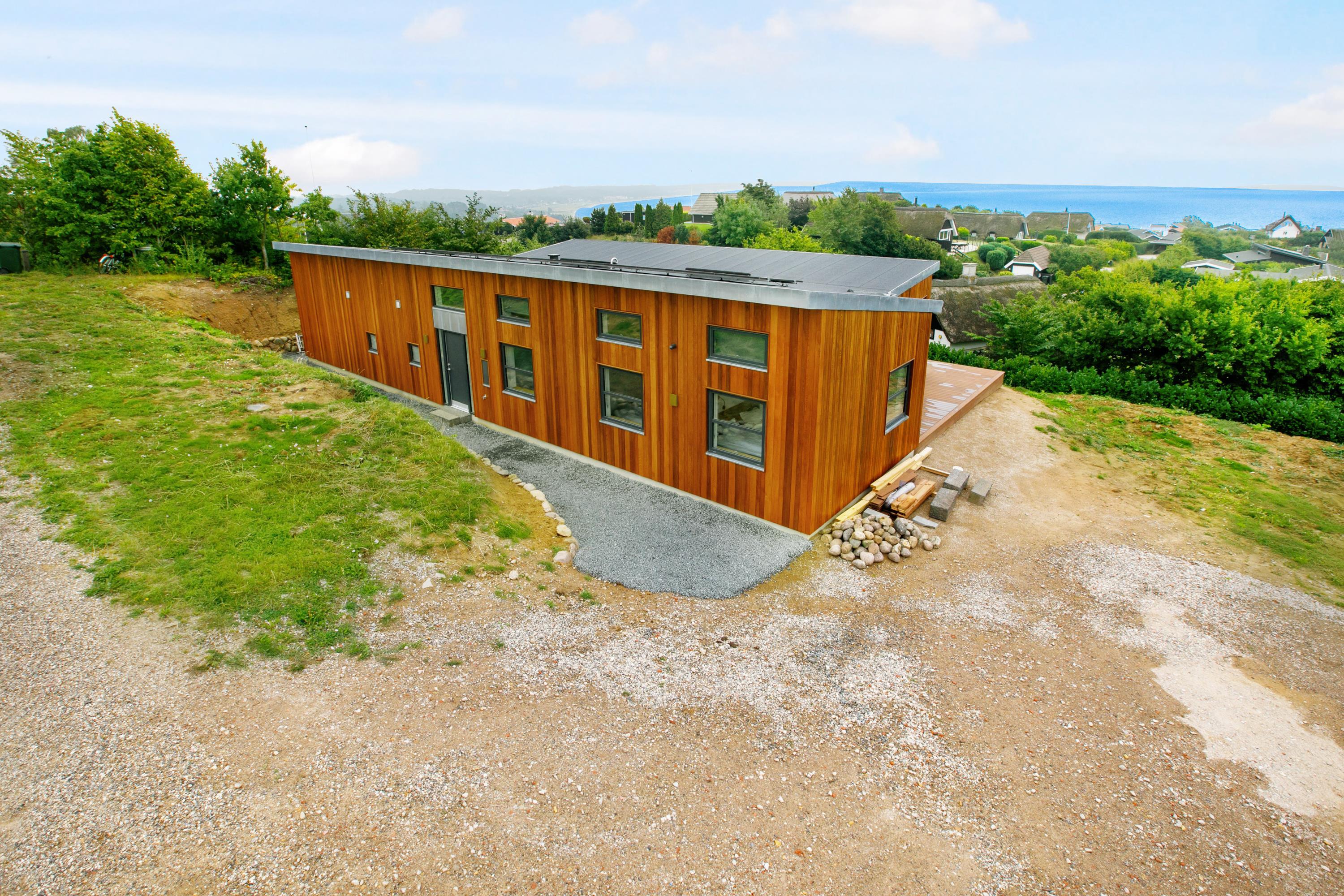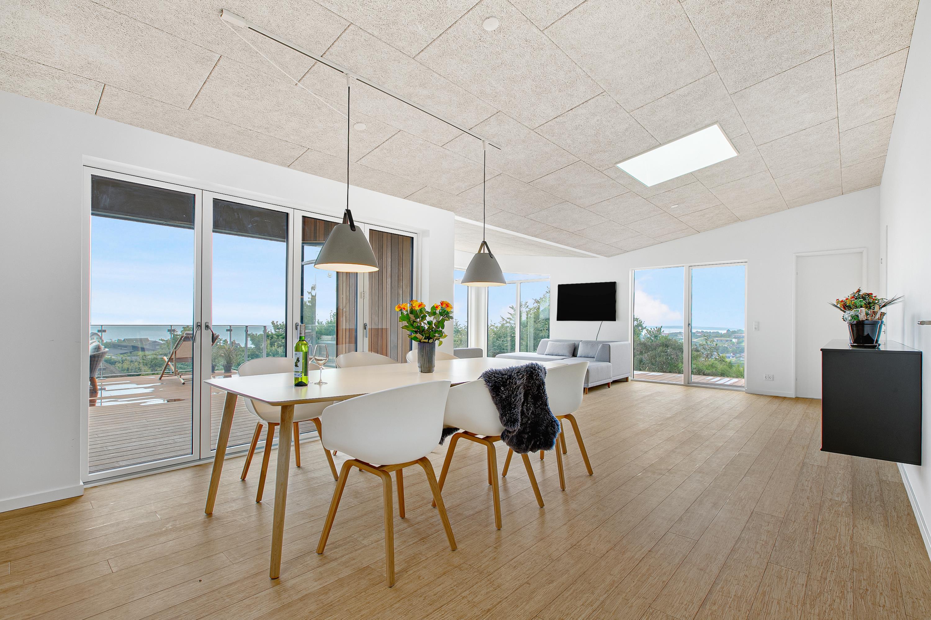With the most beautiful view over Ebeltoft Bay and all the way to Samsø, you'll find this stunning newly built house. The house is architect-designed and constructed with high-quality materials, focusing on sustainability. It is made of cedar wood, with solar panels on the roof and solid bamboo floors throughout.