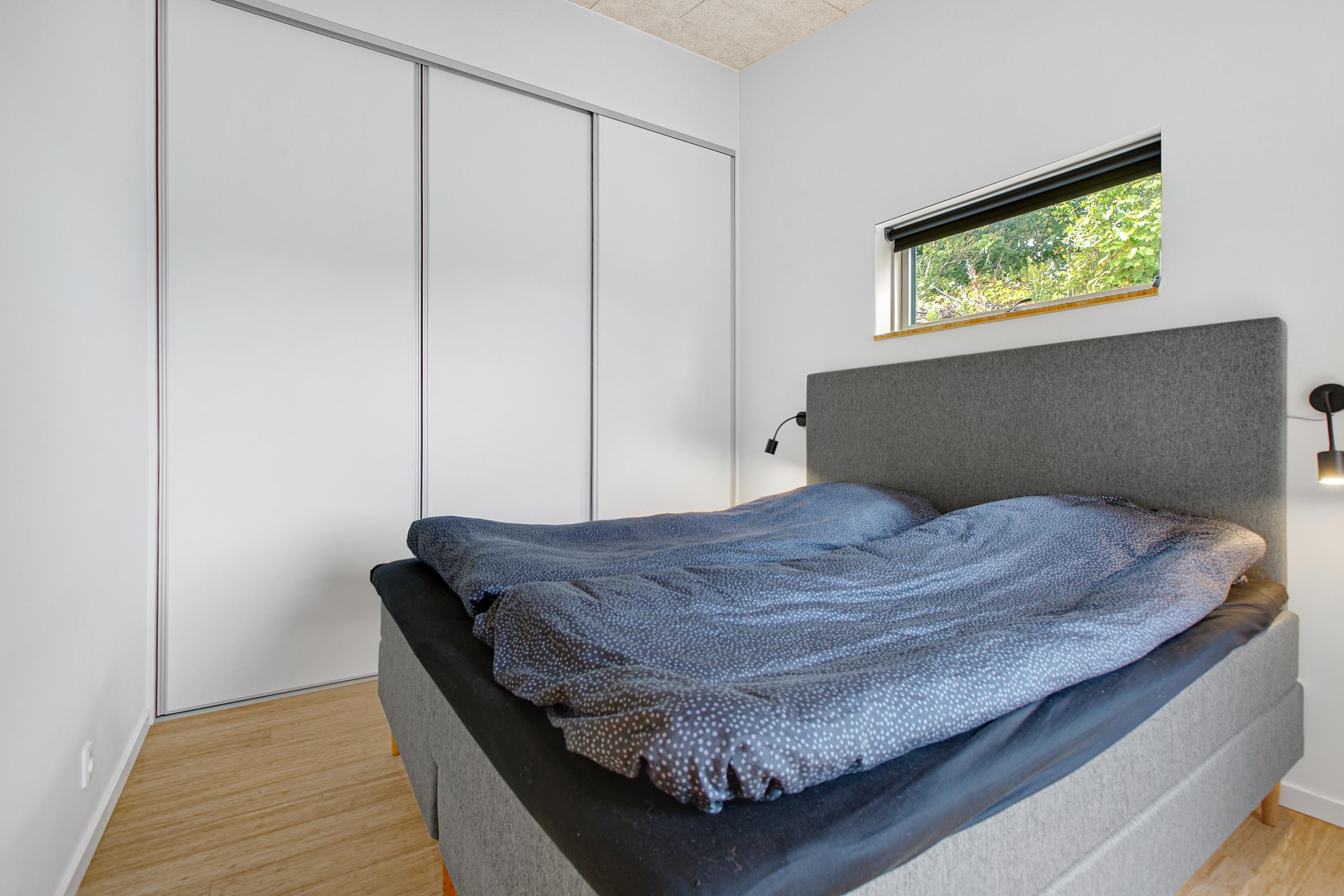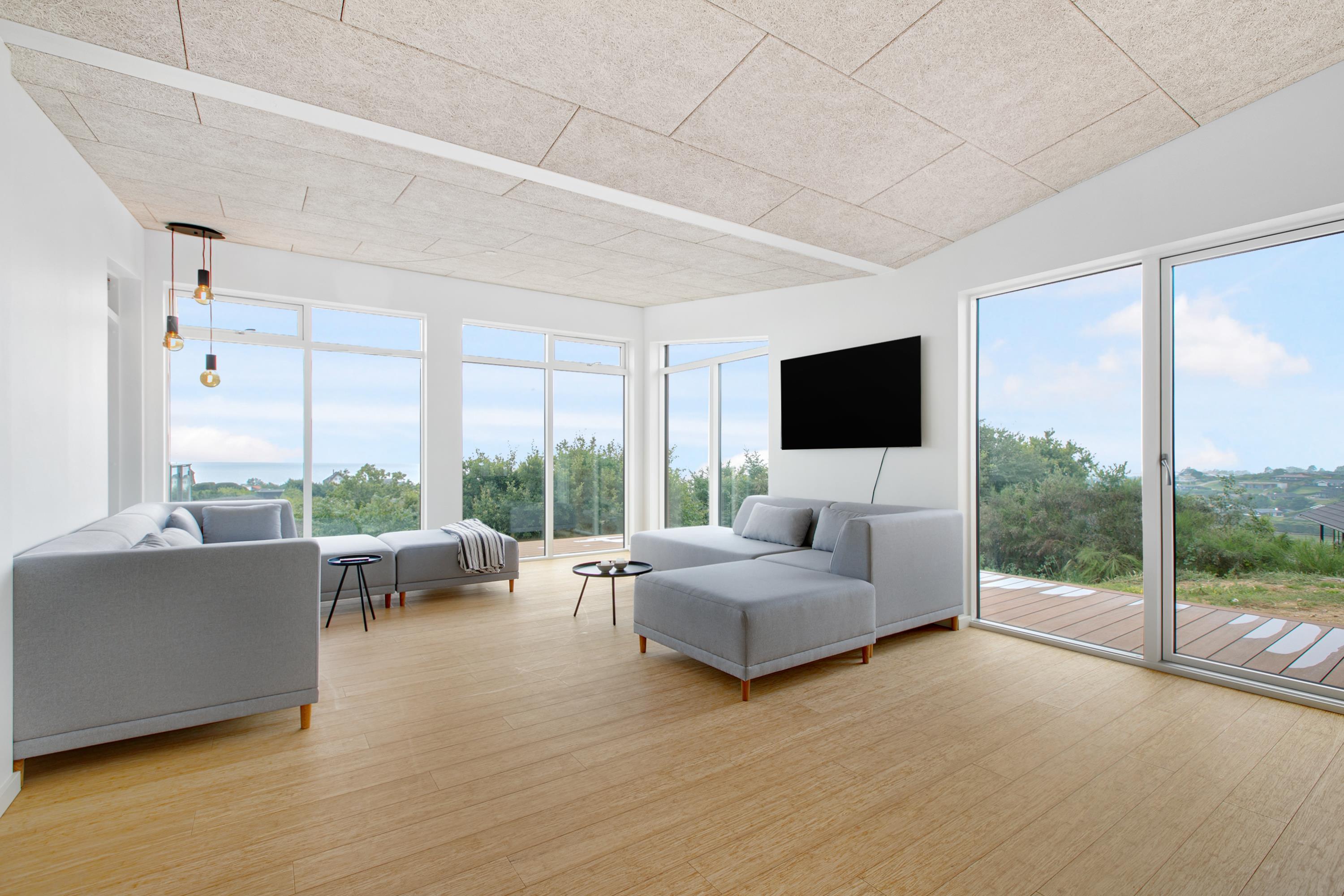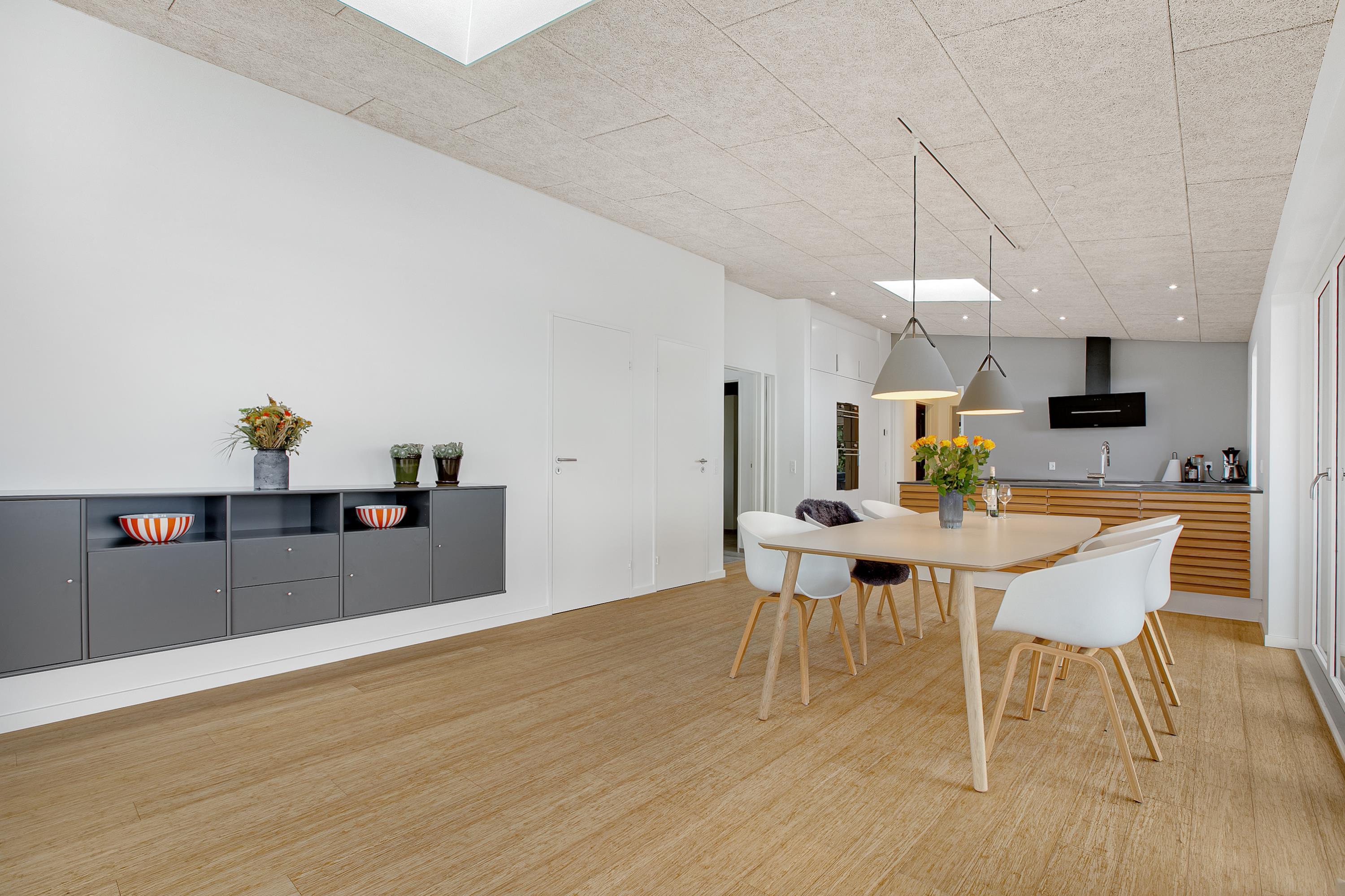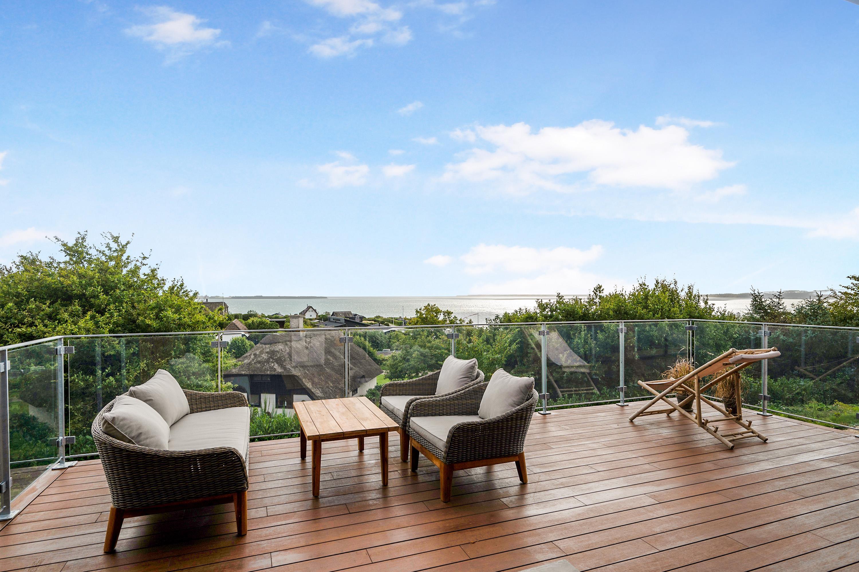 With the most beautiful view over Ebeltoft Bay and all the way to Samsø, you'll find this stunning newly built house. The house is architect-designed and constructed with high-quality materials, focusing on sustainability. It is made of cedar wood, with solar panels on the roof and solid bamboo floors throughout.