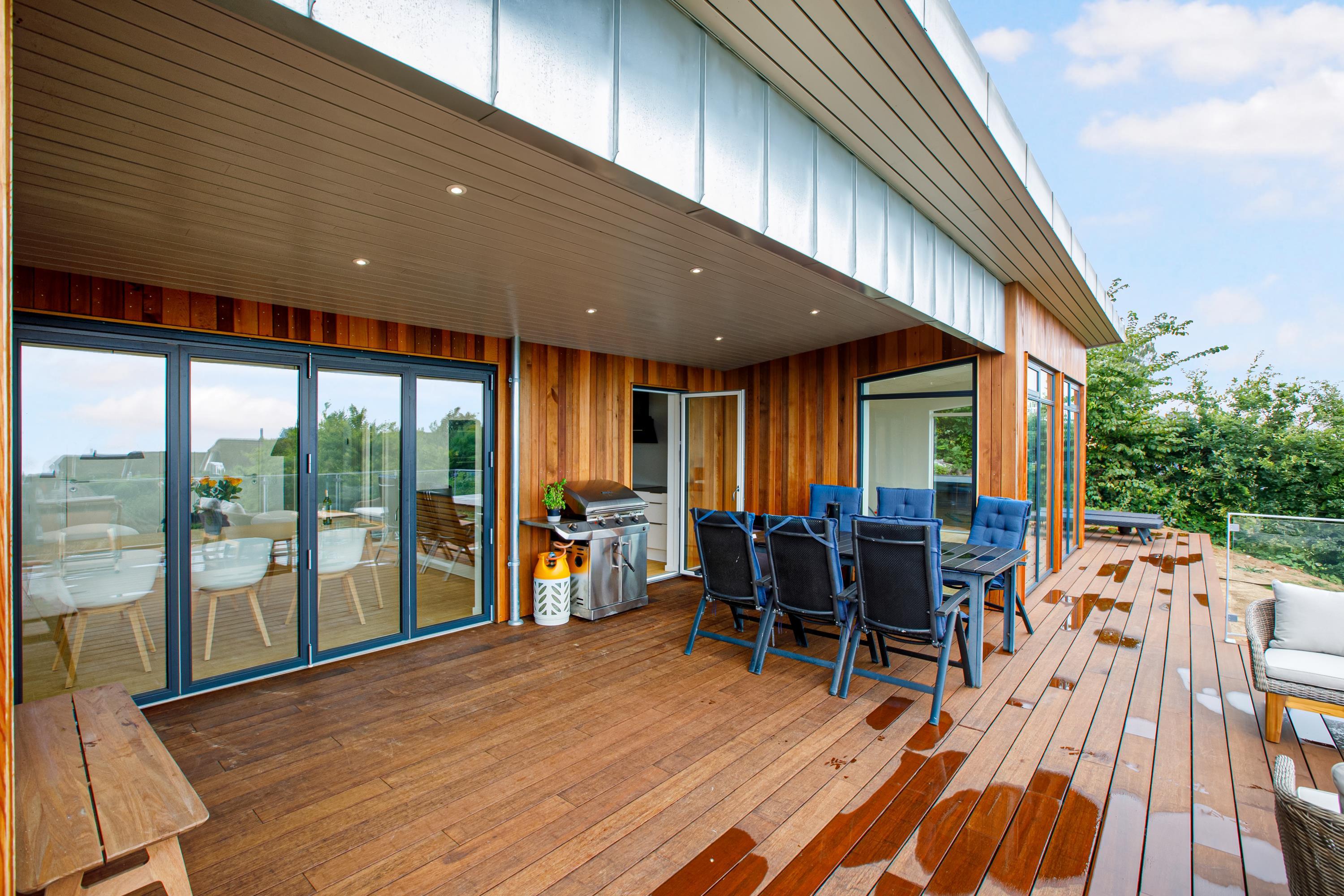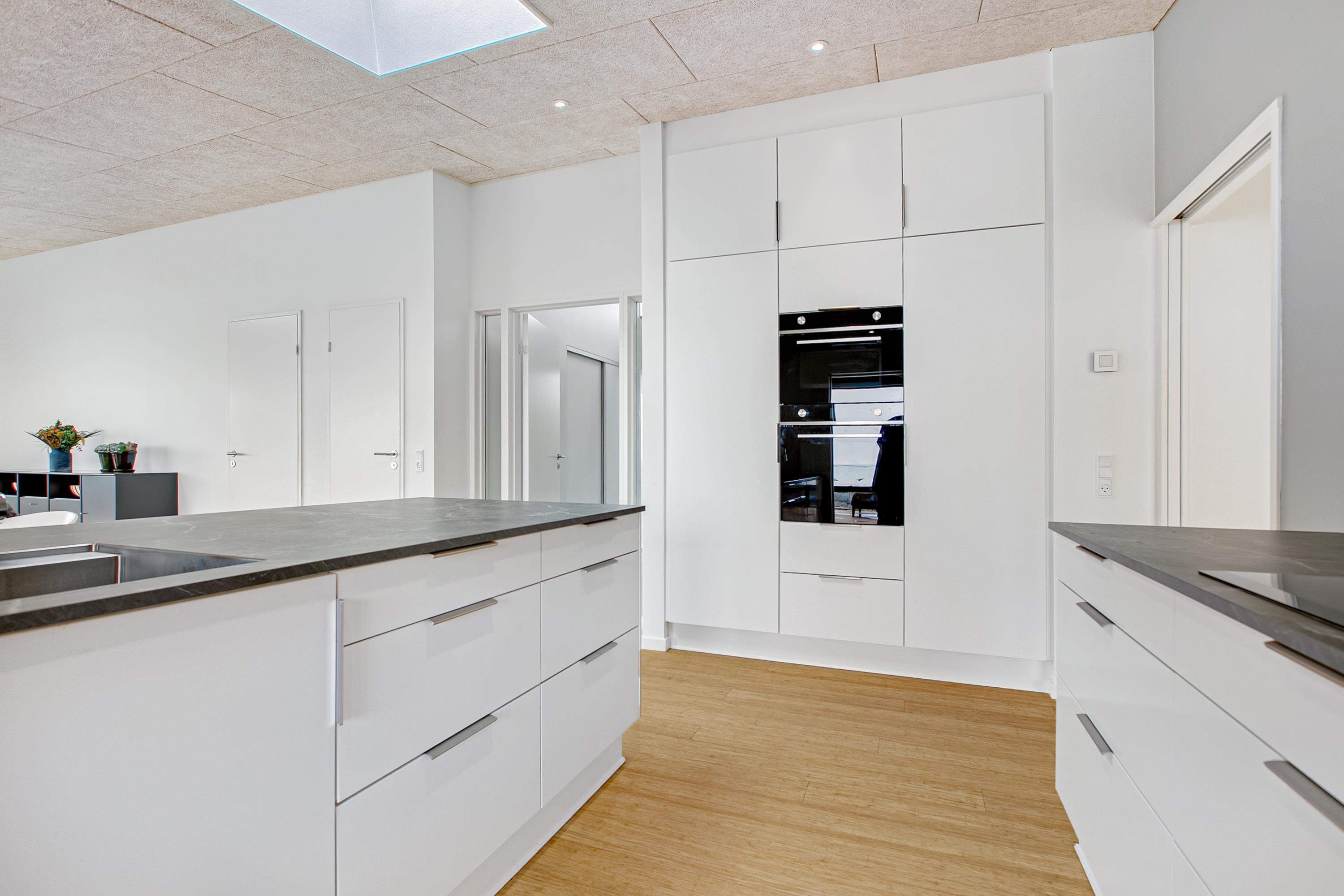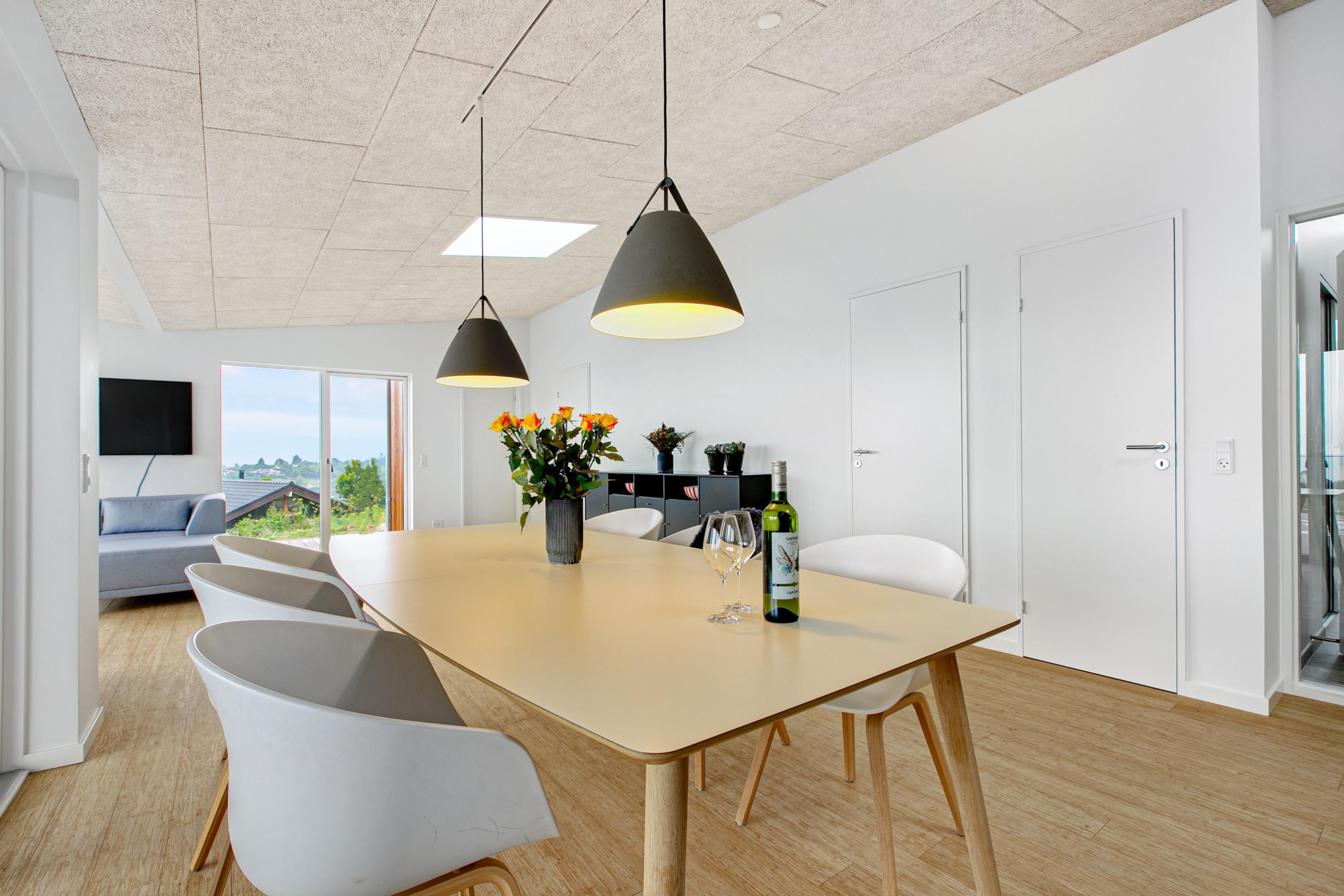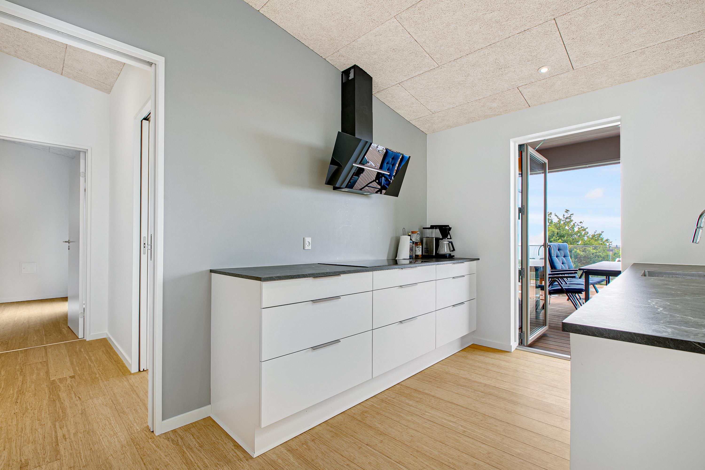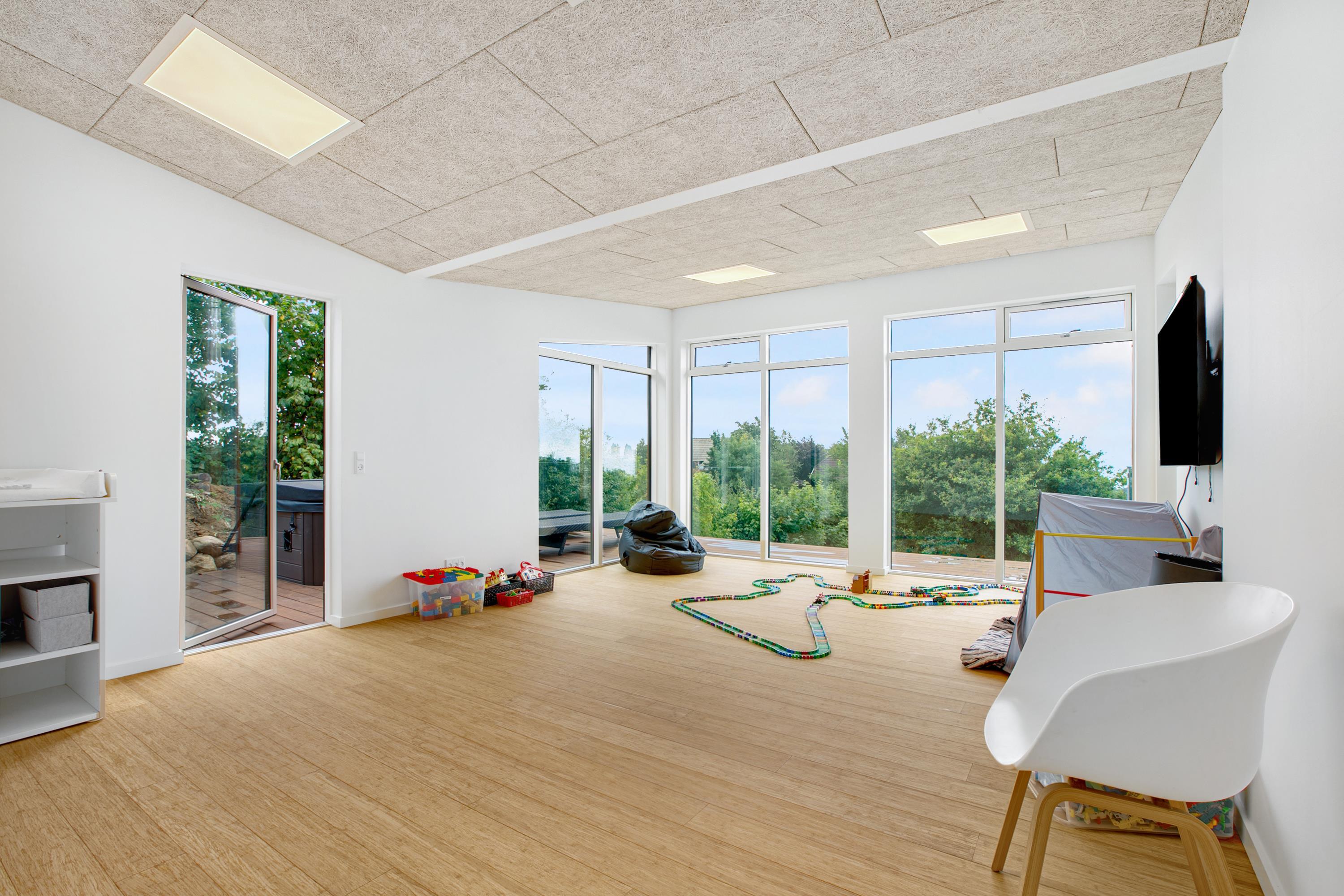 With the most beautiful view over Ebeltoft Bay and all the way to Samsø, you'll find this stunning newly built house. The house is architect-designed and constructed with high-quality materials, focusing on sustainability. It is made of cedar wood, with solar panels on the roof and solid bamboo floors throughout.
