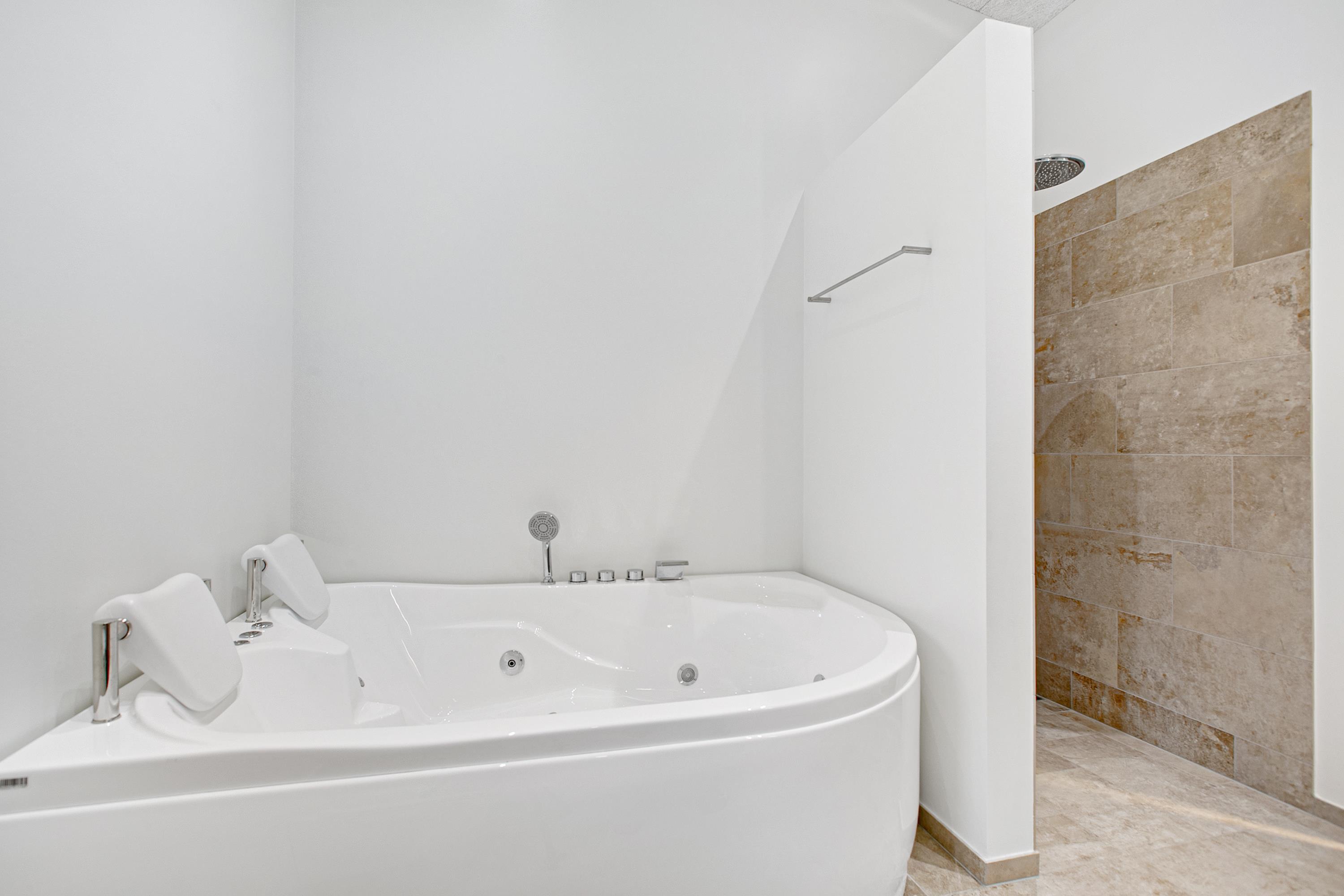 The house features a spacious, bright living room with sleek furniture and a panoramic view of the water. Adjacent to the living room is the gorgeous kitchen, fully equipped with all modern appliances, and with access to a very large and beautiful terrace with comfortable garden furniture. Part of the terrace is covered, allowing you to enjoy the stunning view outdoors in nearly all weather conditions. On the terrace, overlooking the bay, is a 5-person outdoor spa.
