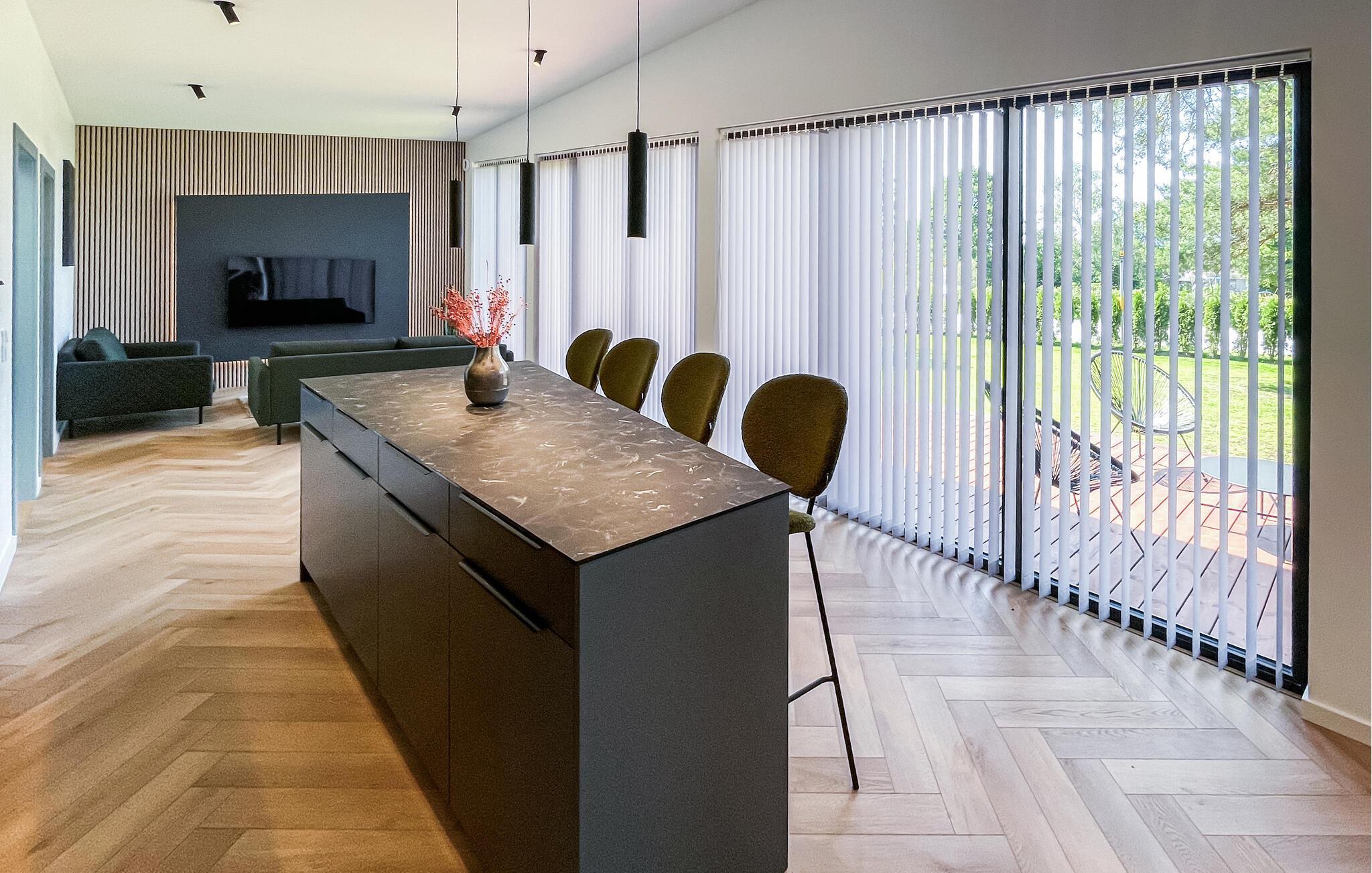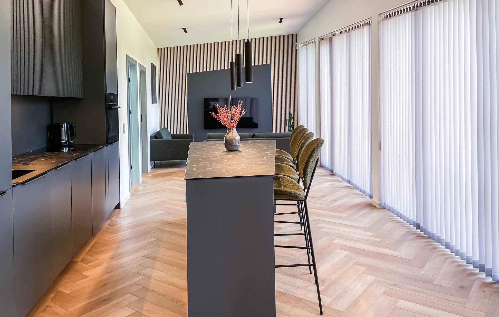 Dette huset ønsker deg velkommen med rene linjer og stilfull design. Store vindusflater slipper inn rikelig med lys og gir deg en vakker utsikt over de grønne omgivelsene. Nyt avslappende timer ved kjøkkenøya med en kaffe eller et glass vin. Eller sett deg godt til rette i de koselige sofaene, enten du vil prate, lese eller se på TV. Hvis du liker å lage mat, har du et moderne kjøkken til din disposisjon.