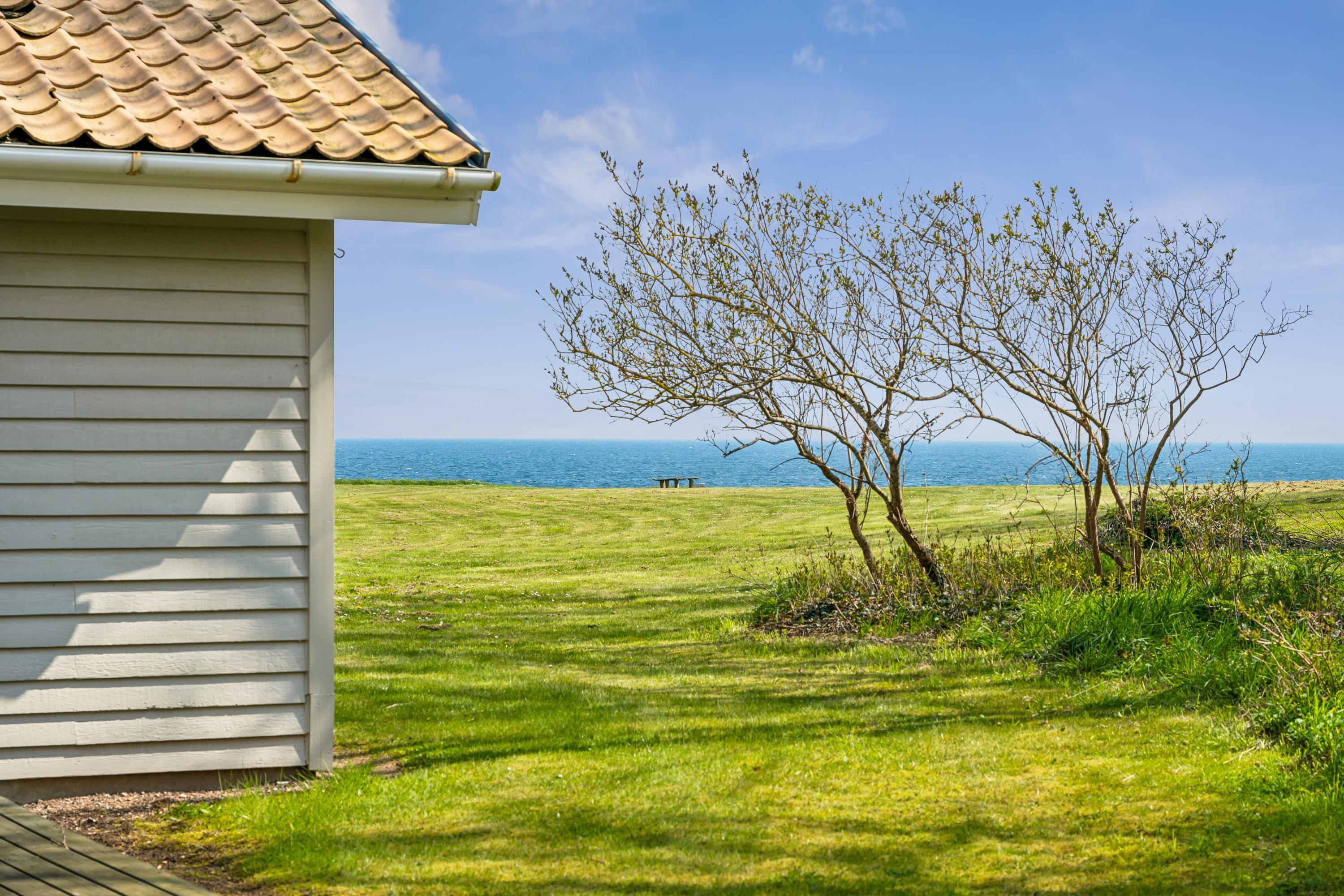 Beautiful and well-furnished holiday home located on a very large, secluded natural lot with fantastic panoramic views of the Kattegat and Hjelm. Two good wooden terraces facing east and west respectively, with garden furniture, loungers, parasol, and a grill, where you can enjoy both the sun and the exceptionally beautiful view. A great house for a large family or two families.
