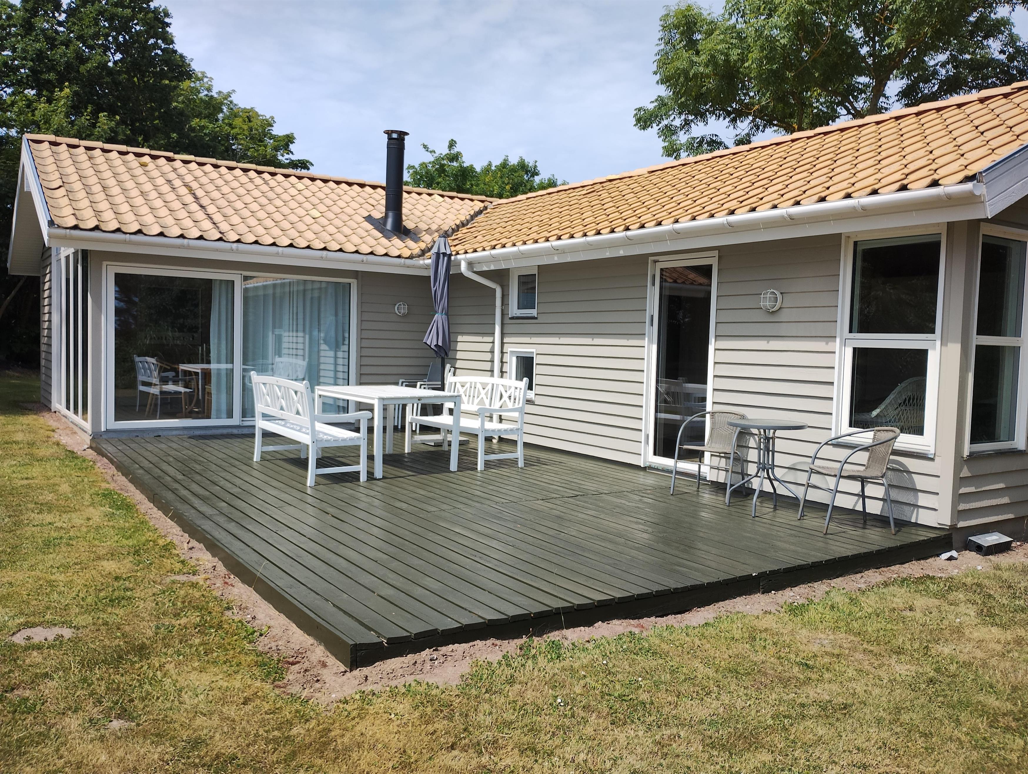 The house is bright and friendly throughout with high ceilings. Large, lovely living room with panoramic windows and access to the terrace, wood stove, and a seating area with TV with Danish (including TV2) and German channels. Two separate dining areas in open connection with a good, spacious kitchen with a stove with ceramic hobs and oven, fridge/freezer, and dishwasher. Two delightful bathrooms with a shower, the larger one also with a cupboard arrangement and a washing machine. The house's 8 sleeping places are distributed in 3 good bedrooms: 1 with a large double bed (180 cm), 1 with a double bed (120 cm), and 1 with a double bed (120 cm) and a good bunk bed. The large bedroom also has access to the terrace. A delightful cottage just 150 meters from a child-friendly beach and close to many activity options.