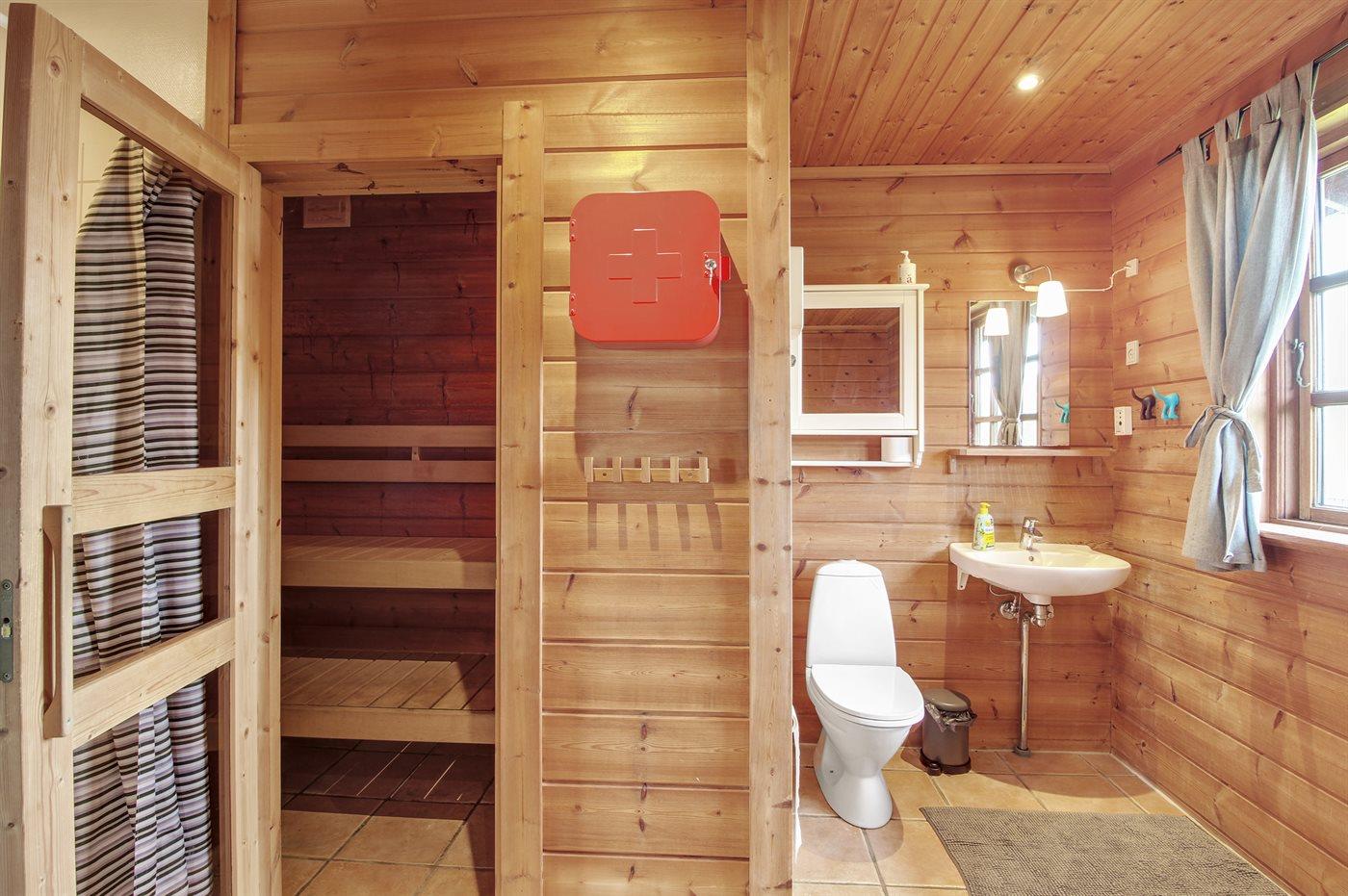 Det er 1 baderom med dusj og 2 toaletter, herav 1 gjestetoalett. Det er varme i gulvet i 1 baderom. I badstuen er det mulighet for å slappe av.