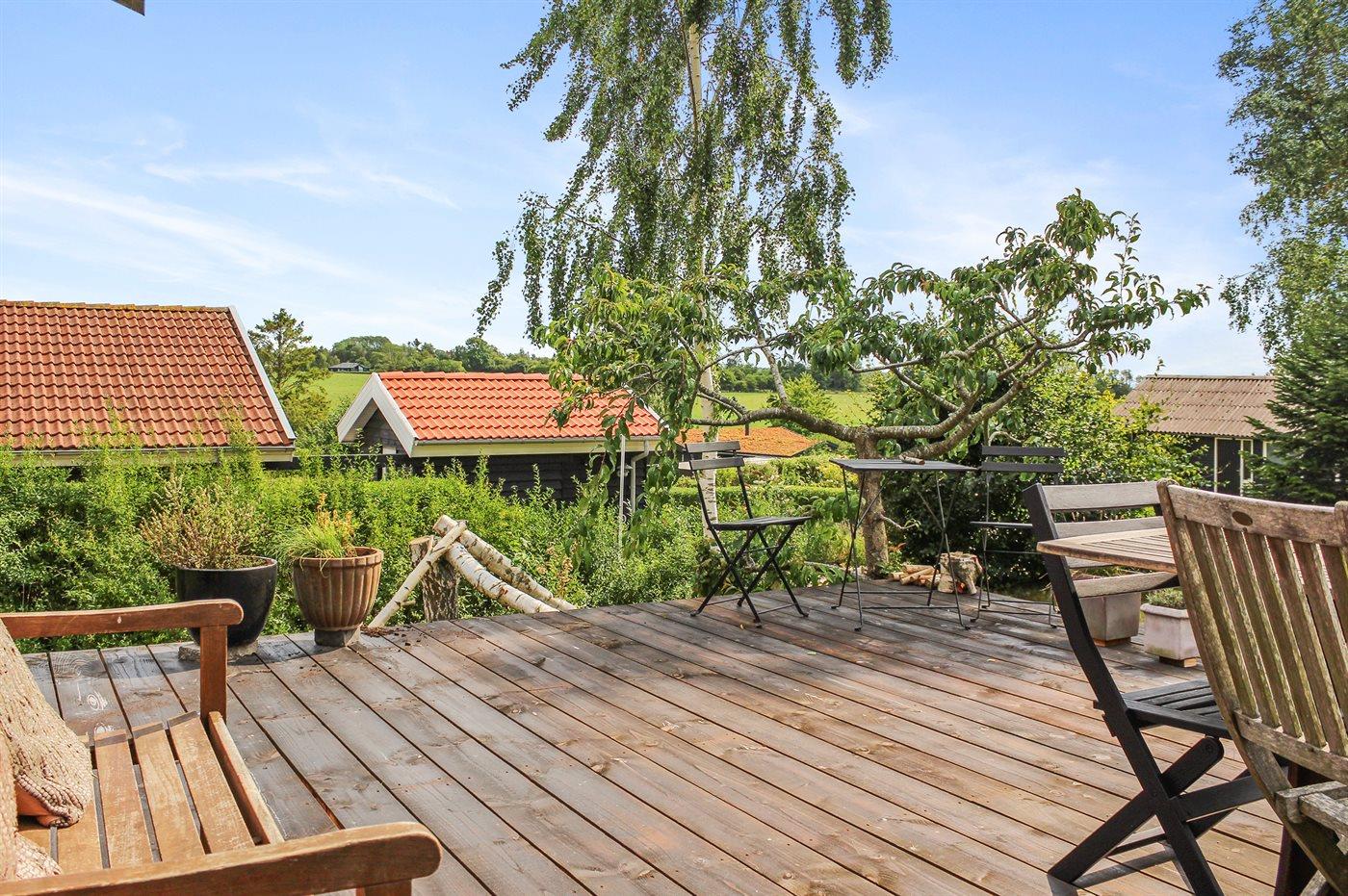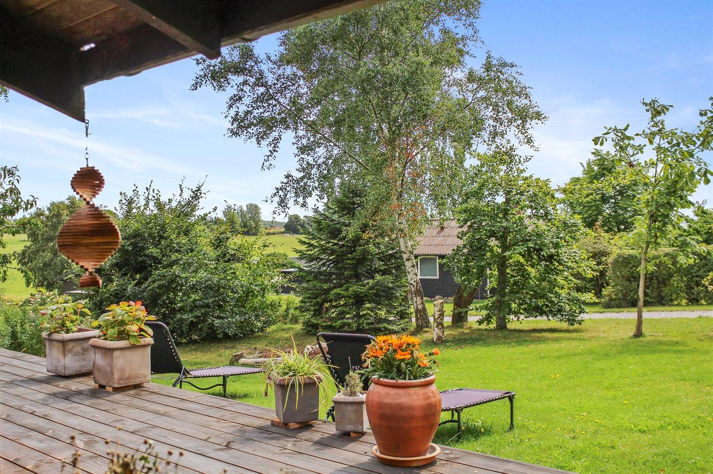 Ferieboligen er beliggende på en 900 m² stor anlagt have. Avstand til hav er 400 m. Nærmeste butikk ligger i en avstand på 1500 m. Golfbane i en avstand på 3000 m. Til ferieboligen hører 25 m² terrasseareal. I tillegg er det 7 m² overdekket terrasse. Det er Redskapsrom. P-plass ved huset.