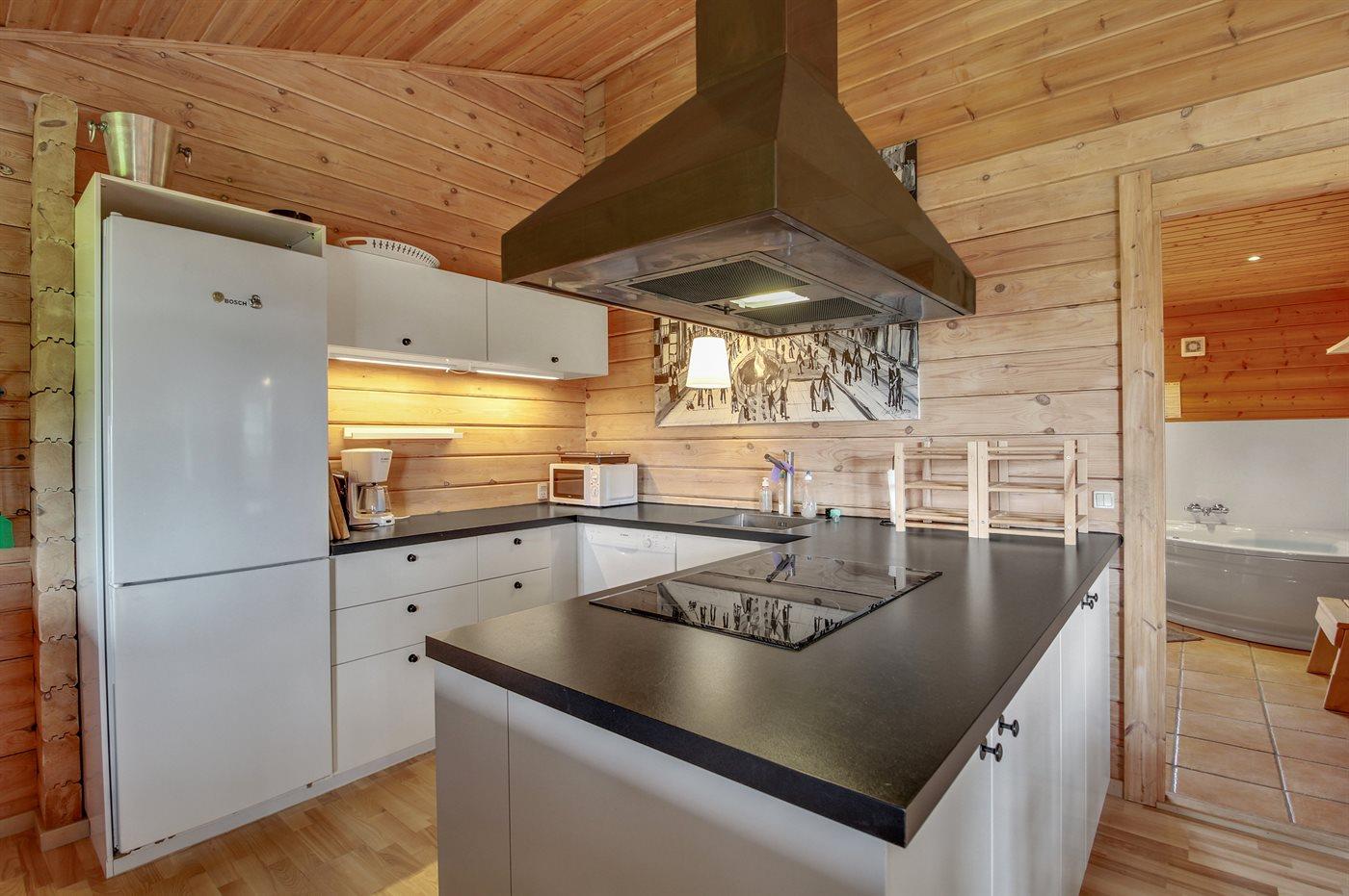 Kjøkkenet er utstyrt med 1 kjøleskap. Det er 4 induksjonskokeplater, varmluftsovn, mikrobølgeovn og oppvaskmaskin.