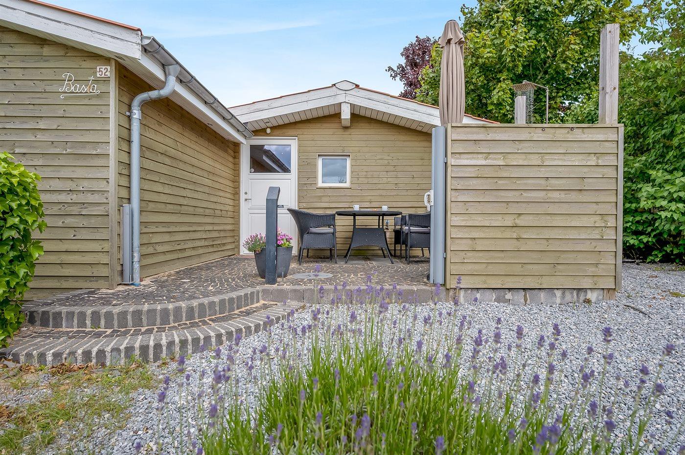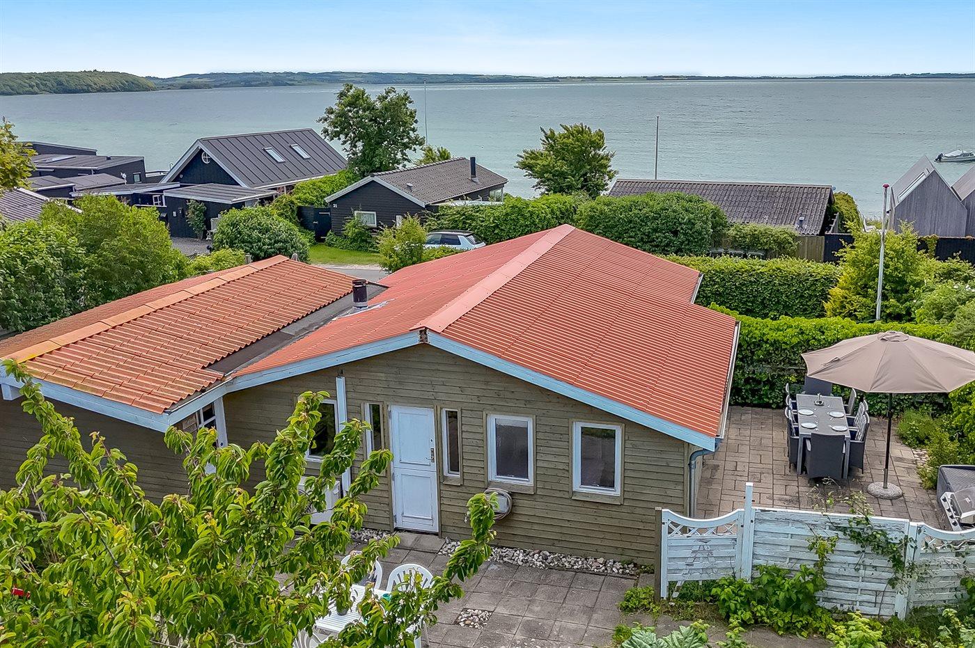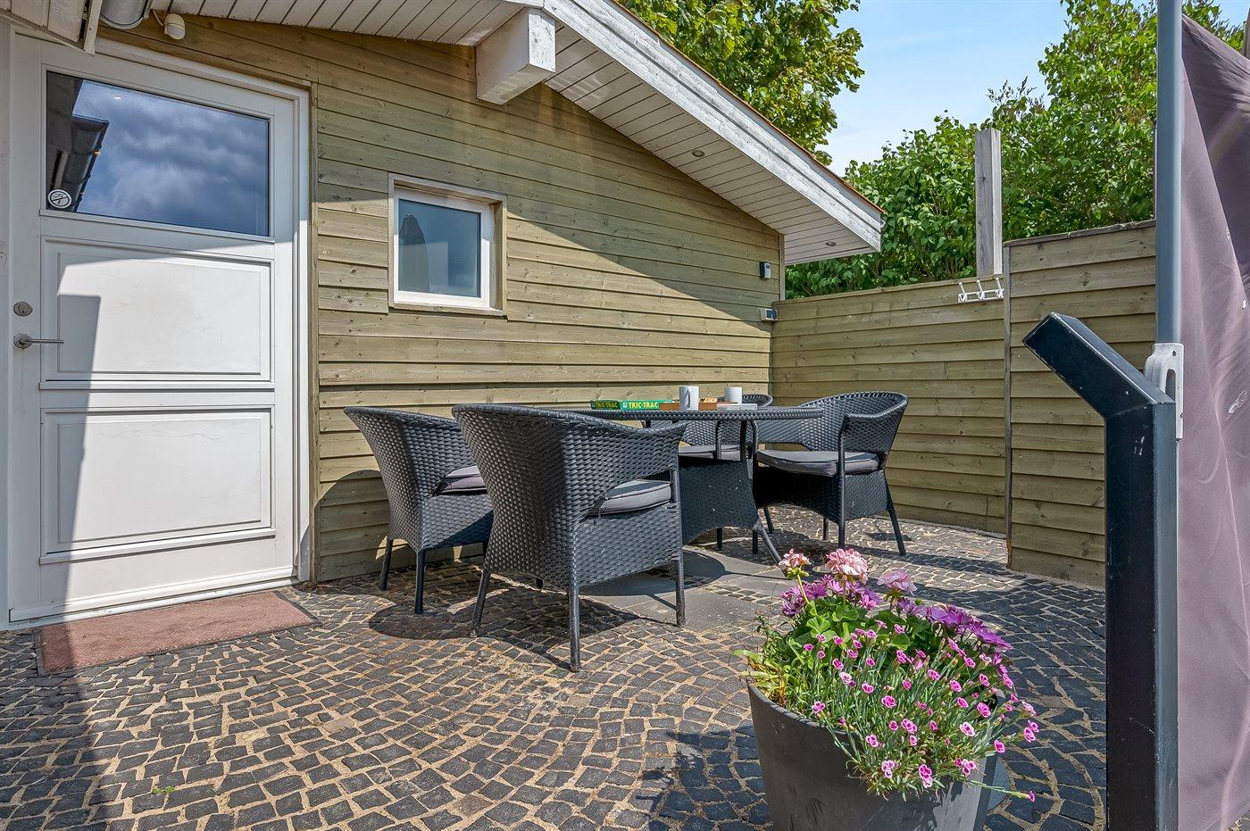 Ferieboligen er beliggende på en 400 m² stor naturtomt. Avstand til hav er 50 m. Nærmeste butikk ligger i en avstand på 2000 m. Til ferieboligen hører åpent terrasseareal. I tillegg er det overdekket terrasse. P-plass ved huset.