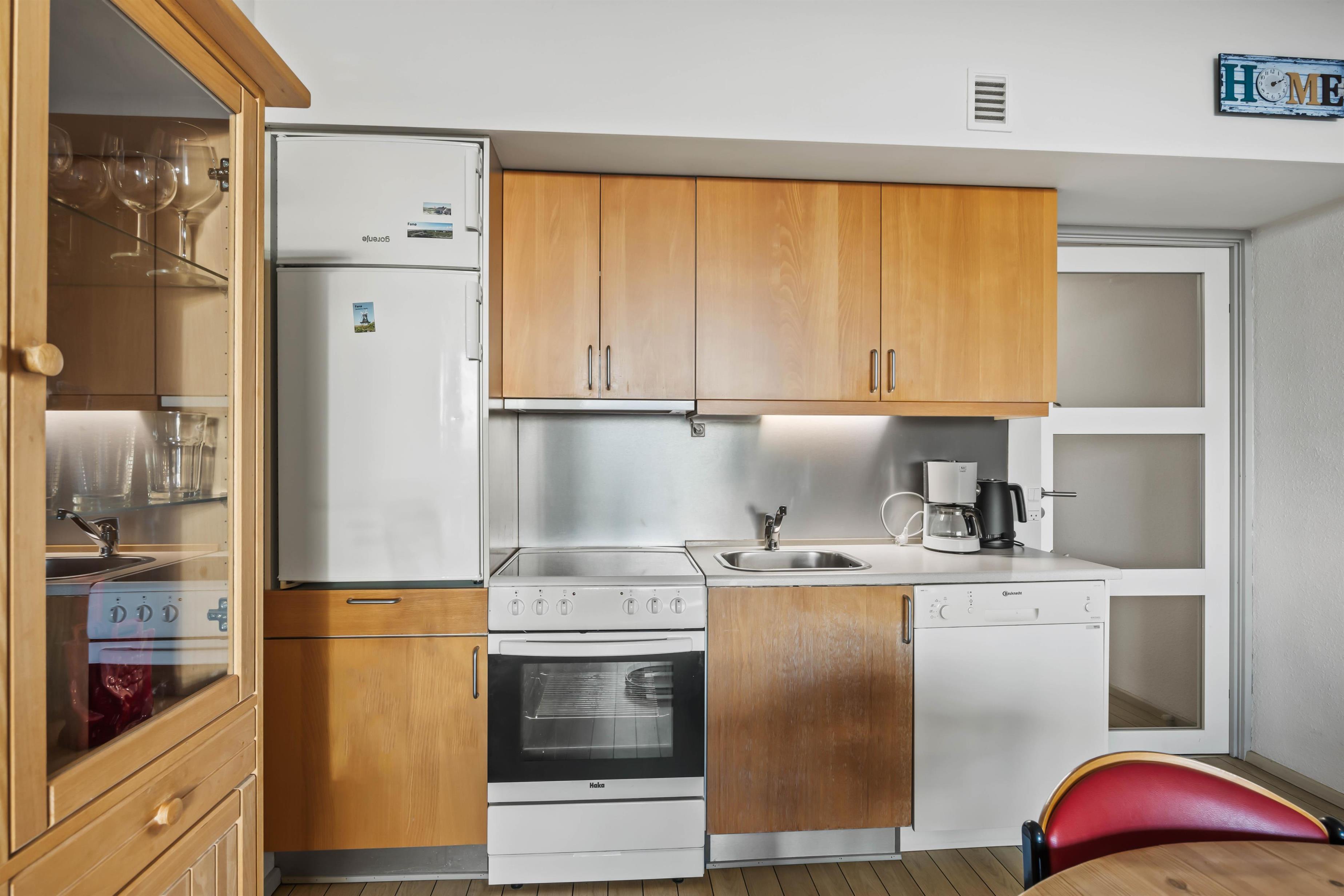 Partially renovated in 2018, this 44-square-metre apartment offers a living room with comfortable furniture, a well-equipped kitchen with microwave and dishwasher, and a cosy dining area. There's also a bathroom with underfloor heating and a bedroom with twin beds.