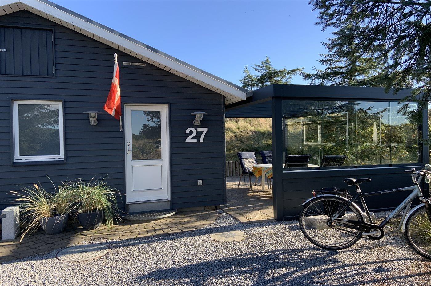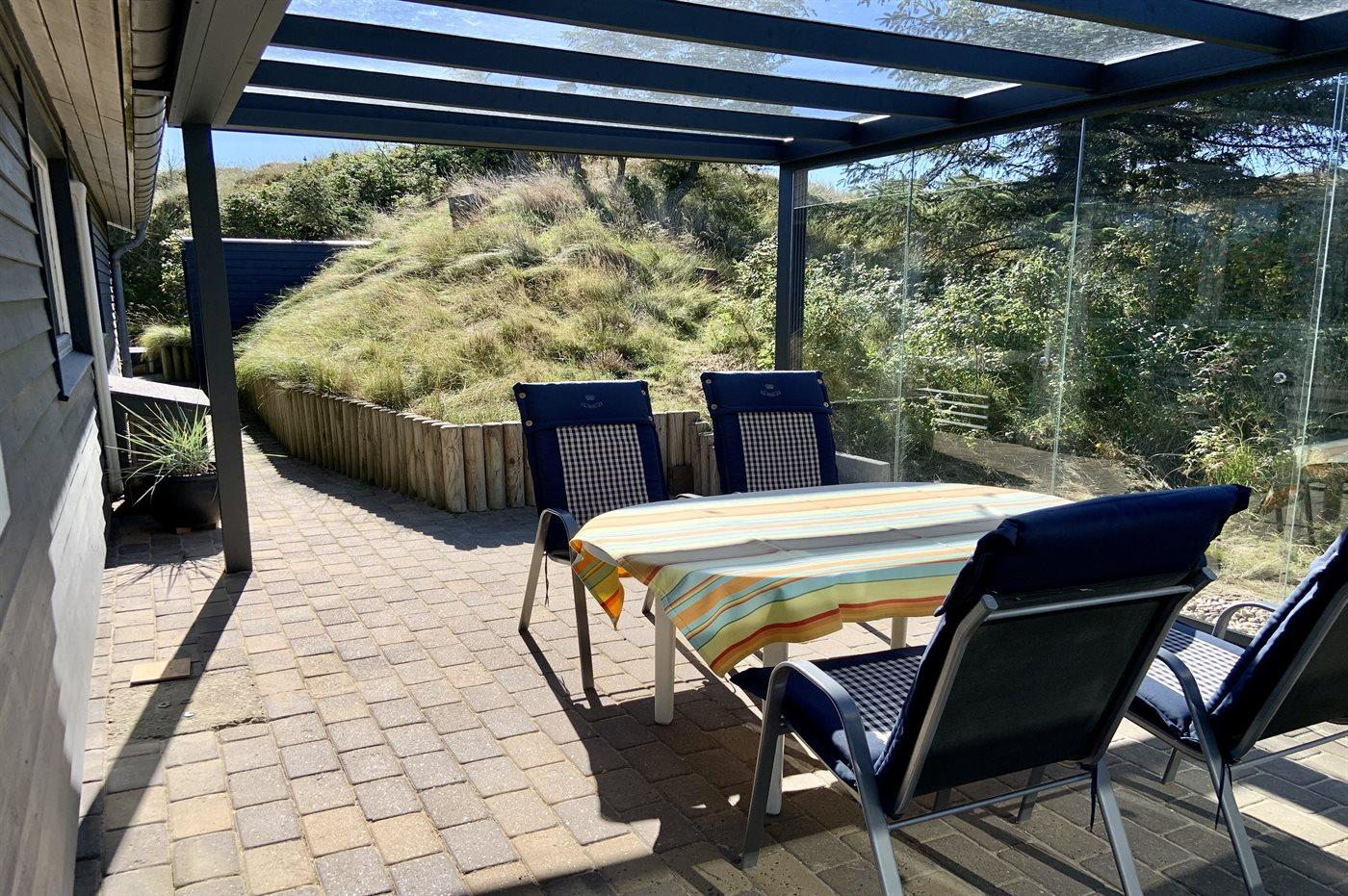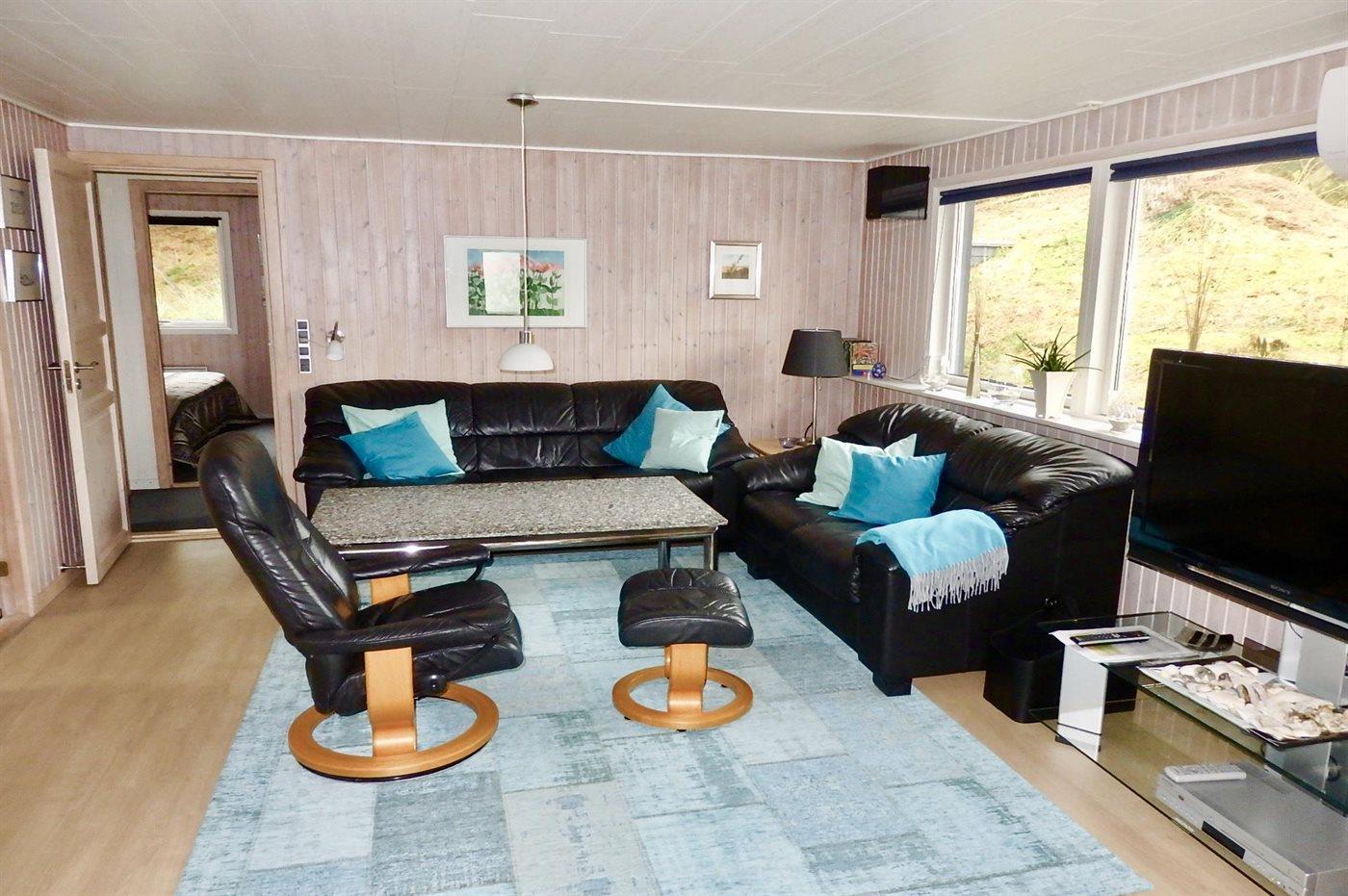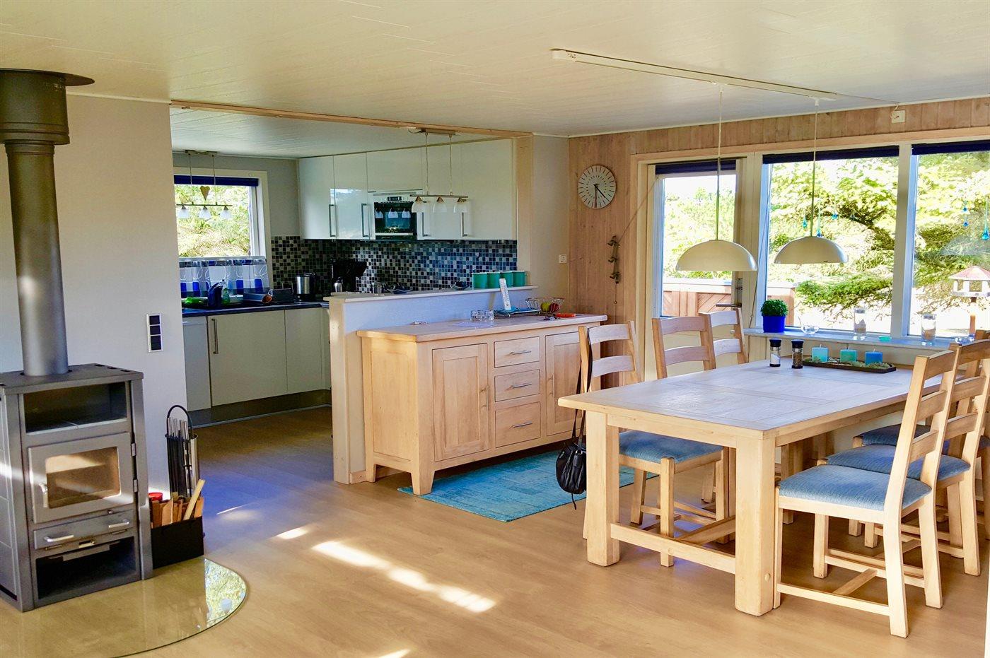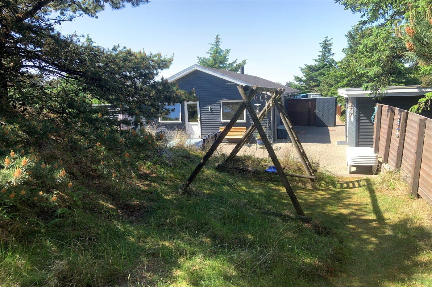 Ferieboligen er beliggende på en 2400 m² stor naturtomt. Avstand til hav er 500 m. Nærmeste butikk ligger i en avstand på 950 m. Til ferieboligen hører 124 m² terrasseareal. I tillegg er det 19 m² overdekket terrasse. Huske. Sandkasse. Utendørs dusj. Det er montert kontakt til lading av elbil ved huset. Ladekontakt type 2. Med 11 kW ladeeffekt. P-plass ved huset.