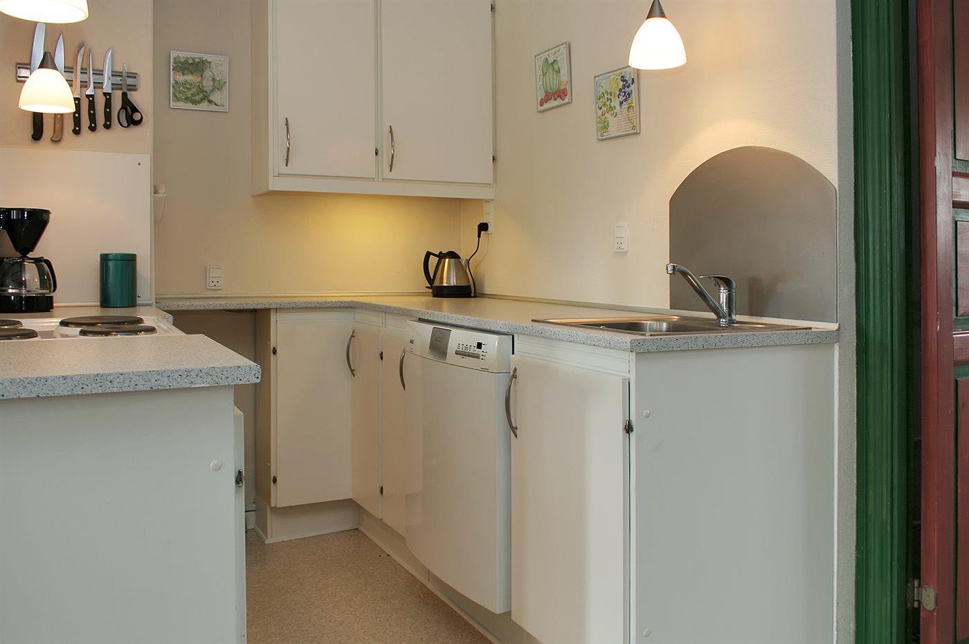 Kjøkkenet er utstyrt med 1 kjøleskap. Det er 4 elektriske kokeplater, stekeovn og oppvaskmaskin.
