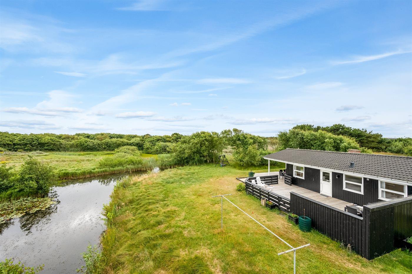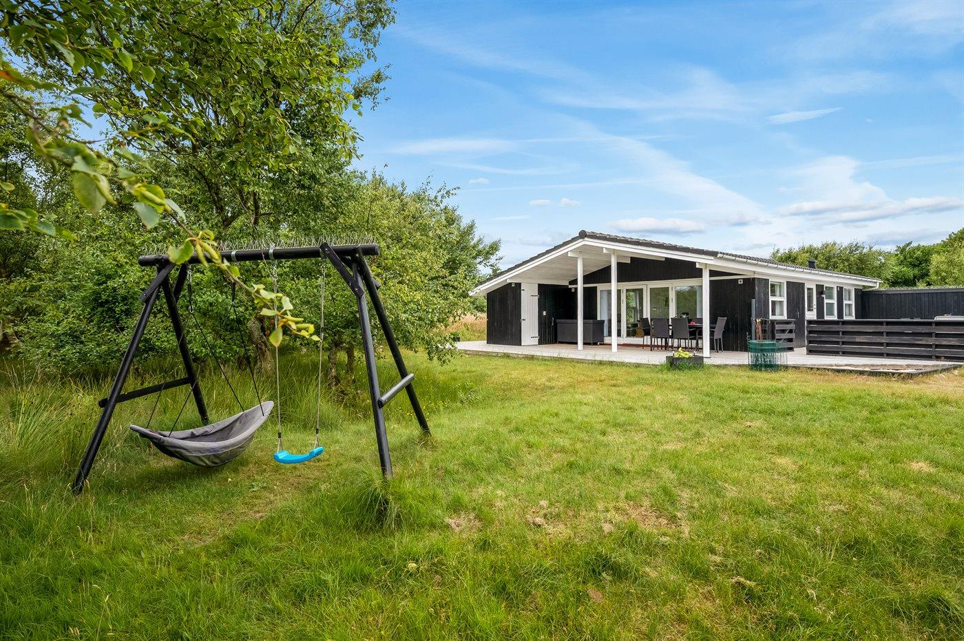 Ferieboligen er beliggende på en 1700 m² stor naturtomt. Avstand til hav er 400 m. Avstand til sjø er 5 m. Nærmeste butikk ligger i en avstand på 1500 m. Golfbane i en avstand på 5000 m. Til ferieboligen hører åpent terrasseareal. I tillegg er det overdekket terrasse. Huske. Sandkasse. P-plass ved huset.