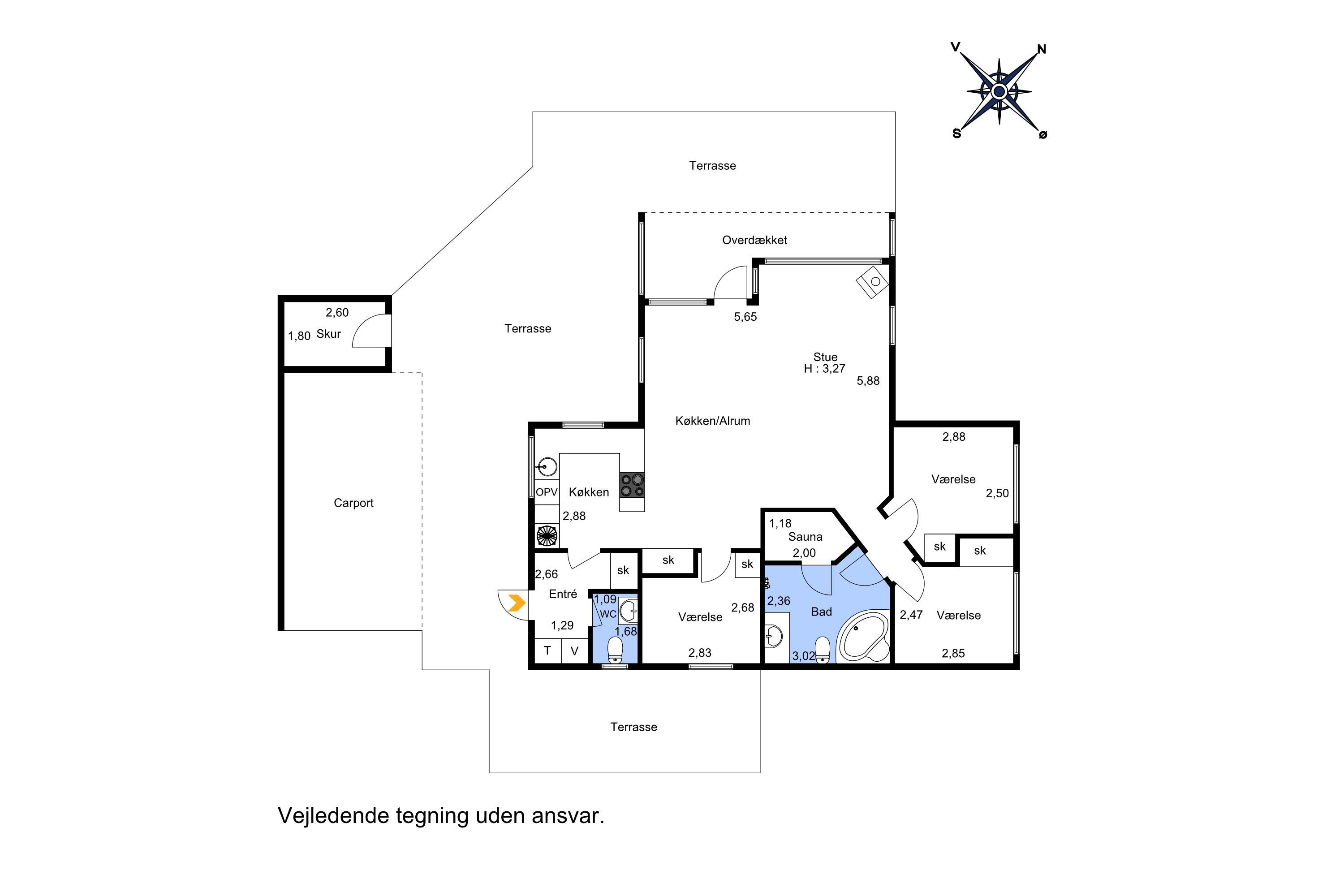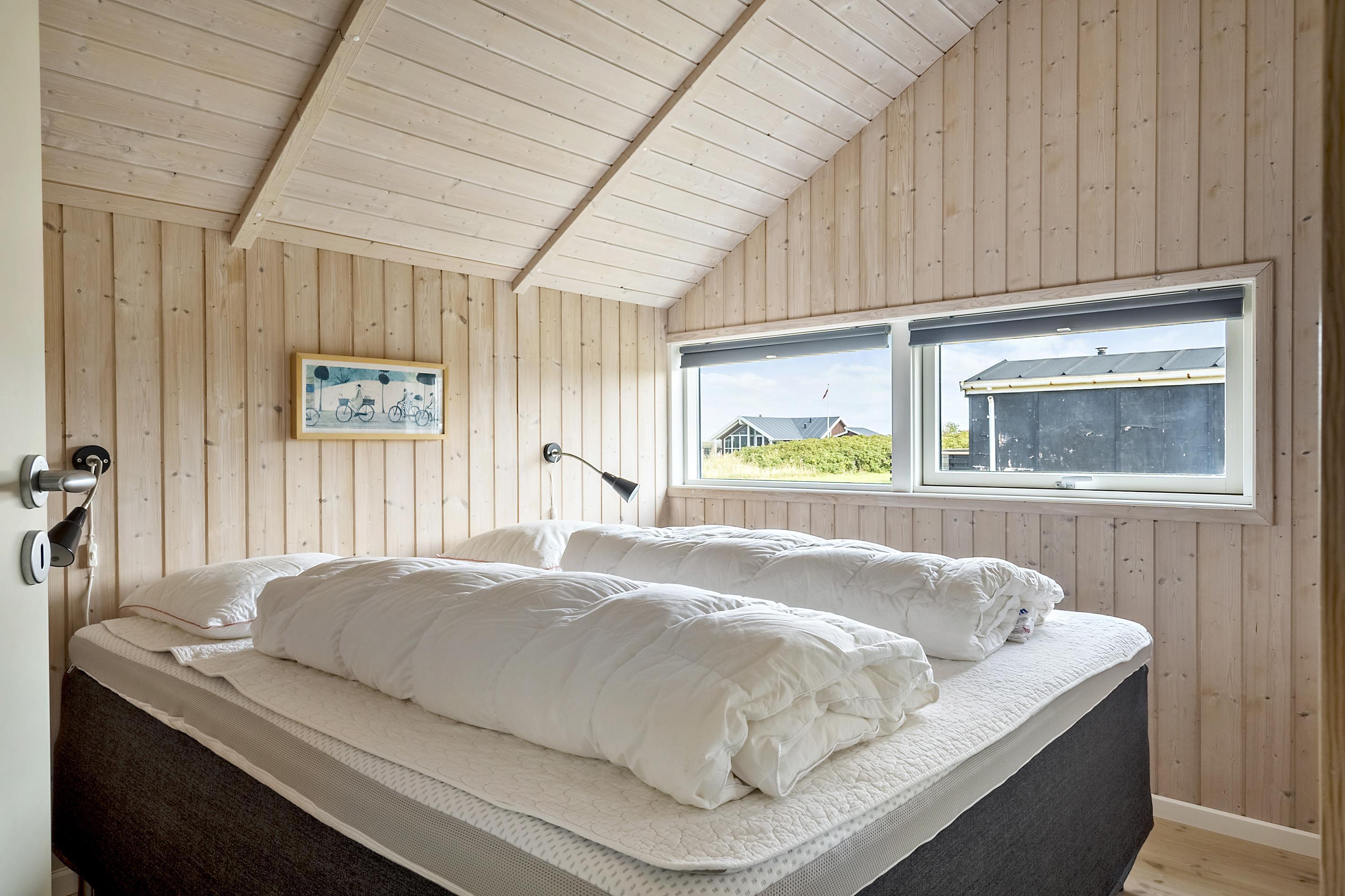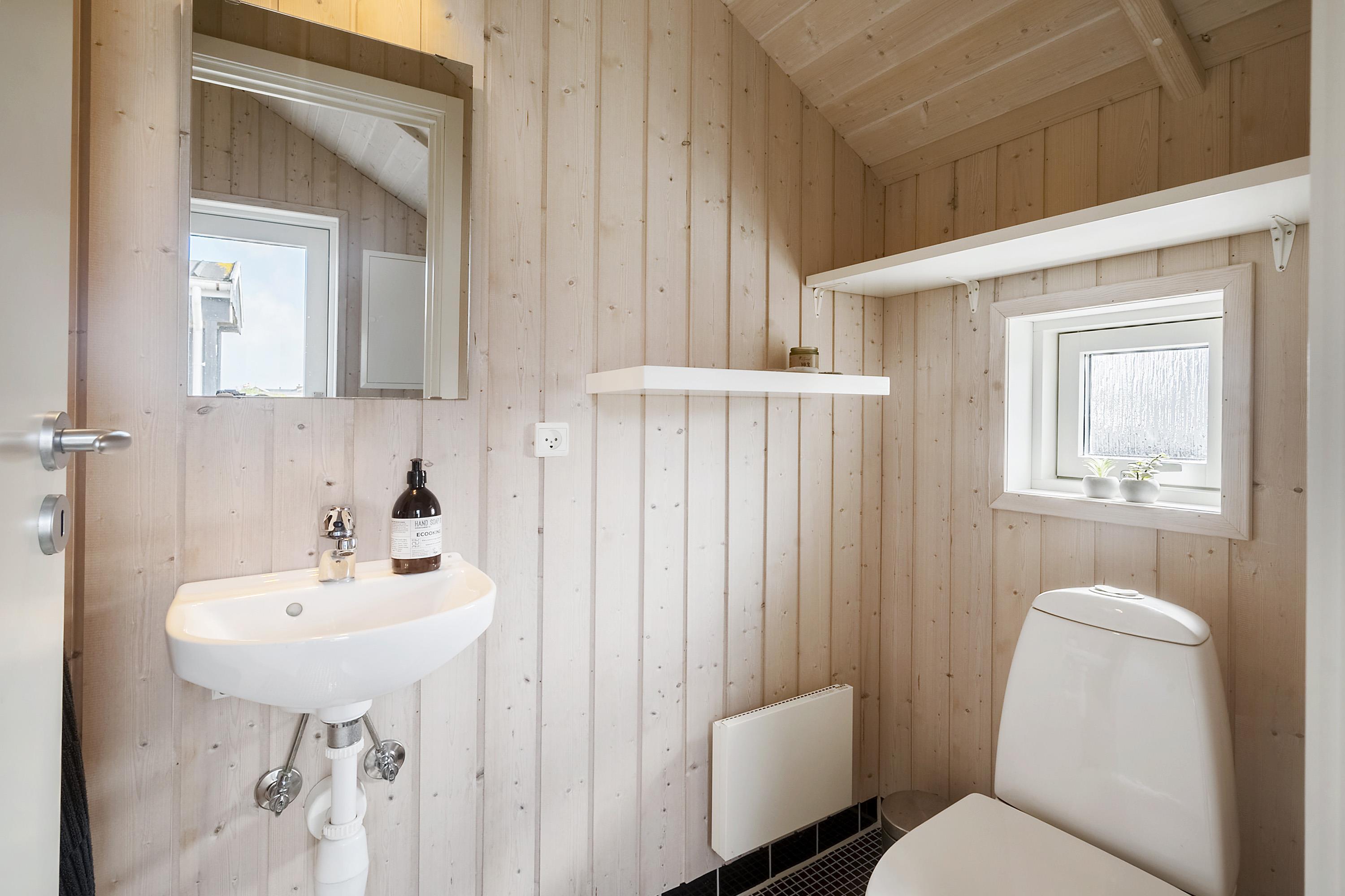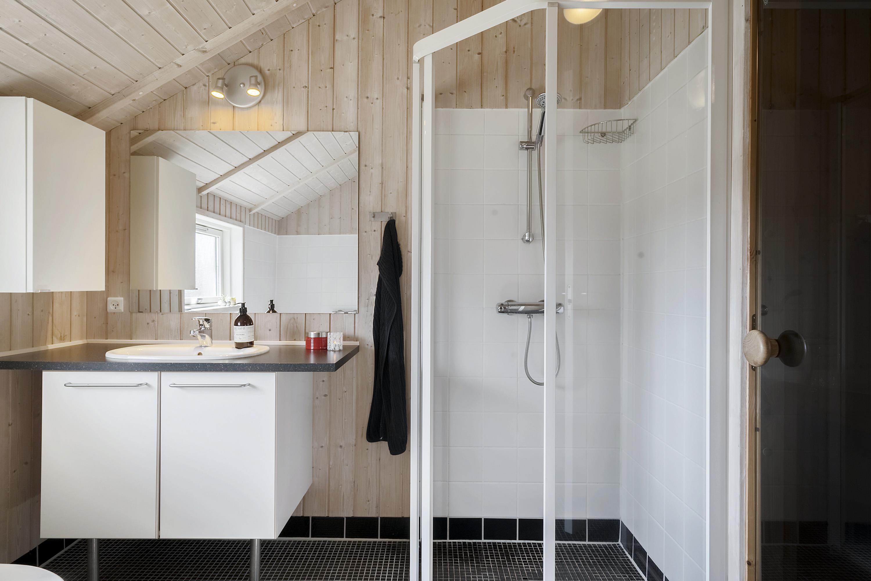 Huset byder på 3 gode soverum (1 dobbeltseng, 1 dobbeltseng og 2 enkeltsenge) samt 2 badeværelser, begge med toilet og håndvask. Det store badeværelse er ren wellness med bruser, spabad og sauna, og der er gulvvarme i begge badeværelser – perfekt året rundt.