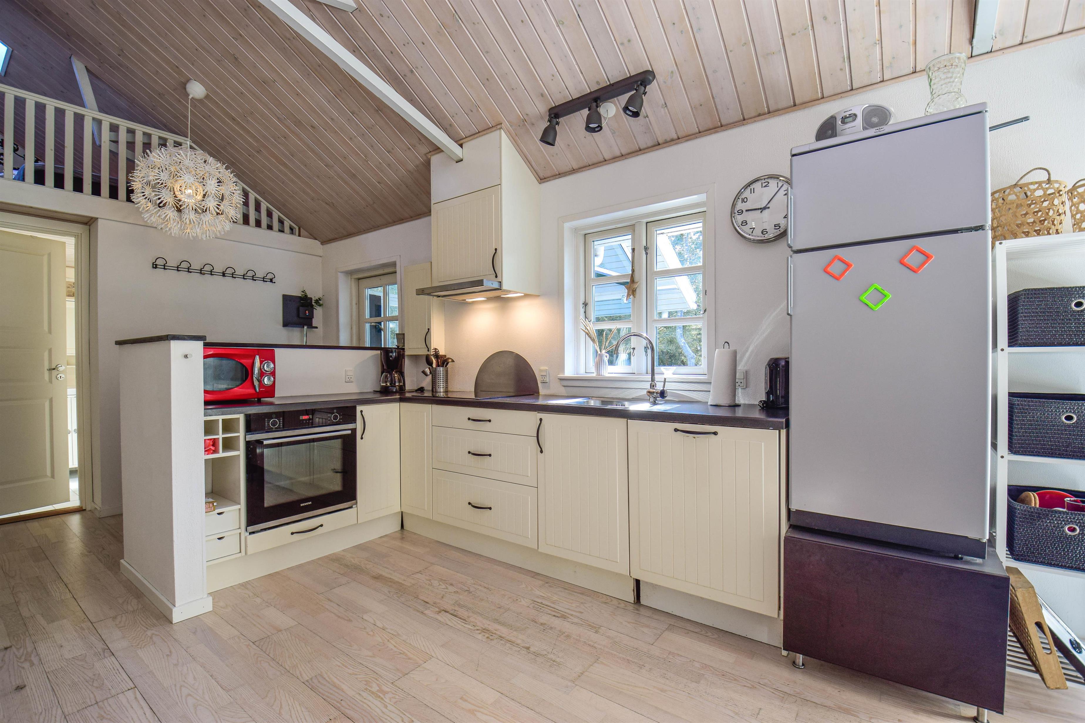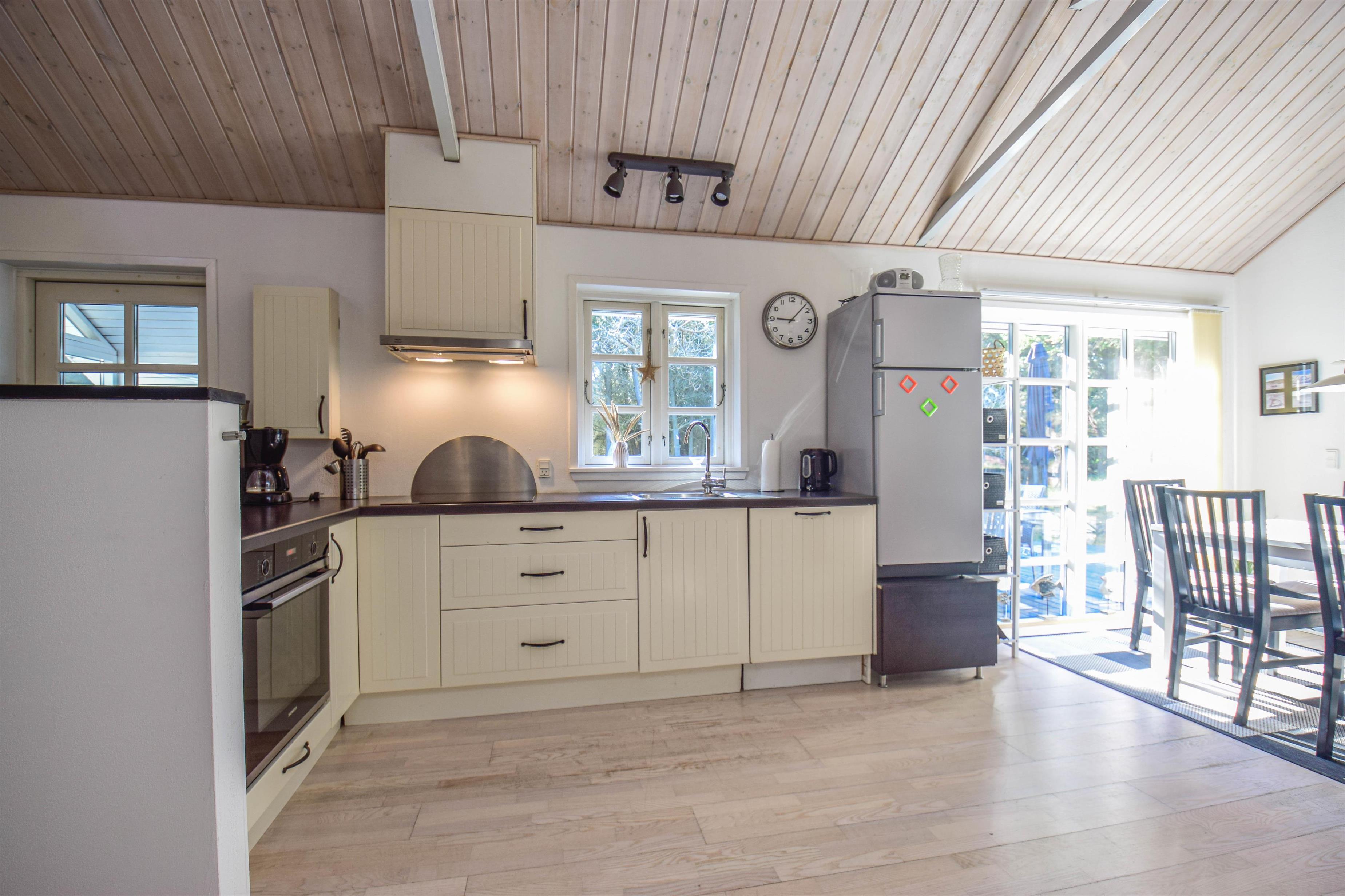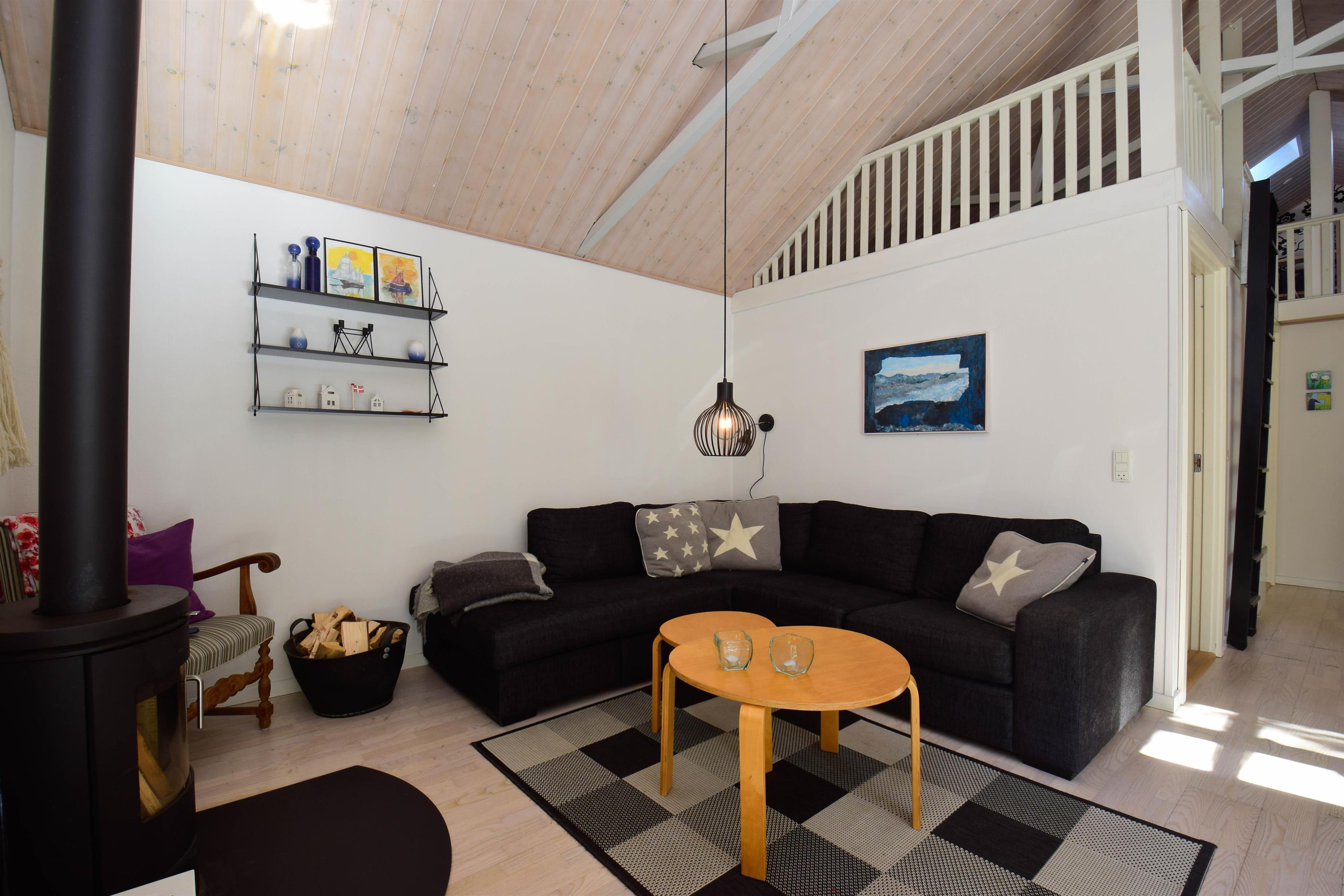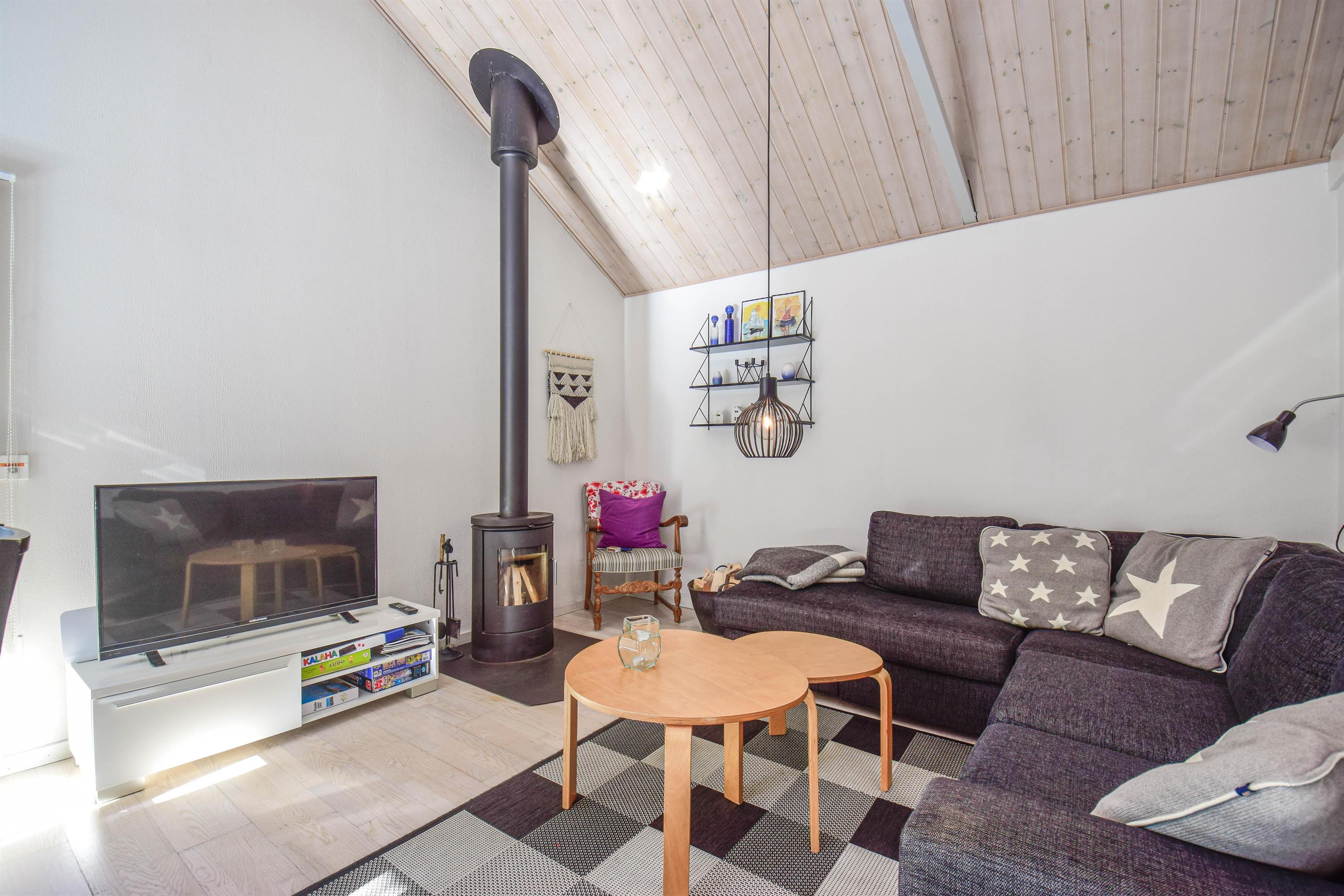 Die Küche ist gut ausgestattet mit Geschirrspüler und viel Arbeitsfläche, und im gemütlichen Wohnbereich sorgen Kaminofen und bequeme Sofas für echte Hygge-Stimmung.