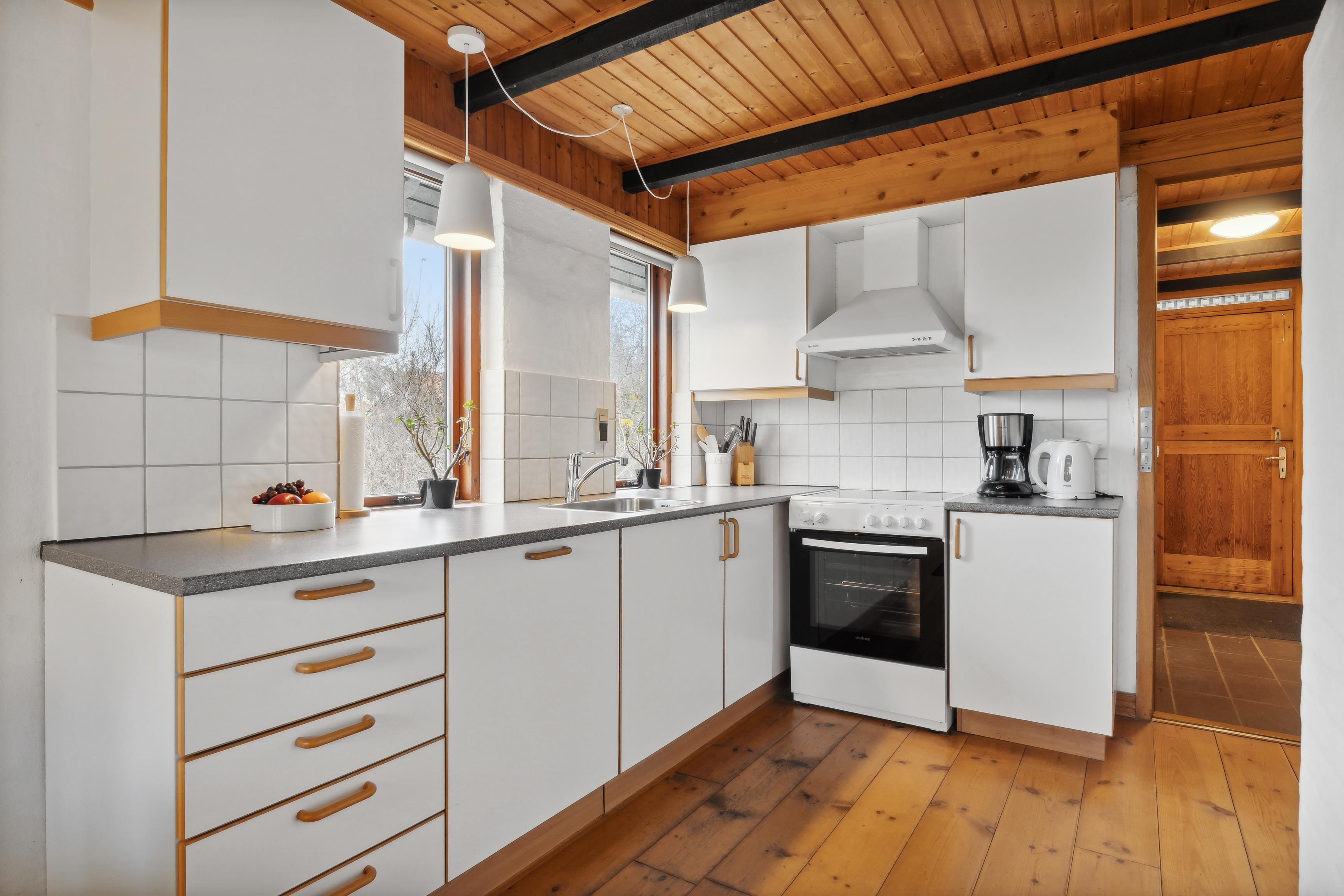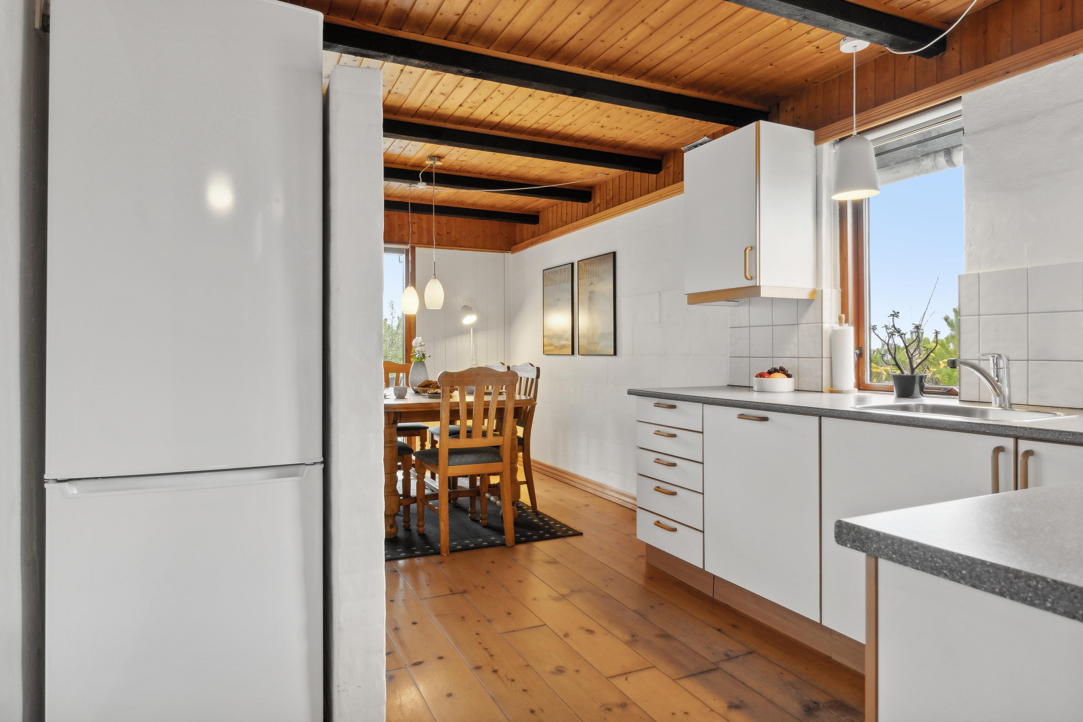 Ground Floor: The house features a spacious entrance hall with plenty of space for shoes and outerwear. The bathroom is older but functional, equipped with a shower. There is a bedroom with wooden floors and newer beds for added comfort. The kitchen is neat and practical, offering ample counter space and a dishwasher. It connects openly to the living room, which includes a dining area, wood-burning stove, TV, and a cozy seating area. Both the kitchen and the living room offer stunning views of Nissum Fjord.