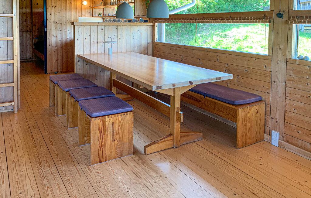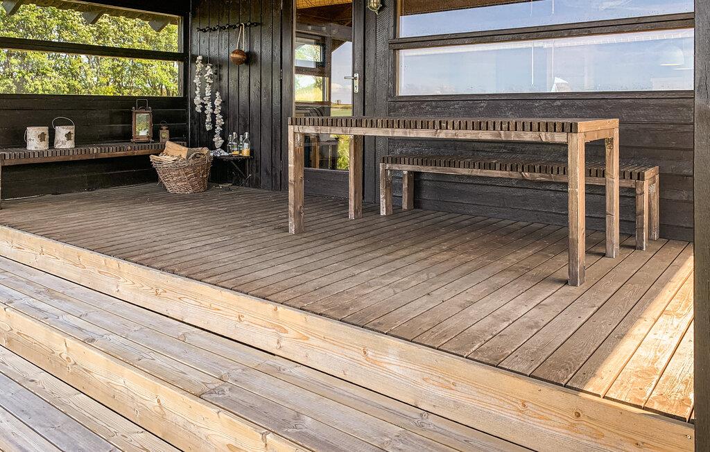 Bruk den romslige terrassen til å sole deg eller slappe av med en bok i en solstol. Den delvis overbygde treverandaen gir ly på vindfulle dager og er ideell for frokost eller middag under åpen himmel. Den naturlige hagen med enkle uteserveringer føyer seg harmonisk inn i omgivelsene.