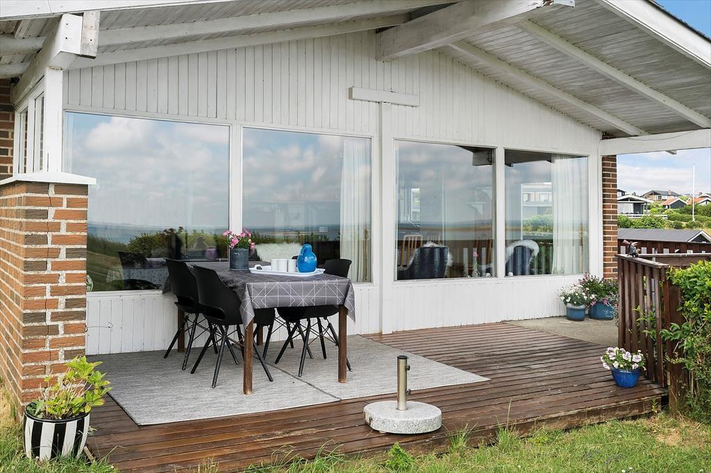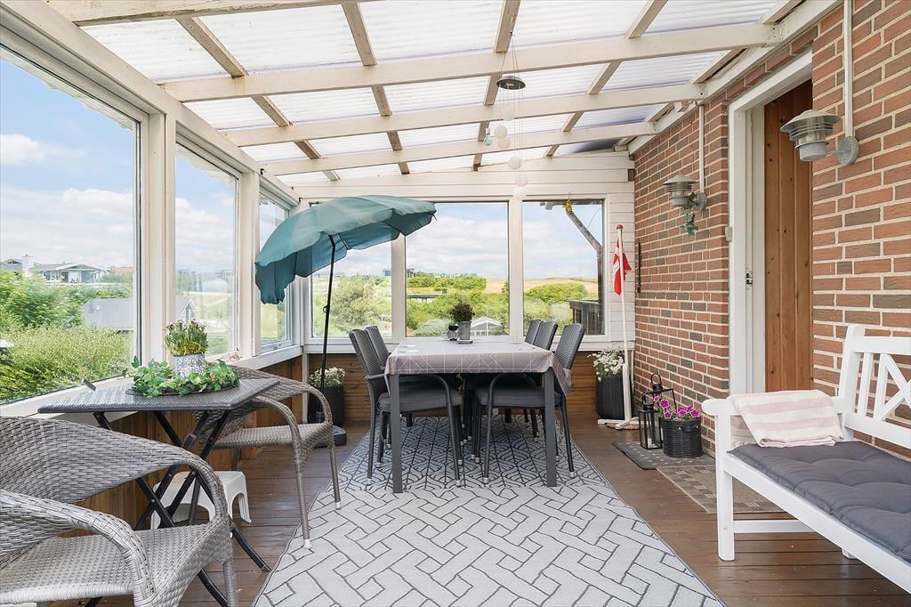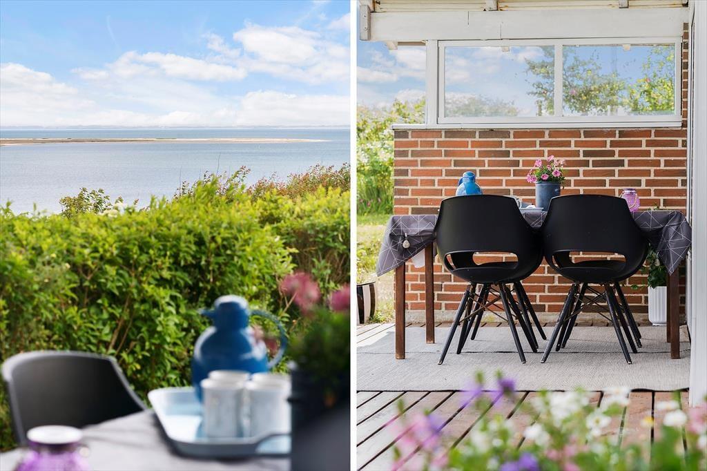 Die Lage direkt am Wasser entfaltet ihre ganze Wirkung, sobald du auf die geschützte Terrasse trittst. Hier herrscht fast Wintergarten-Stimmung – mit Schutz vor Wind und Wetter, aber dennoch offen zur Natur und zur frischen Fjordluft. Du kannst hier trocken und gemütlich mit einer Tasse Tee sitzen, auch wenn sich Wolken zusammenziehen, oder deine Mahlzeiten unter freiem Himmel genießen, wenn die Sonne lacht. Mit dem Fjord als unmittelbarem Nachbarn bietet sich ein stiller Spaziergang entlang des Wassers an, ein kurzes Bad im klaren Wasser des Limfjords oder einfach das Lauschen der sanften Wellen. Die Terrasse schenkt dir sowohl Privatsphäre als auch Weitblick – ideal zum Abschalten mit einem Buch oder einem Glas Wein im Sonnenuntergang.