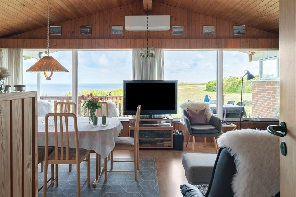 Im Inneren des Hauses auf Violvej 92 empfängt dich eine warme und authentische Atmosphäre, in der du dich sofort wohlfühlen und fallen lassen kannst. Das Wohnzimmer wirkt behaglich und einladend, und der Kaminofen in der Ecke sorgt für wohlige Wärme und eine stimmungsvolle Kulisse, wenn der Wind draußen weht oder der Regen sacht an die Scheiben klopft. Von hier hast du direkten Blick auf den Fjord durch große Fensterfronten – ein Panorama, das zum Träumen einlädt. Küche und Essbereich gehen fließend ineinander über, was das Zusammensein besonders angenehm macht – sei es beim Frühstück, Nachmittagskaffee oder einem gemütlichen Kartenspiel am Abend. Das gesamte Haus strahlt klassischen dänischen Ferienhaus-Charme aus – der perfekte Ort, um unvergessliche Erinnerungen mit den Liebsten zu schaffen.