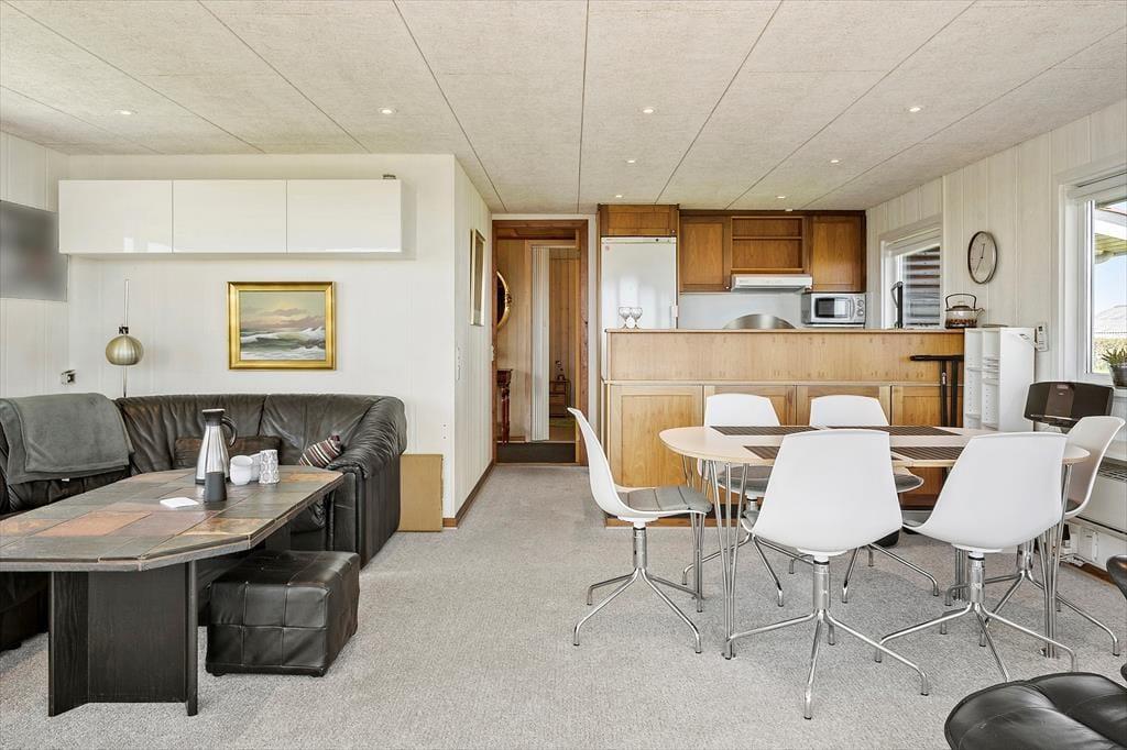 Wenn du das Ferienhaus betrittst, empfängt dich eine angenehme und helle Atmosphäre, bei der jedes Detail darauf ausgerichtet ist, den perfekten Rahmen für einen erholsamen Urlaub zu schaffen. Die hellen Farben und die schlichte, aber gemütliche Einrichtung verleihen dem Haus einen luftigen und freundlichen Charakter – es ist ganz leicht, sich hier zuhause zu fühlen. Küche und Wohnzimmer sind offen miteinander verbunden, sodass du viel Zeit mit deinen Liebsten verbringen kannst – beim gemeinsamen Kochen oder beim Spielen am Esstisch. Die großen Fenster lassen viel Licht herein und schenken dir einen herrlichen Blick über die hügelige Landschaft und den Fjord. Vom Wohnzimmer aus gelangst du direkt in den Garten und auf die Terrasse – hier gehen Innen- und Außenbereich nahtlos ineinander über. Es ist ein Ort für Ruhe und Nähe – egal ob du zu zweit, mit Kindern oder guten Freunden unterwegs bist.