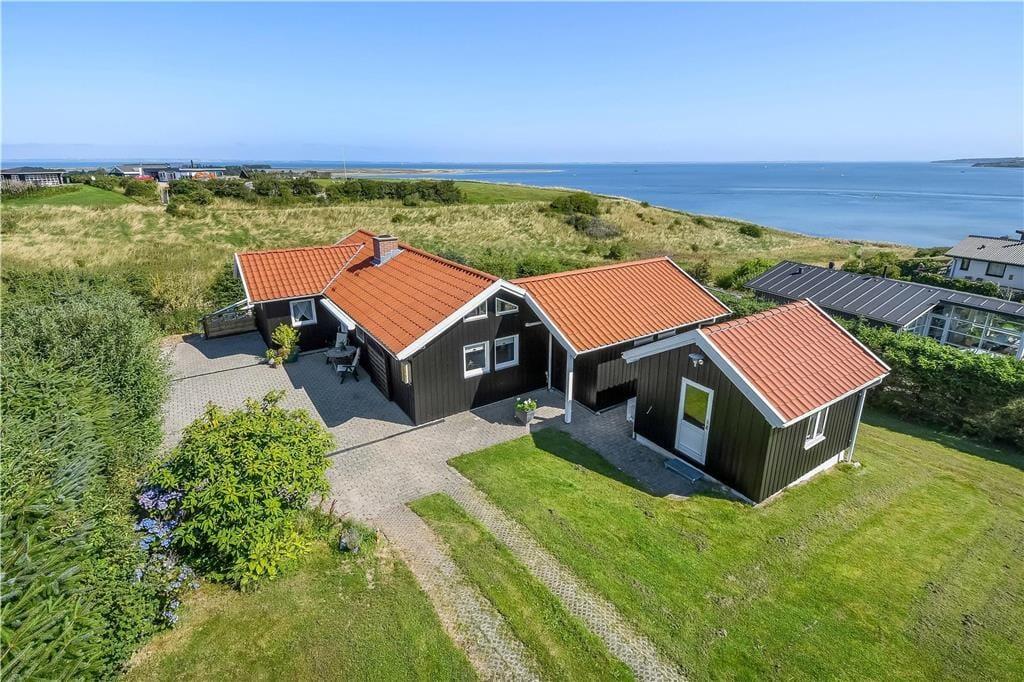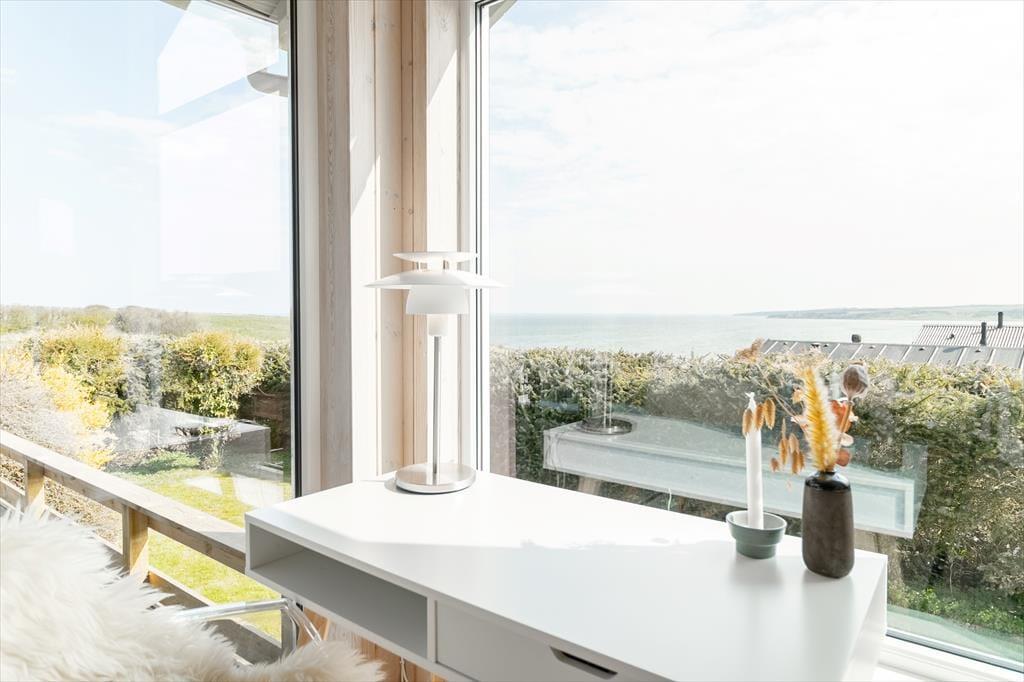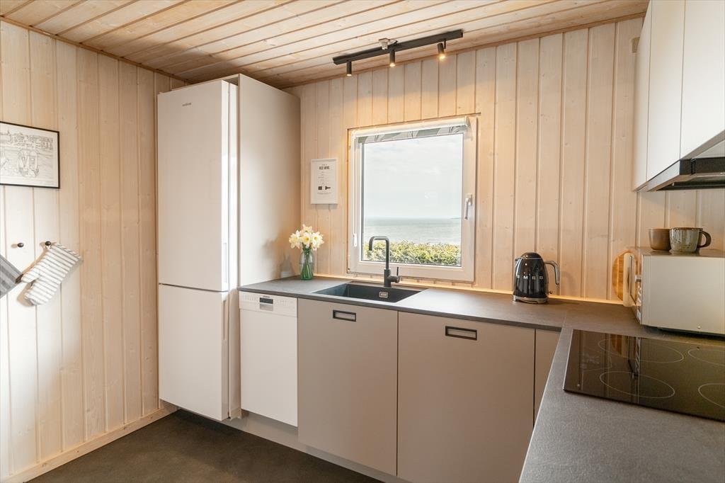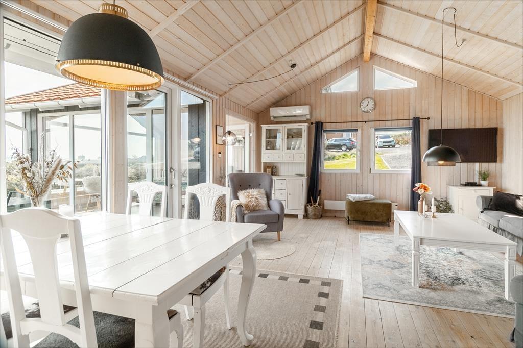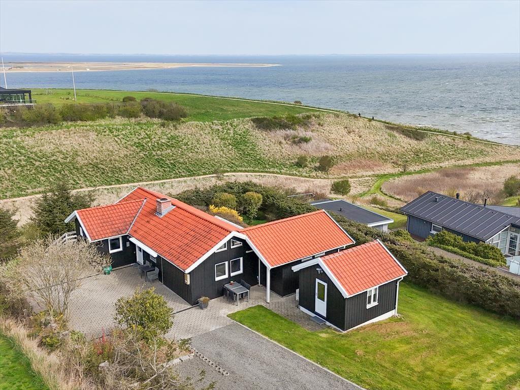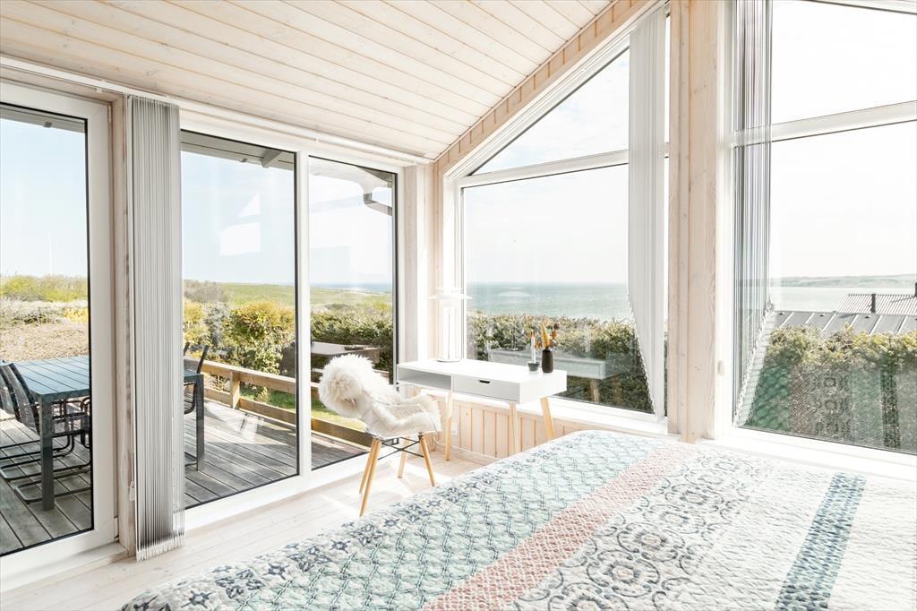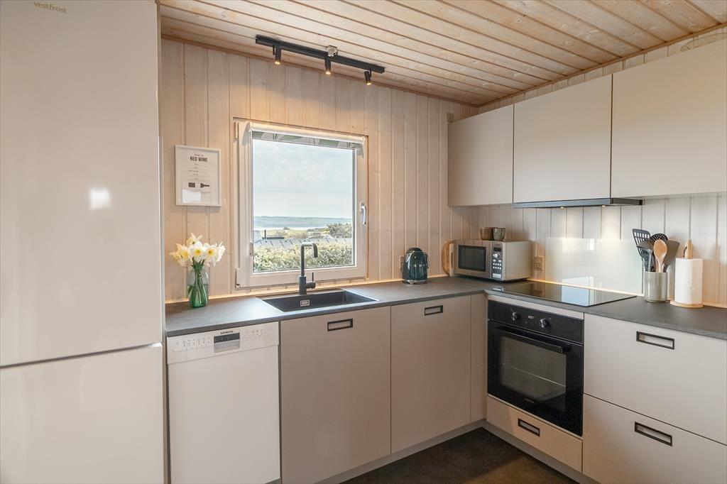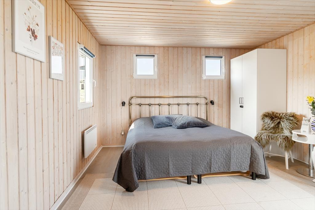 Beim Betreten des architektonisch gestalteten Ferienhauses ist das Erste, was du bemerkst, das Licht – und die Stille. Das Haus wurde behutsam renoviert, mit großem Respekt für die ursprüngliche Architektur, und strahlt durchgehend hohe Qualität aus. Große Panoramafenster bieten einen fantastischen Blick auf den Limfjord und lassen sowohl Tageslicht als auch die faszinierende Landschaft direkt ins Wohnzimmer strömen. Hier spürst du sofort die Liebe zum Detail: Vom offenen und einladenden Wohnbereich, in dem der Kaminofen an kühlen Abenden gemütlich knistert, über die zwei Schlafzimmer und das charmante Annex, die jeweils mit Doppelbetten sowie Privatsphäre und Komfort überzeugen. Im Master Bedroom erwartet dich zudem eine atemberaubende Aussicht – der perfekte Ort, um langsam aufzuwachen und den Blick über das glitzernde Wasser schweifen zu lassen. Die neue, offene Küche ist harmonisch in den Wohnbereich integriert und bildet den natürlichen Rahmen für gemeinsames Kochen, Zusammensein und Brettspiele, während die Wärmepumpe stets für die richtige Temperatur sorgt. Das Badezimmer ist mit allem Nötigen ausgestattet, einschließlich einer praktischen Wasch-Trocken-Kombination, sodass auch der Alltag im Urlaub mühelos funktioniert.