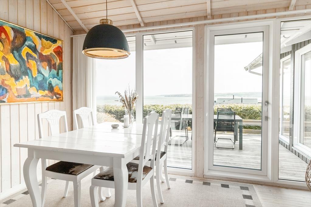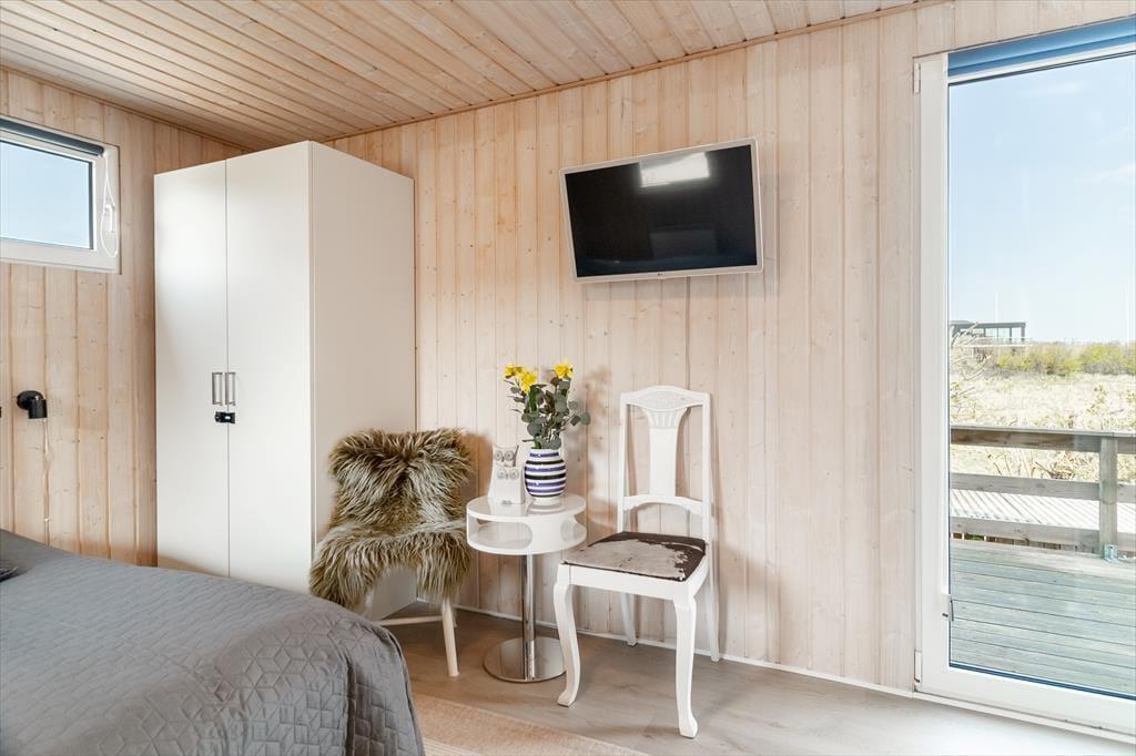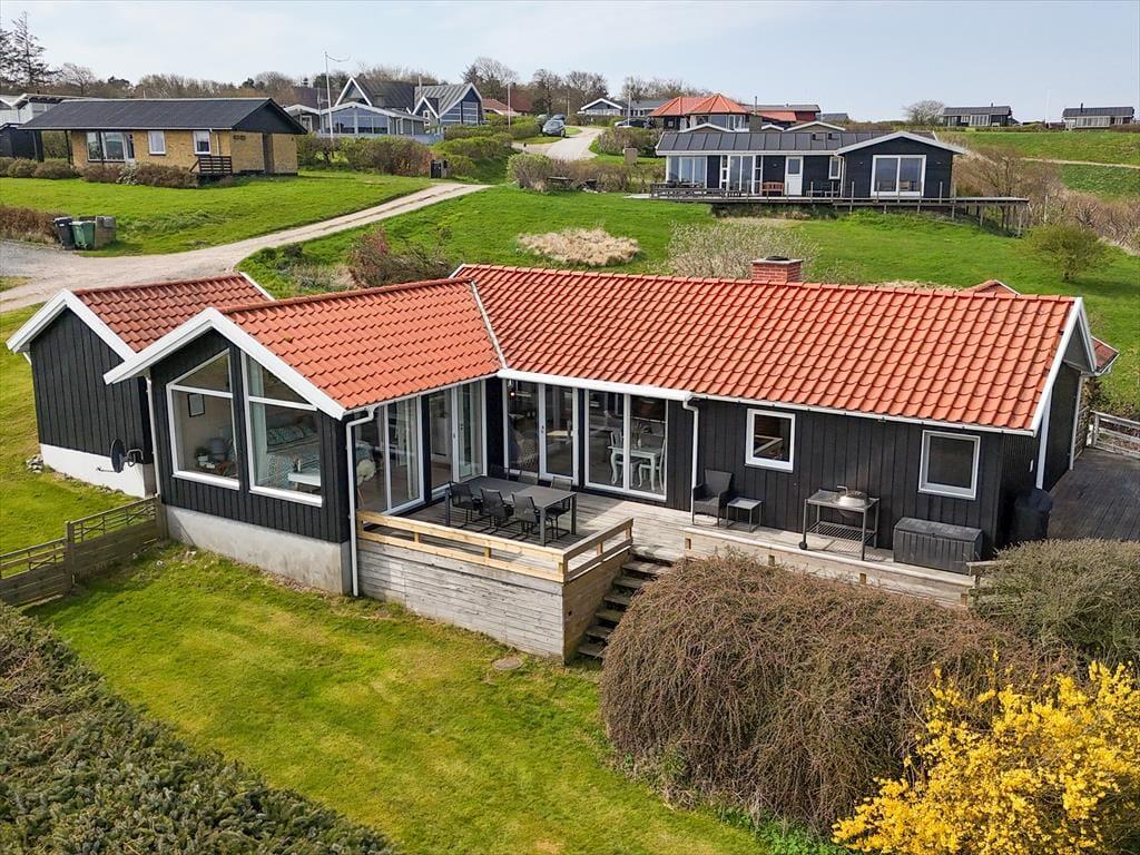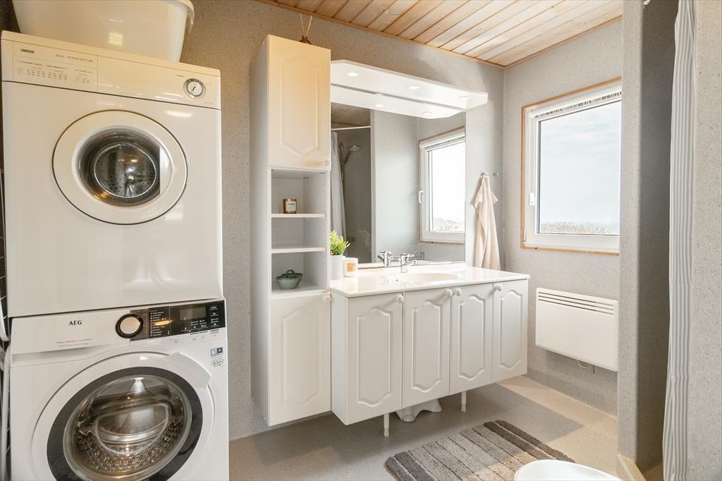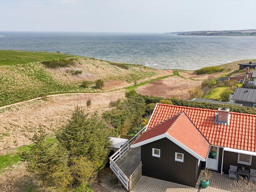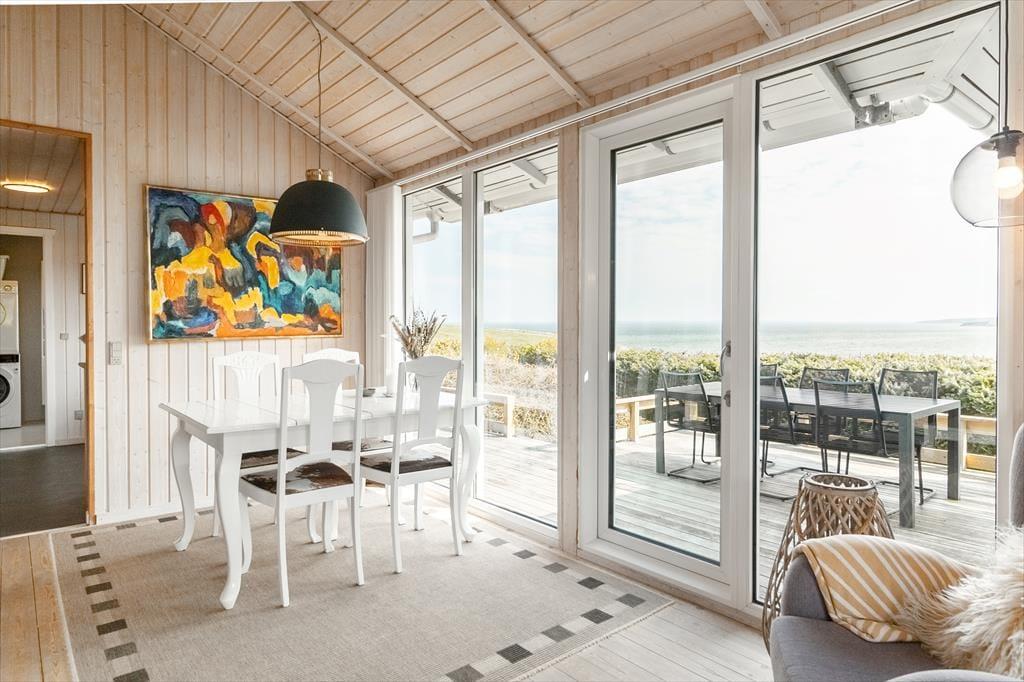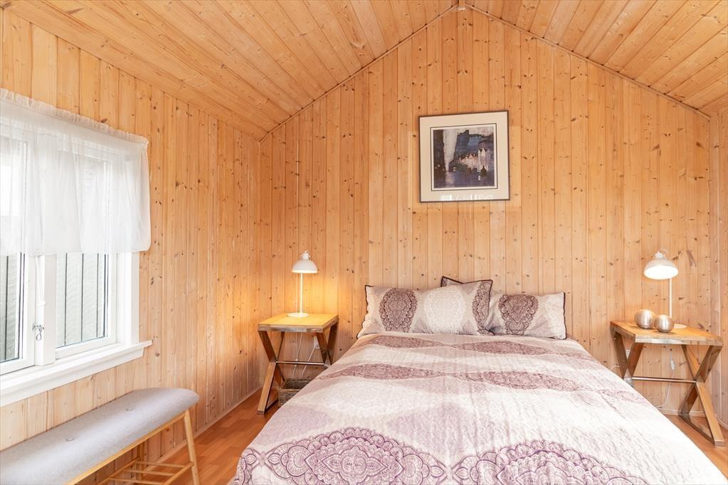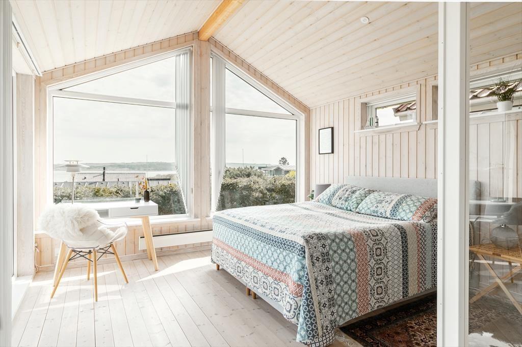Beim Betreten des architektonisch gestalteten Ferienhauses ist das Erste, was du bemerkst, das Licht – und die Stille. Das Haus wurde behutsam renoviert, mit großem Respekt für die ursprüngliche Architektur, und strahlt durchgehend hohe Qualität aus. Große Panoramafenster bieten einen fantastischen Blick auf den Limfjord und lassen sowohl Tageslicht als auch die faszinierende Landschaft direkt ins Wohnzimmer strömen. Hier spürst du sofort die Liebe zum Detail: Vom offenen und einladenden Wohnbereich, in dem der Kaminofen an kühlen Abenden gemütlich knistert, über die zwei Schlafzimmer und das charmante Annex, die jeweils mit Doppelbetten sowie Privatsphäre und Komfort überzeugen. Im Master Bedroom erwartet dich zudem eine atemberaubende Aussicht – der perfekte Ort, um langsam aufzuwachen und den Blick über das glitzernde Wasser schweifen zu lassen. Die neue, offene Küche ist harmonisch in den Wohnbereich integriert und bildet den natürlichen Rahmen für gemeinsames Kochen, Zusammensein und Brettspiele, während die Wärmepumpe stets für die richtige Temperatur sorgt. Das Badezimmer ist mit allem Nötigen ausgestattet, einschließlich einer praktischen Wasch-Trocken-Kombination, sodass auch der Alltag im Urlaub mühelos funktioniert.