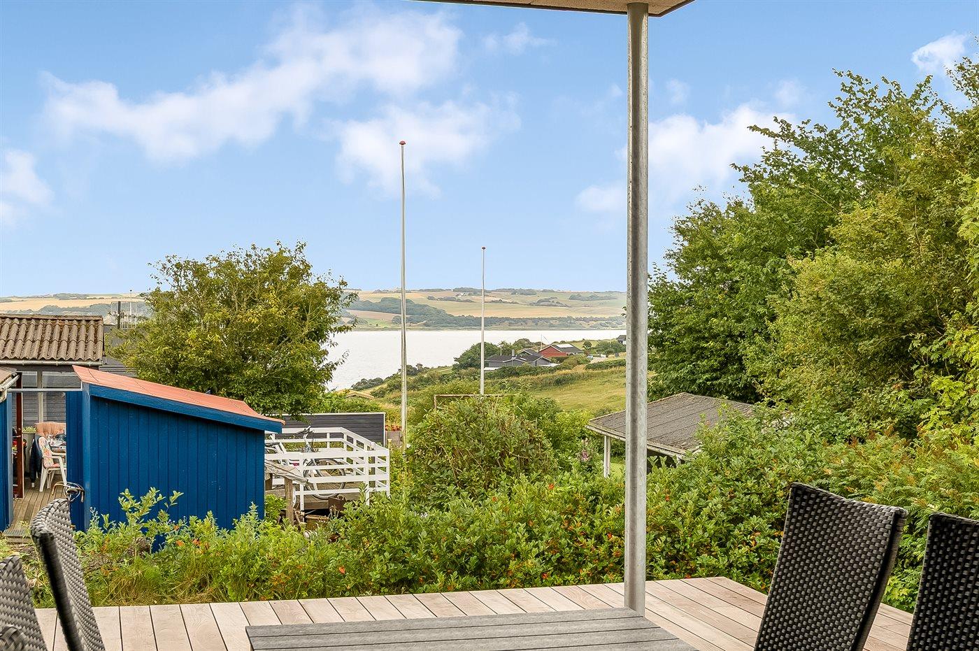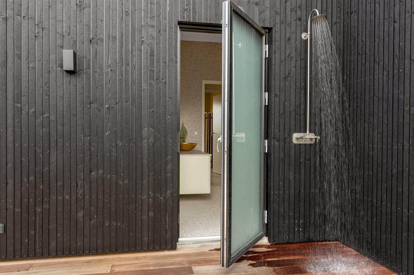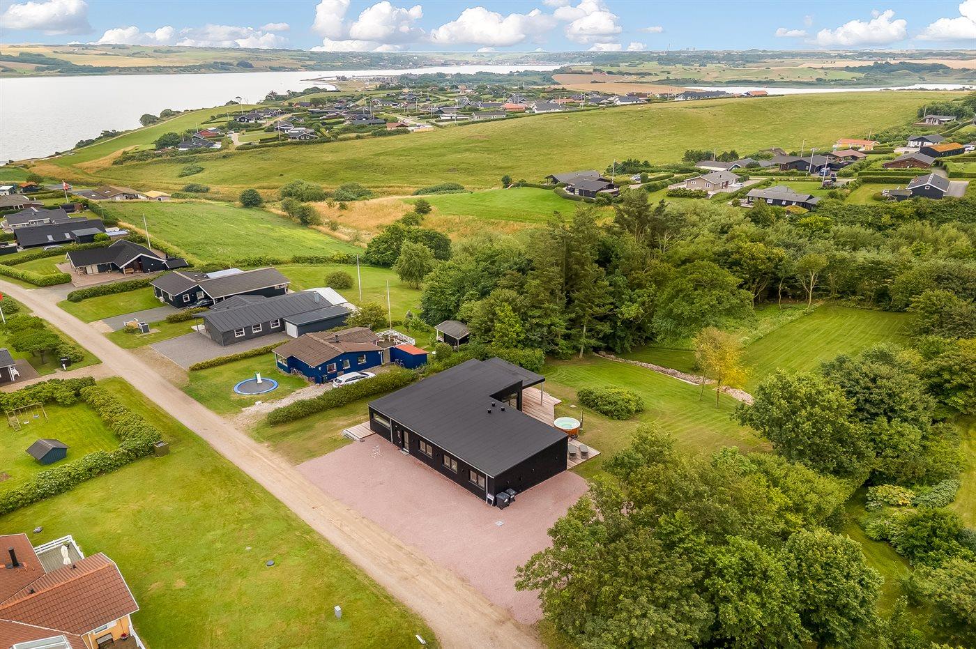 Ferieboligen er beliggende på en 2965 m² stor naturtomt. Avstand til fjord er 300 m. Nærmeste butikk ligger i en avstand på 5000 m. Golfbane i en avstand på 4000 m. Til ferieboligen hører åpent terrasseareal. I tillegg er det overdekket terrasse. Avstand til lekeplass er 500 m. Utendørs dusj. Det er montert kontakt til lading av elbil ved huset. P-plass ved huset.