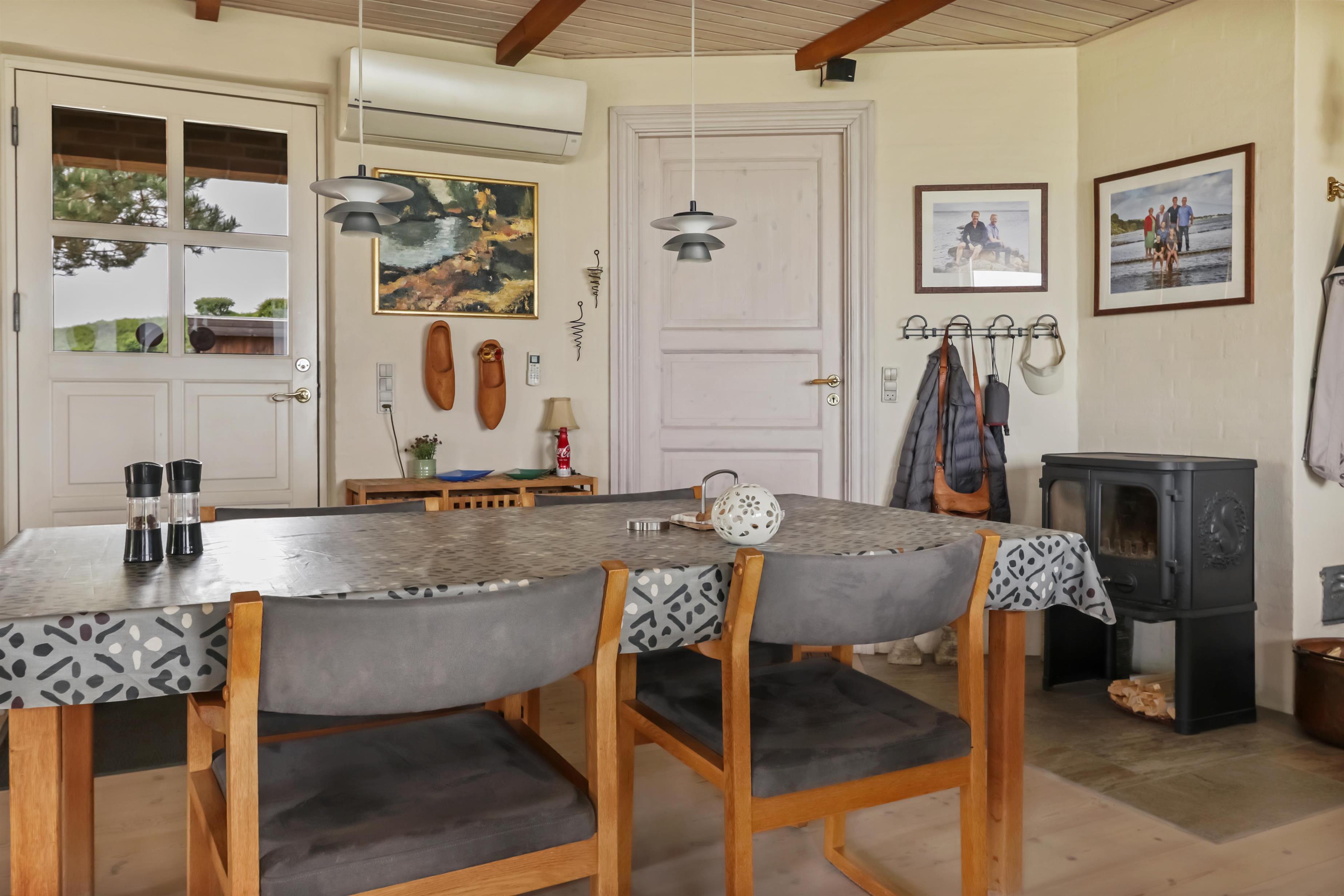 Das Ferienhaus ist 87 m² groß. Kombinierter Wohnbereich und Küchenzeile mit Zugang zur Terrasse. Gut ausgestattete Küchenzeile mit allem, was man an Geschirr und Küchenutensilien braucht, sowie Induktionskochfeld, Dunstabzugshaube, eingebauter Kombiofen, Geschirrspüler und Kühlschrank mit Gefrierfach. Schöner Wohnbereich mit Ledermöbeln, Esstisch, Fernseher mit dänischen Sendern sowie Chromecast, das das Streamen eigener Radio- und TV-Programme ermöglicht. Ein gemütlicher Holzofen sorgt für zusätzliche Behaglichkeit, und zusammen mit der Wärmepumpe werden die Verbrauchskosten zu jeder Jahreszeit gering gehalten.