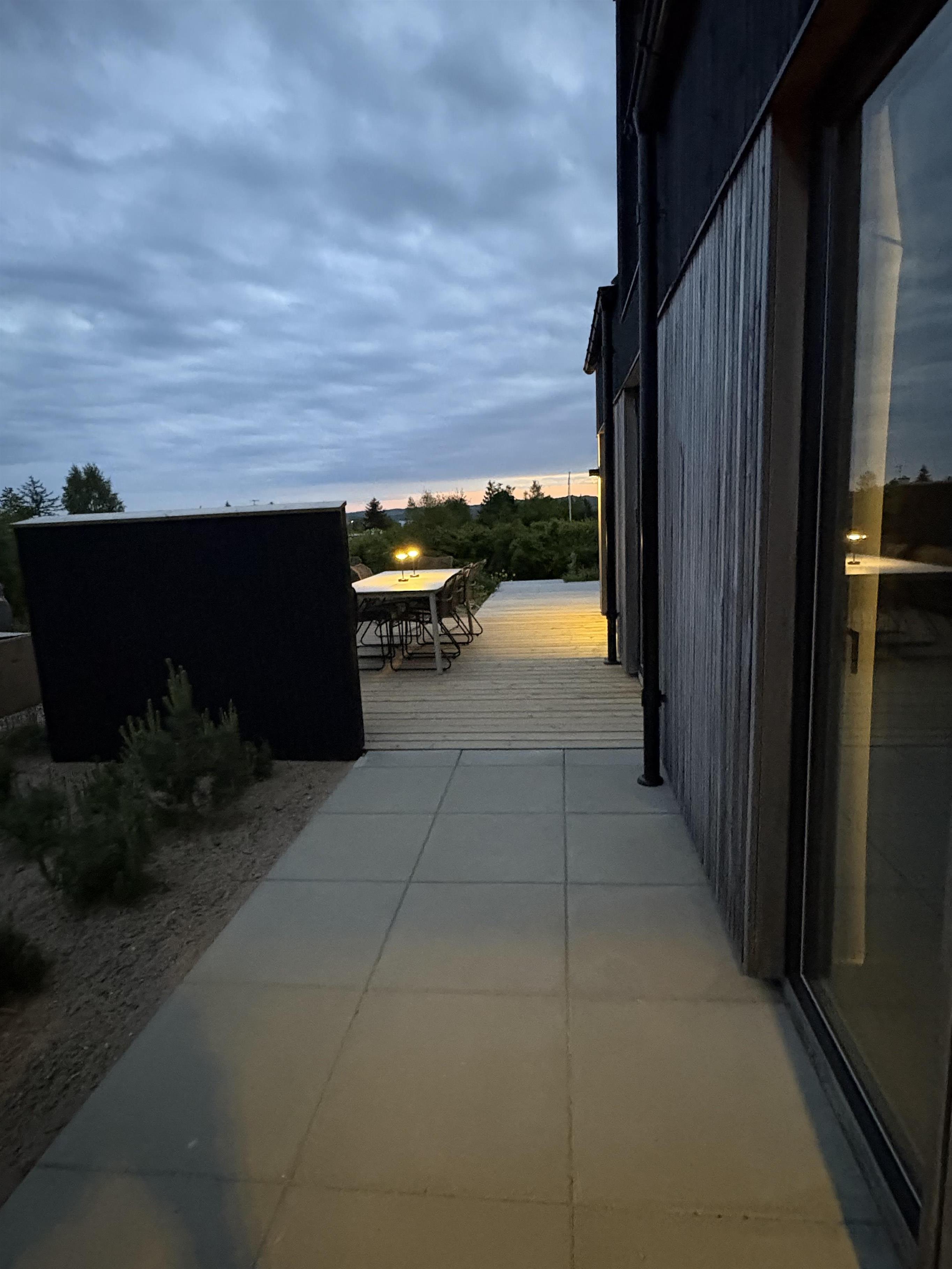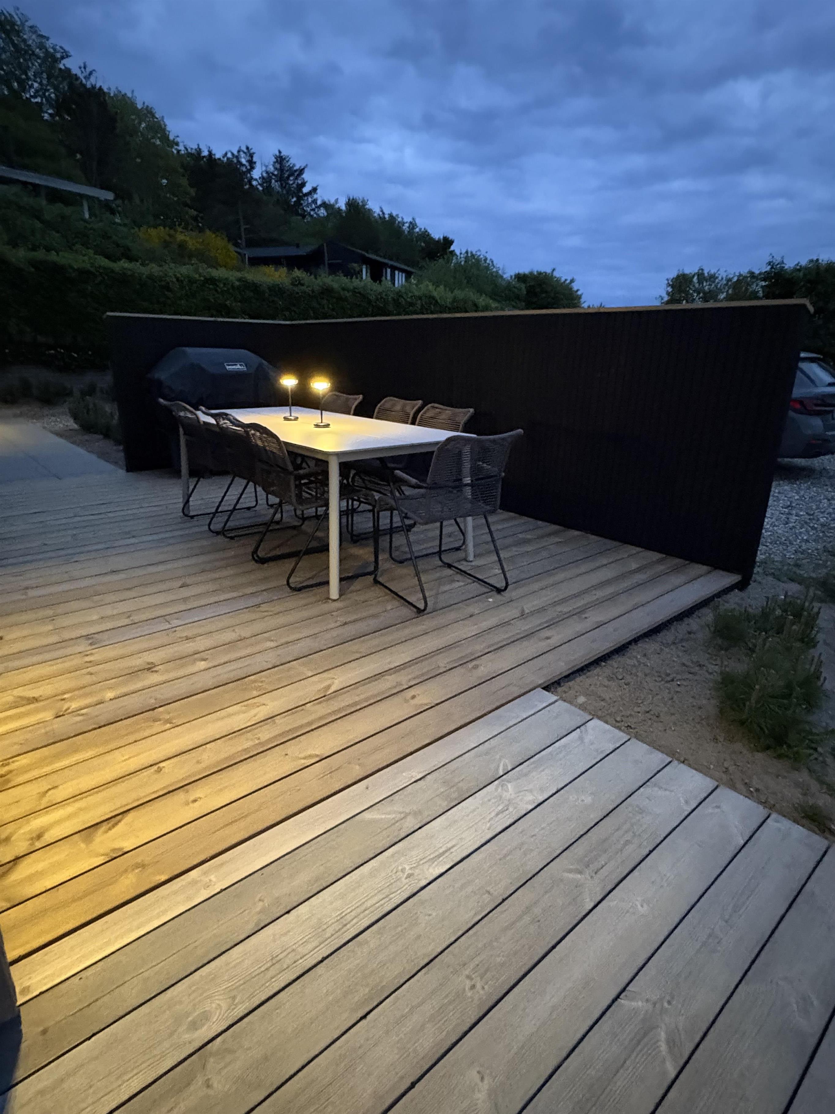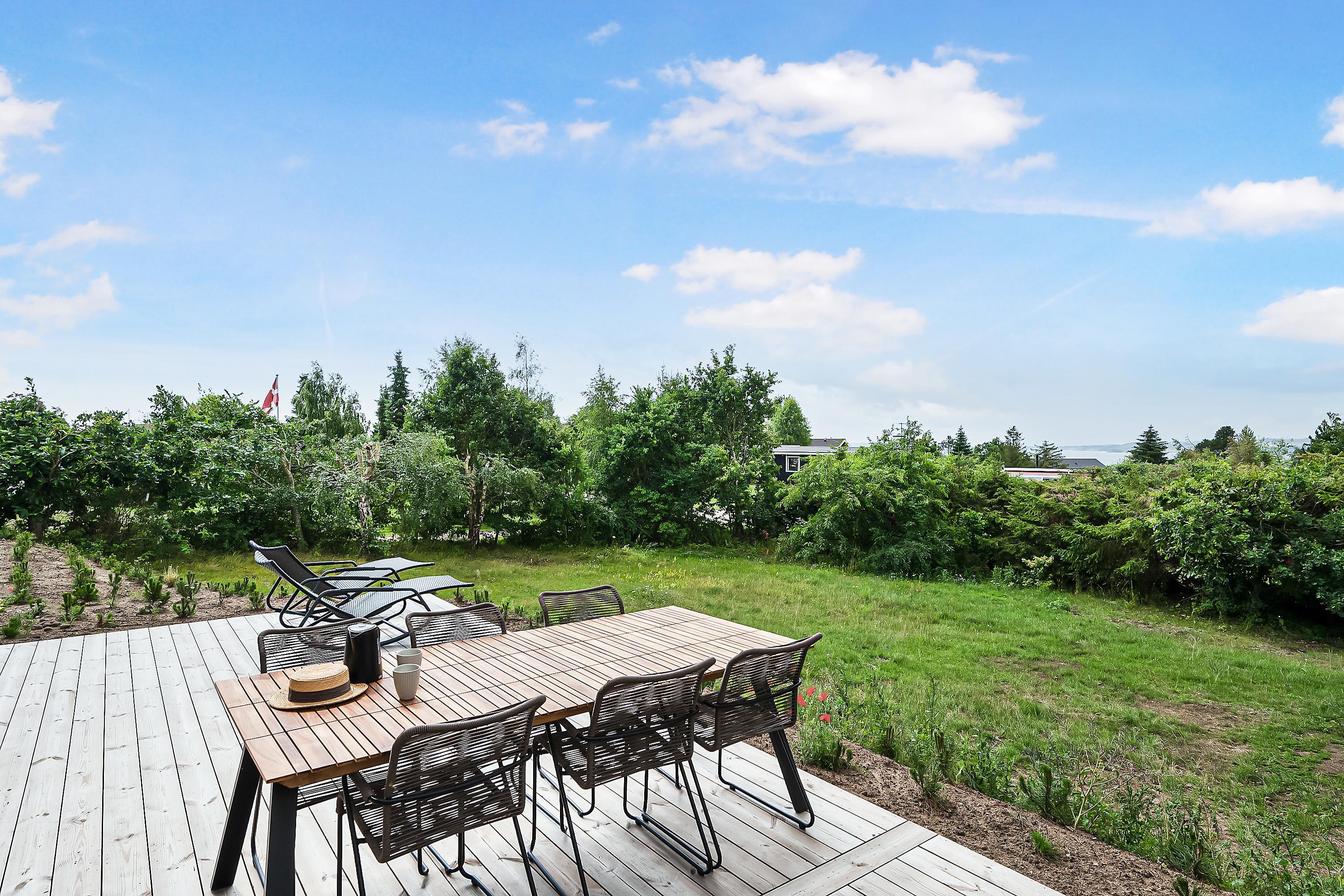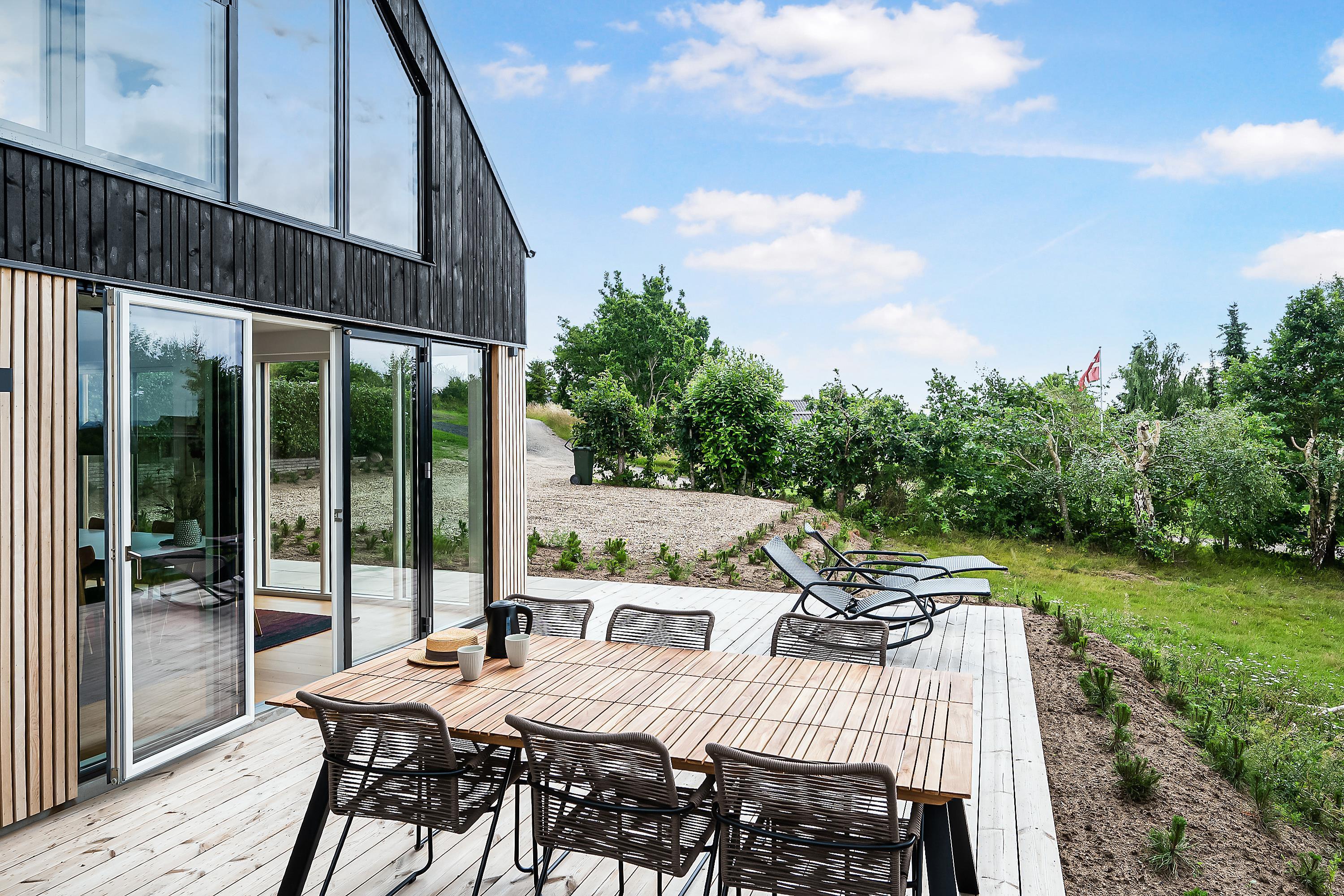 Close to the Mols Bjerge National Park and just a 10-minute drive from Ebeltoft, you will find this beautiful newly built holiday home, located on a sloping plot. The two-story house is tastefully furnished and features a lovely entrance hall on the ground floor with space for shoes and outerwear. The new and stylish kitchen includes a dishwasher, microwave, fridge/freezer, air fryer, and a large dining area. From here, there is access to the wonderful terraces with garden furniture, loungers, a parasol, and a heat lamp by the parasol.