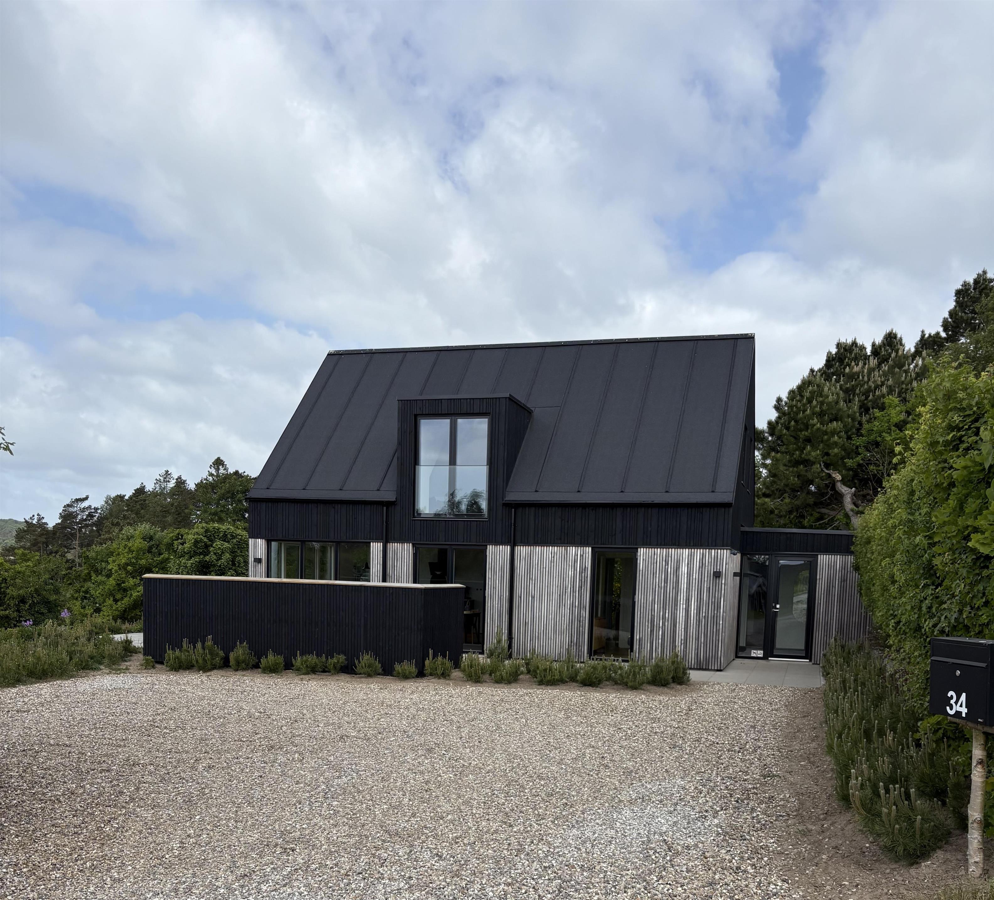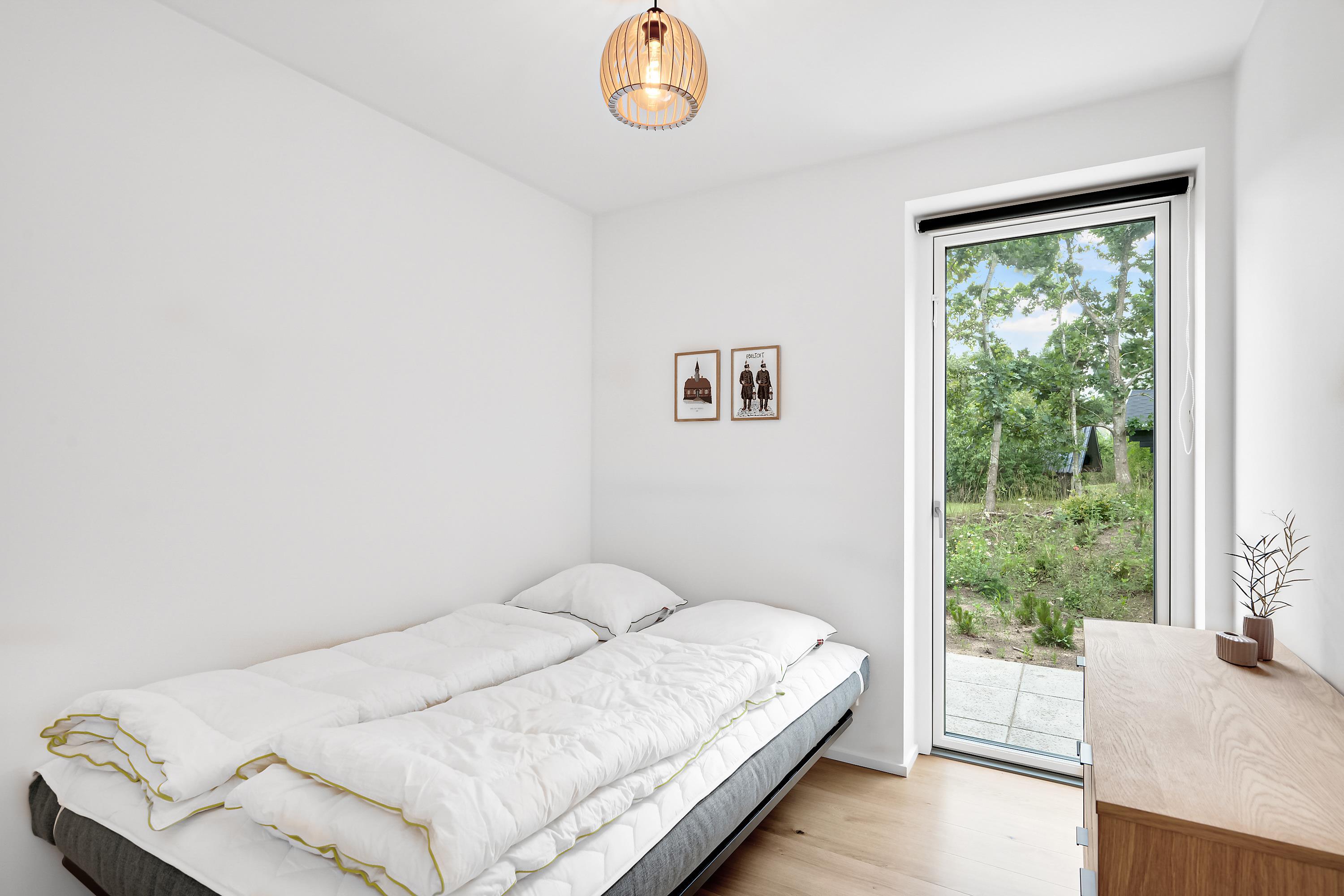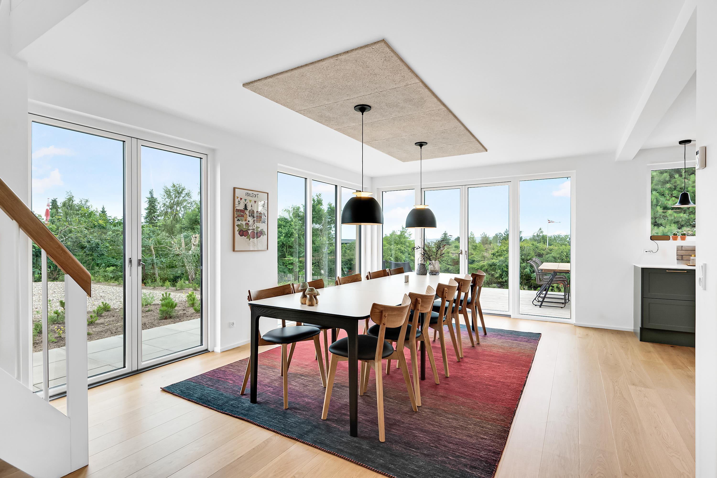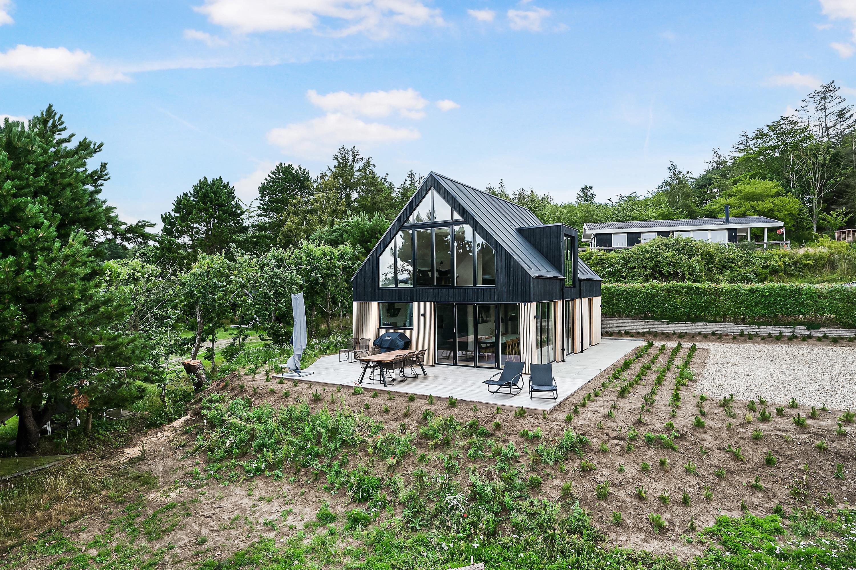 Close to the Mols Bjerge National Park and just a 10-minute drive from Ebeltoft, you will find this beautiful newly built holiday home, located on a sloping plot. The two-story house is tastefully furnished and features a lovely entrance hall on the ground floor with space for shoes and outerwear. The new and stylish kitchen includes a dishwasher, microwave, fridge/freezer, air fryer, and a large dining area. From here, there is access to the wonderful terraces with garden furniture, loungers, a parasol, and a heat lamp by the parasol.