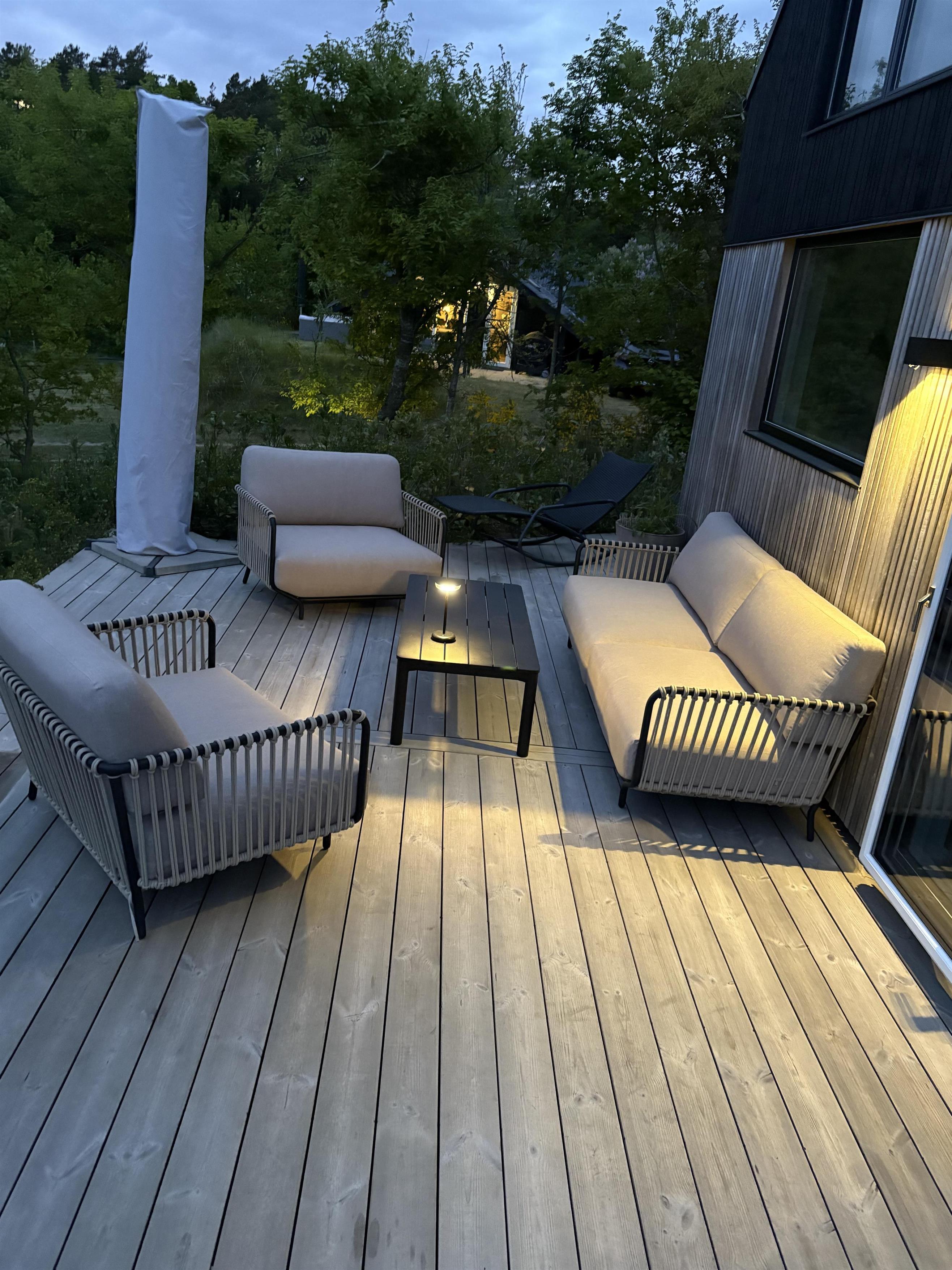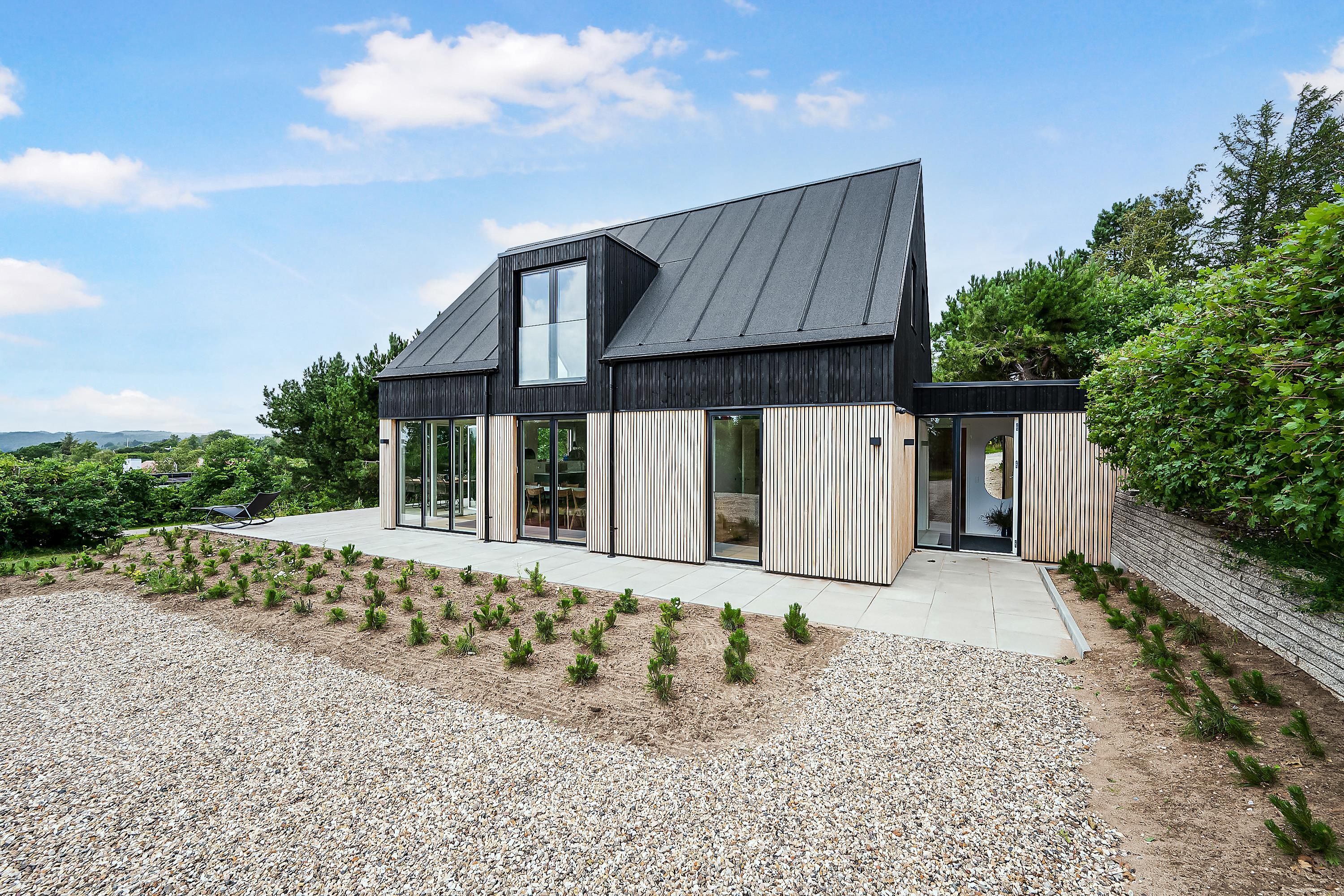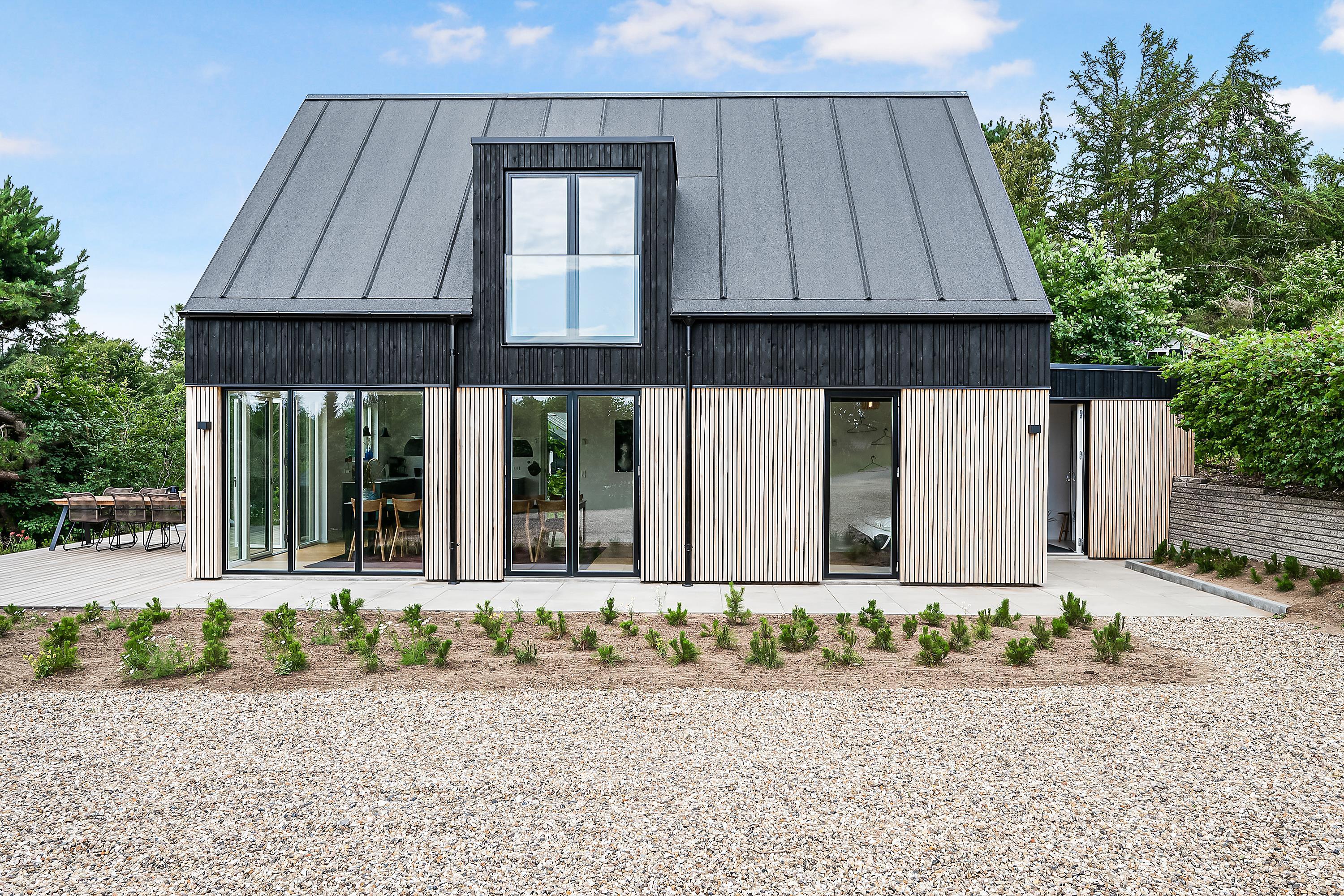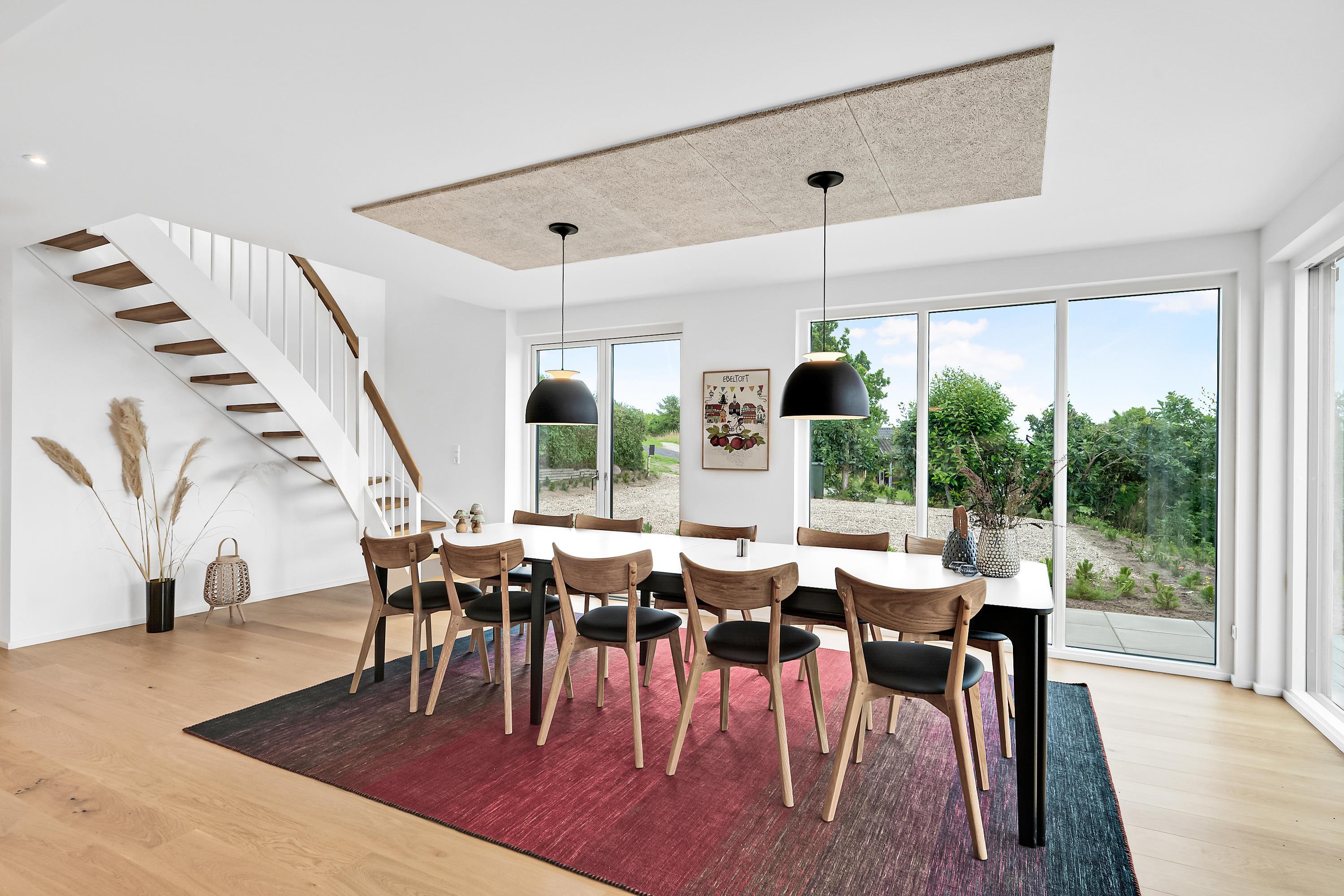 Close to the Mols Bjerge National Park and just a 10-minute drive from Ebeltoft, you will find this beautiful newly built holiday home, located on a sloping plot. The two-story house is tastefully furnished and features a lovely entrance hall on the ground floor with space for shoes and outerwear. The new and stylish kitchen includes a dishwasher, microwave, fridge/freezer, air fryer, and a large dining area. From here, there is access to the wonderful terraces with garden furniture, loungers, a parasol, and a heat lamp by the parasol.