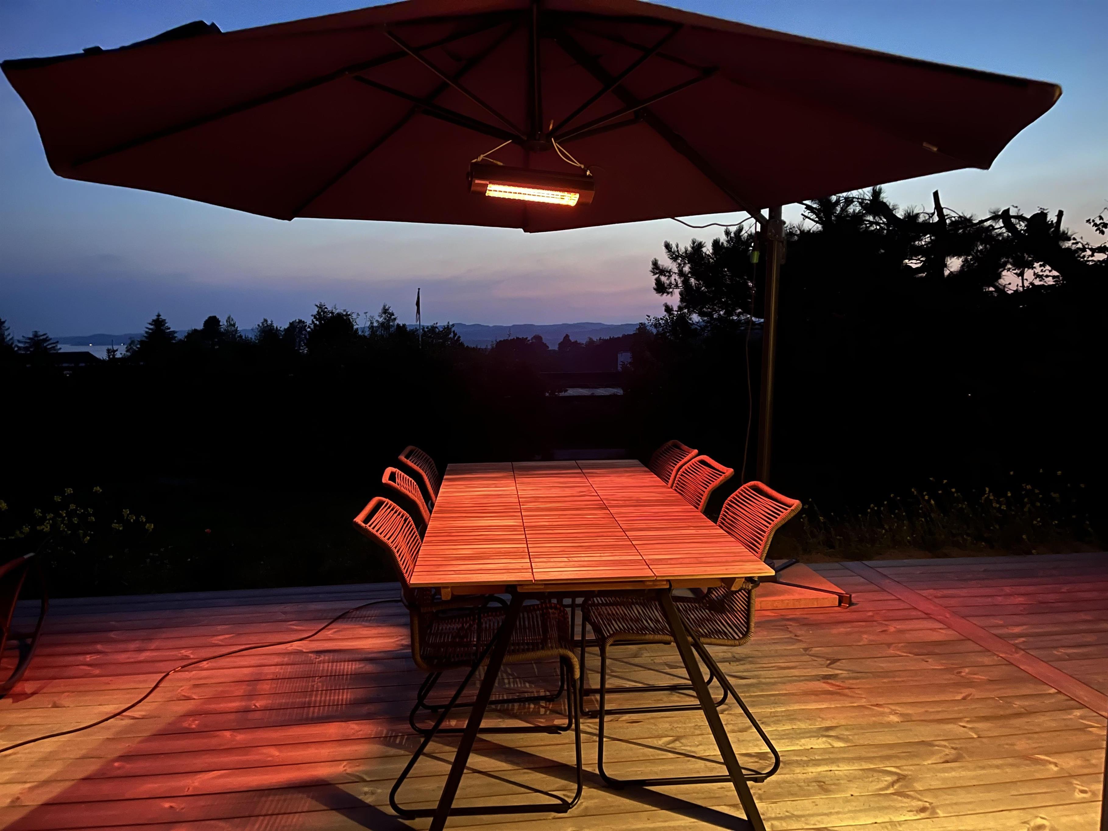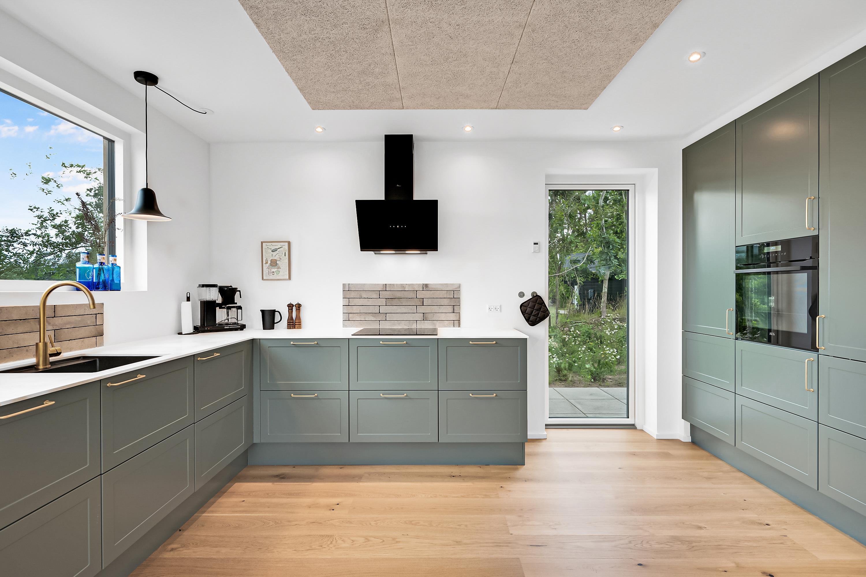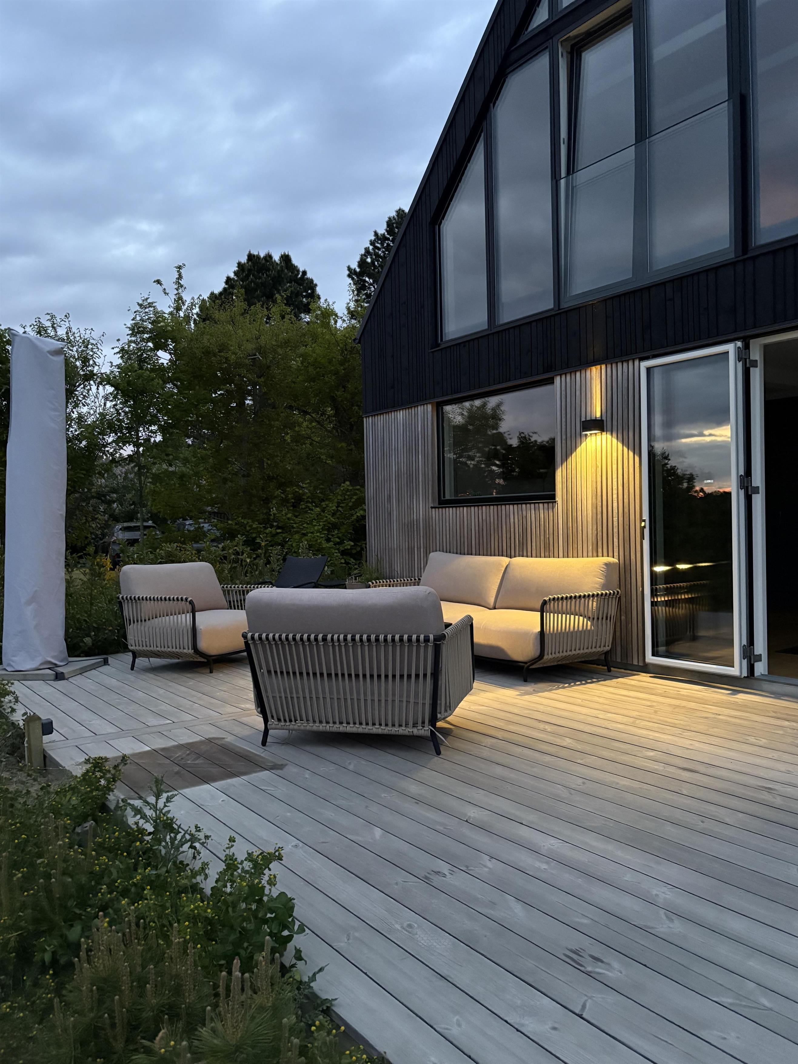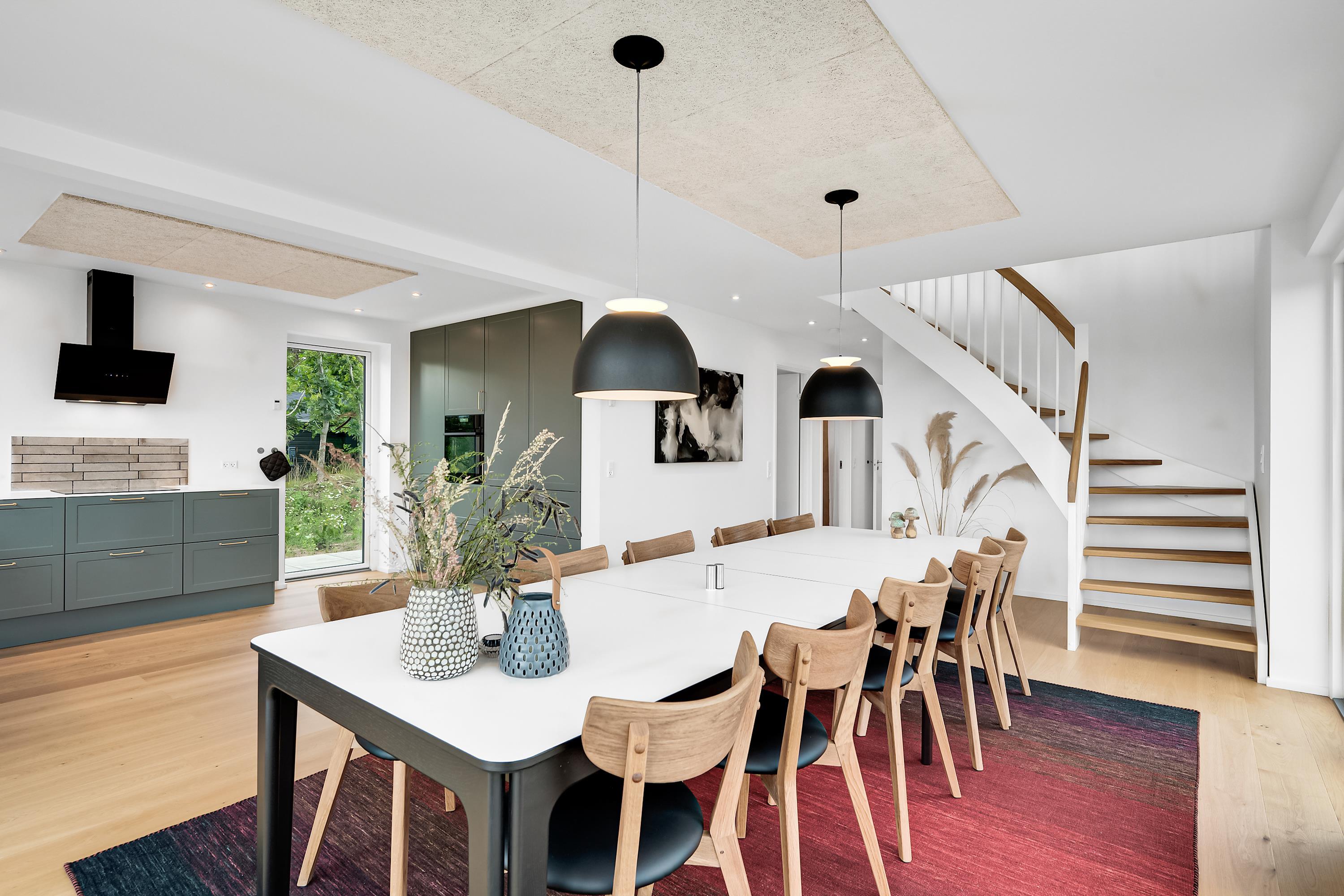 Close to the Mols Bjerge National Park and just a 10-minute drive from Ebeltoft, you will find this beautiful newly built holiday home, located on a sloping plot. The two-story house is tastefully furnished and features a lovely entrance hall on the ground floor with space for shoes and outerwear. The new and stylish kitchen includes a dishwasher, microwave, fridge/freezer, air fryer, and a large dining area. From here, there is access to the wonderful terraces with garden furniture, loungers, a parasol, and a heat lamp by the parasol.