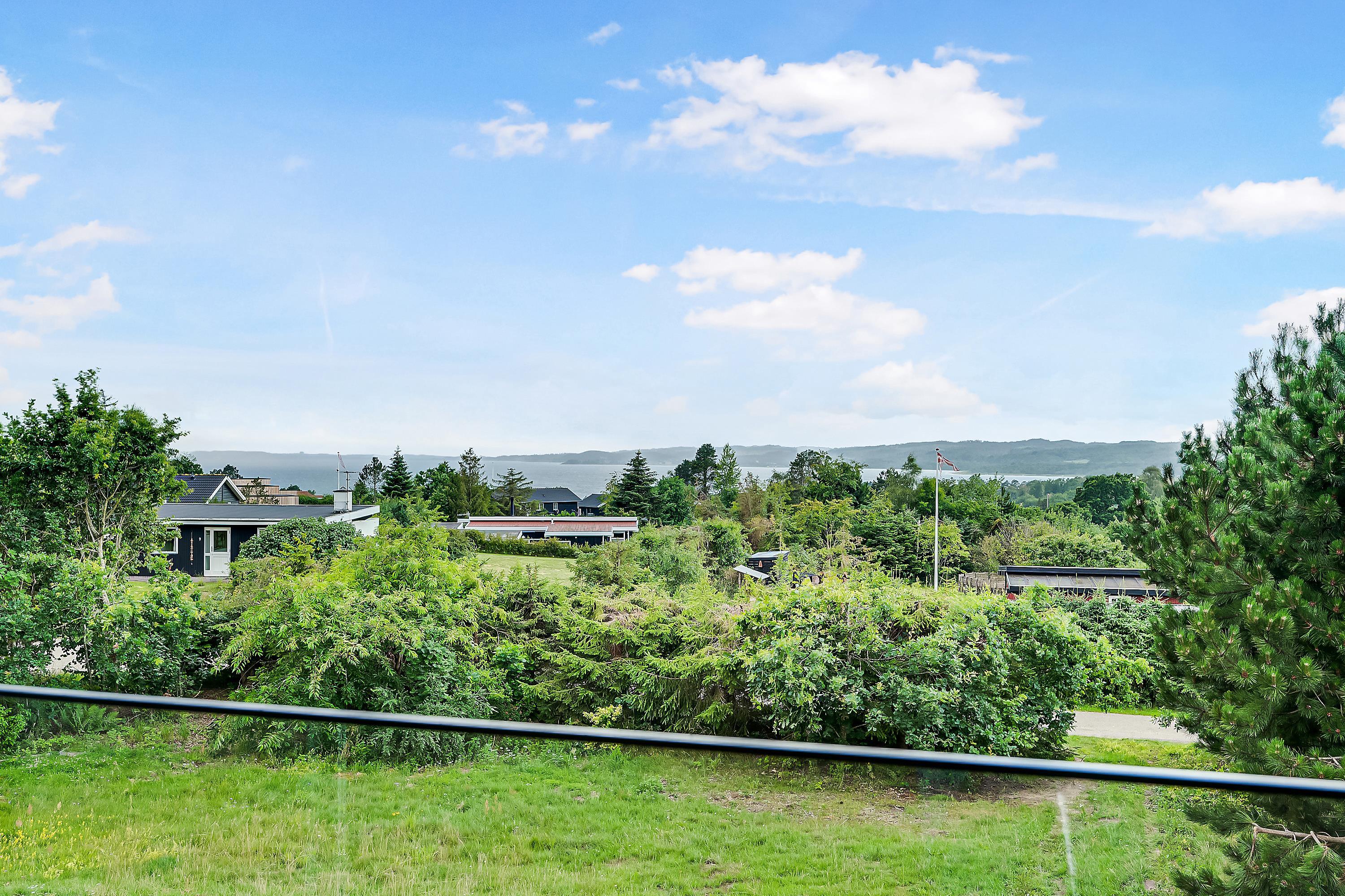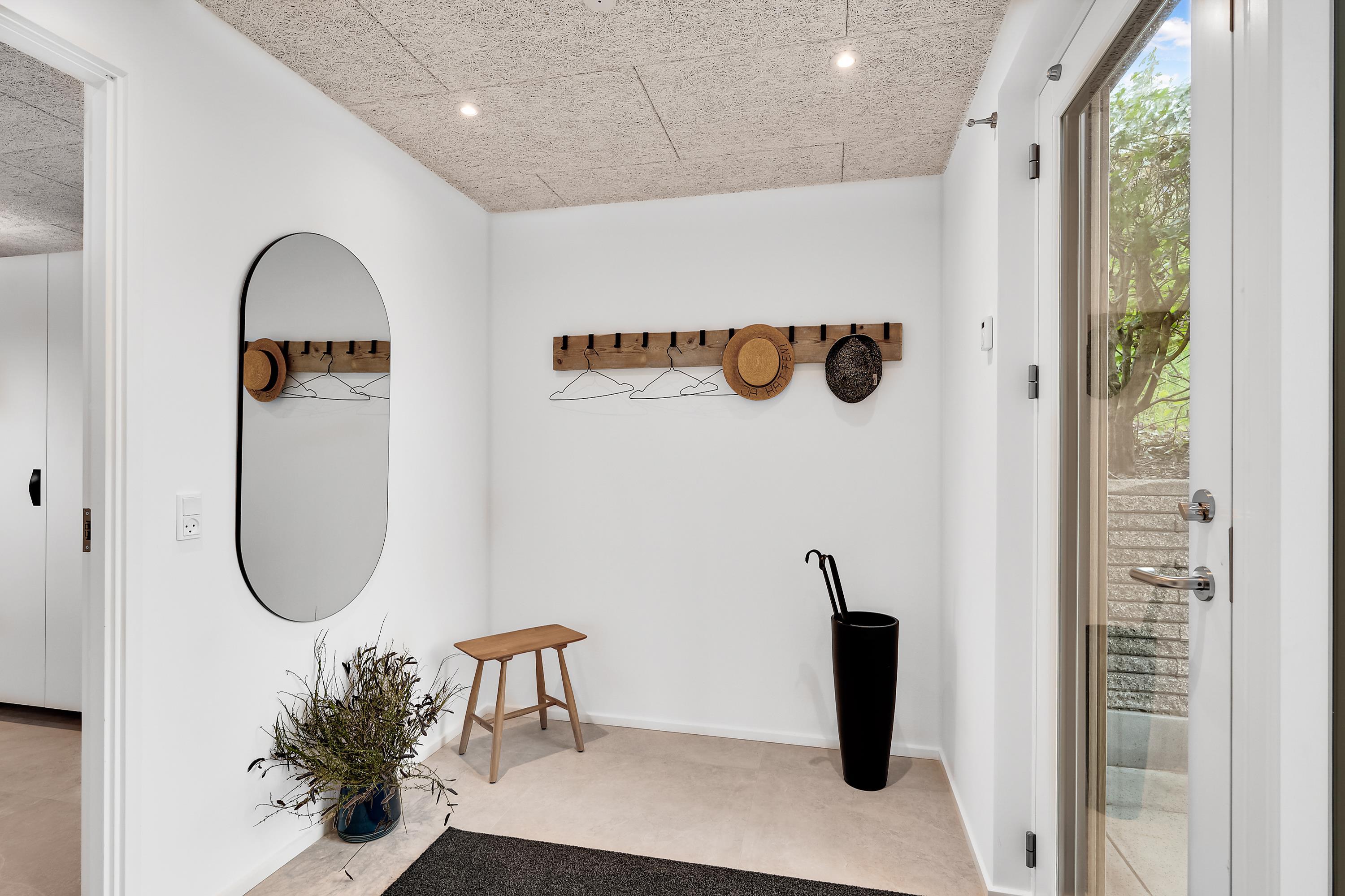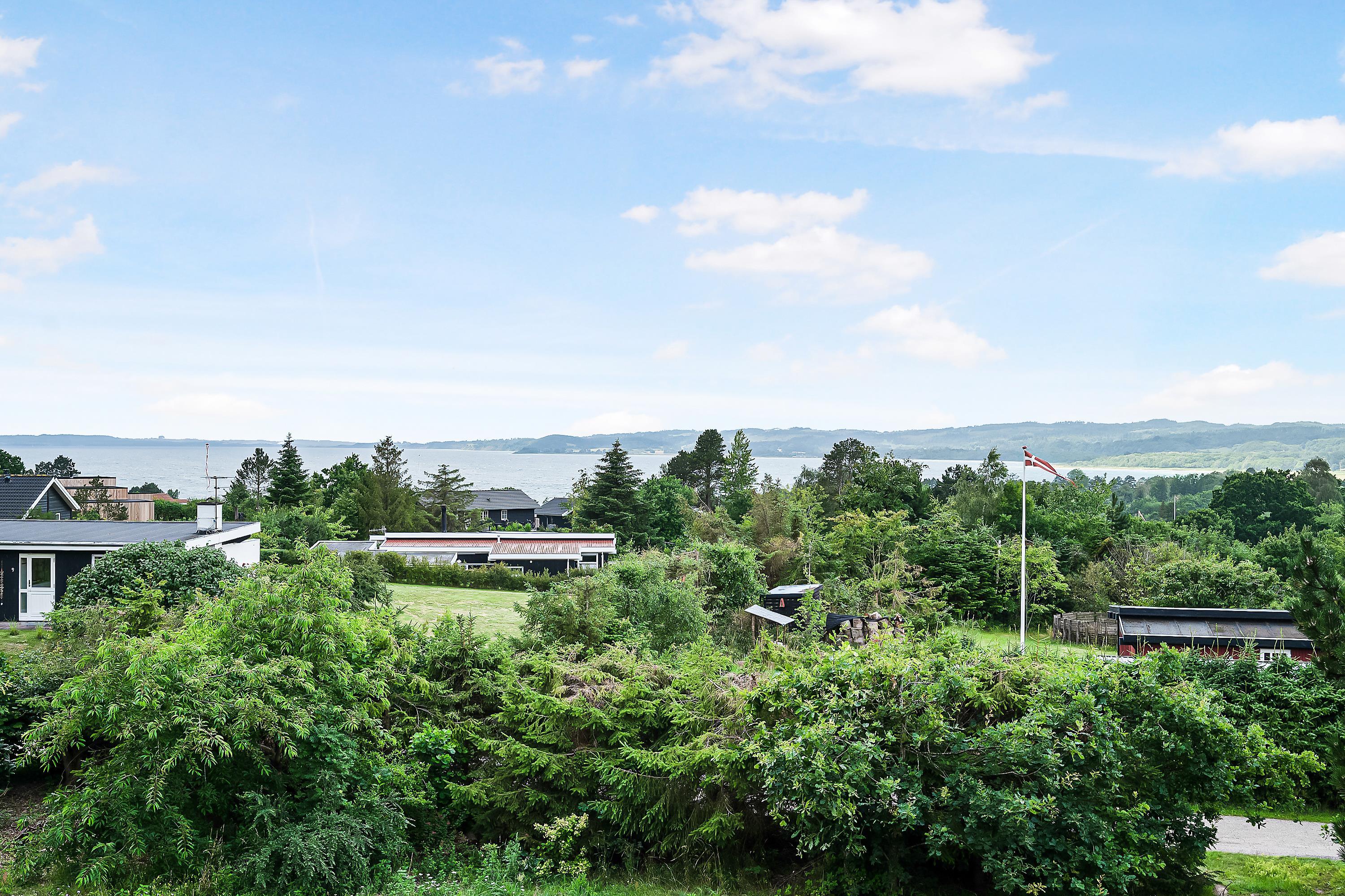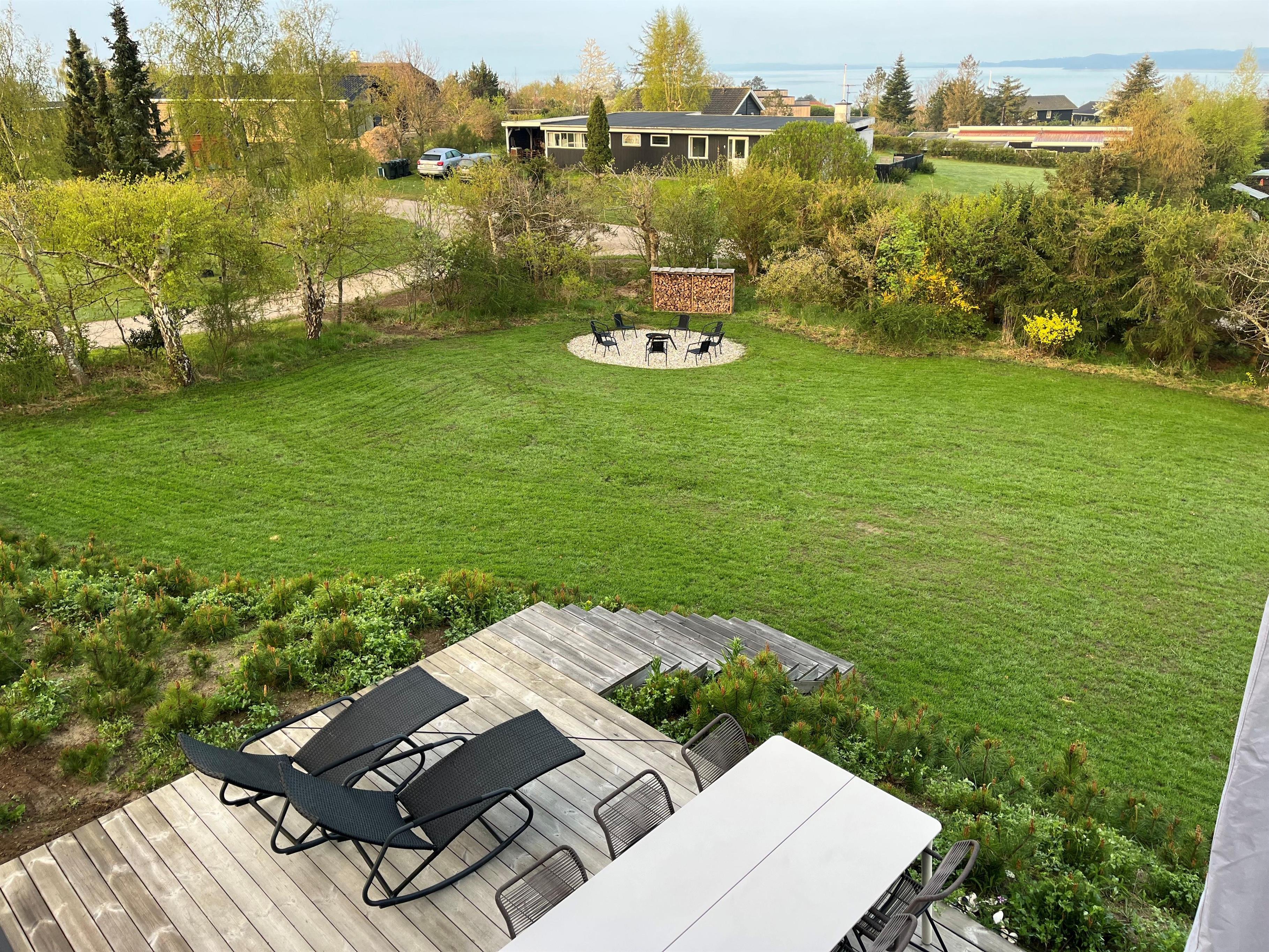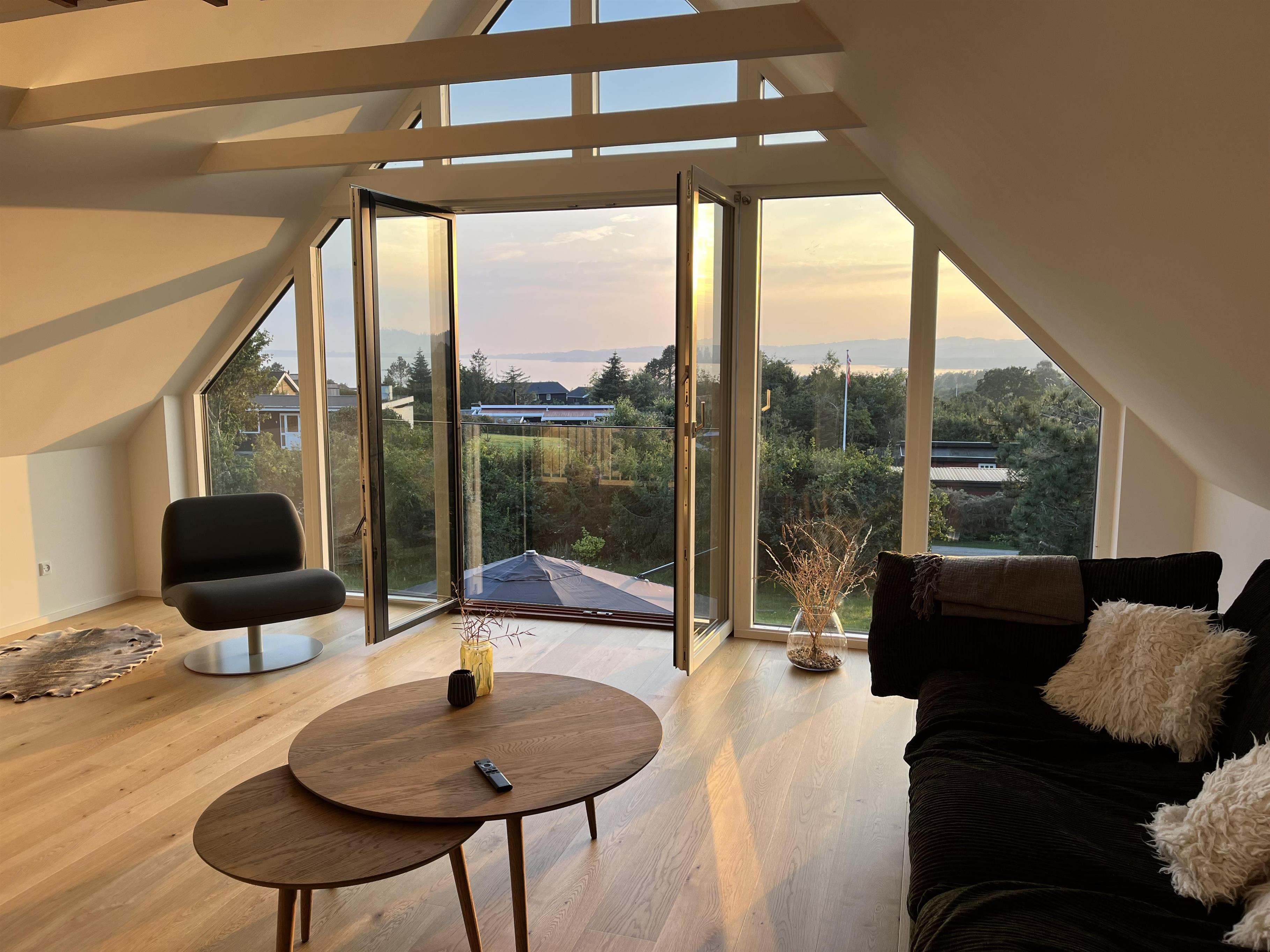 In the lower level, you'll also find two of the house's bedrooms, as well as a beautiful bathroom with a shower niche and underfloor heating. There is also a guest toilet with access to a washing machine and dryer. A beautiful staircase leads to the first floor, where you will find the lovely living room with a TV (Smart TV) and the most stunning view over the bay and Mols Bjerge. On the first floor, you will also find the last two bedrooms. All rooms have underfloor heating. Outdoors, there is a lovely secluded outdoor shower. The house is situated on a sloping plot with a lawn in front, perfect for play.
