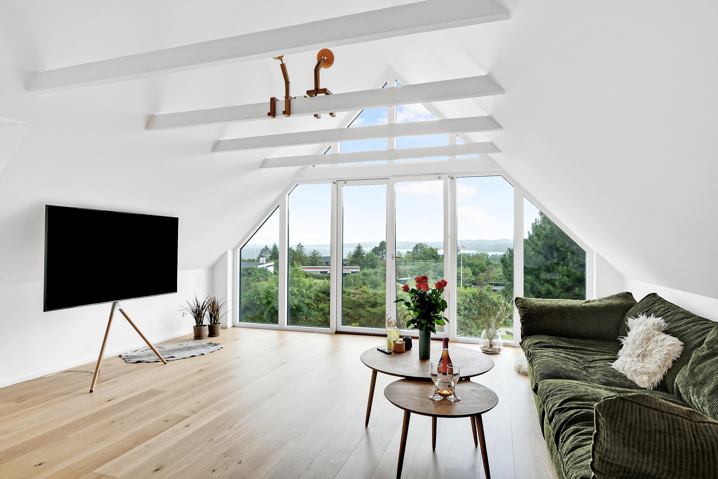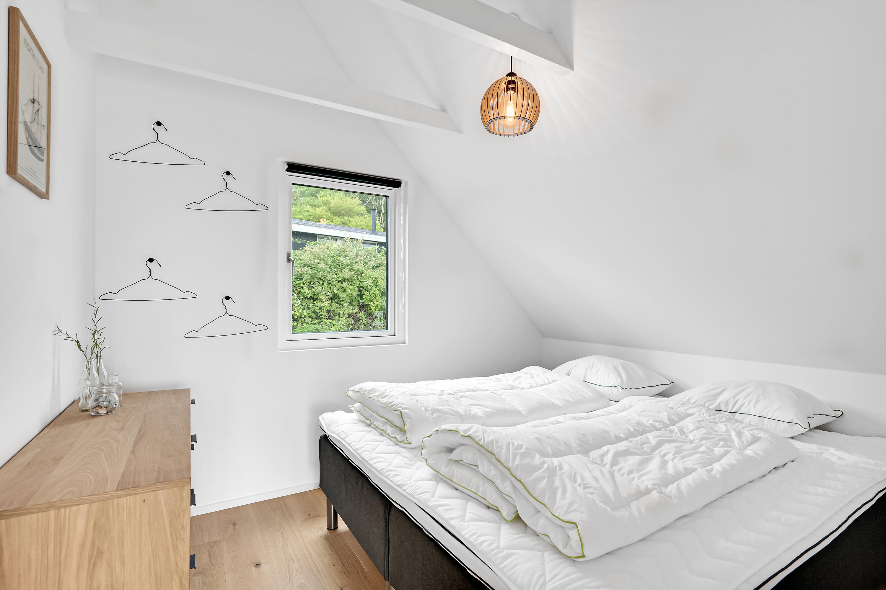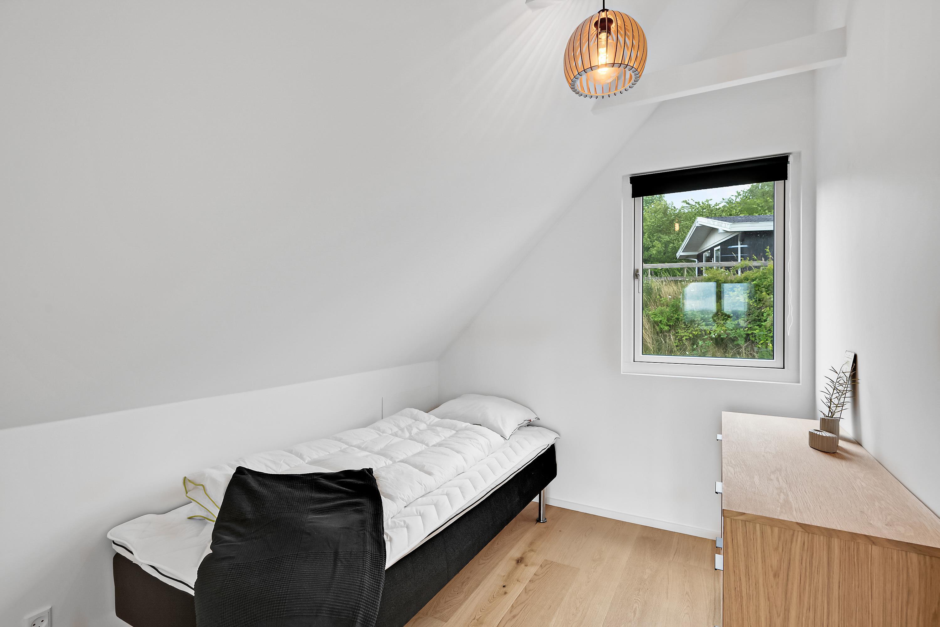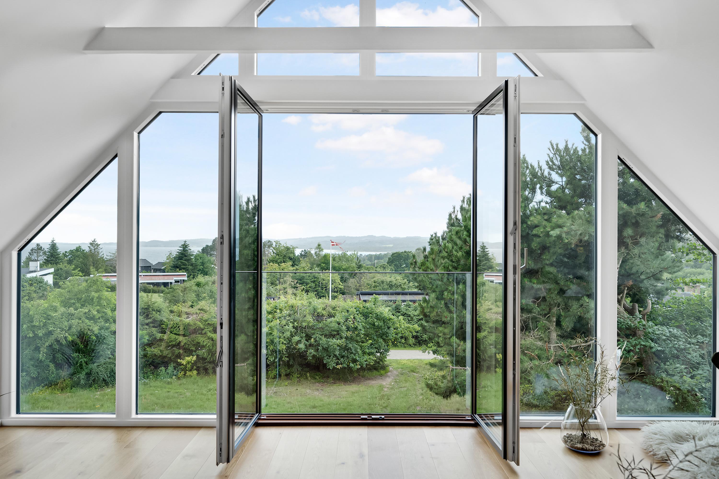 In the lower level, you'll also find two of the house's bedrooms, as well as a beautiful bathroom with a shower niche and underfloor heating. There is also a guest toilet with access to a washing machine and dryer. A beautiful staircase leads to the first floor, where you will find the lovely living room with a TV (Smart TV) and the most stunning view over the bay and Mols Bjerge. On the first floor, you will also find the last two bedrooms. All rooms have underfloor heating. Outdoors, there is a lovely secluded outdoor shower. The house is situated on a sloping plot with a lawn in front, perfect for play.
