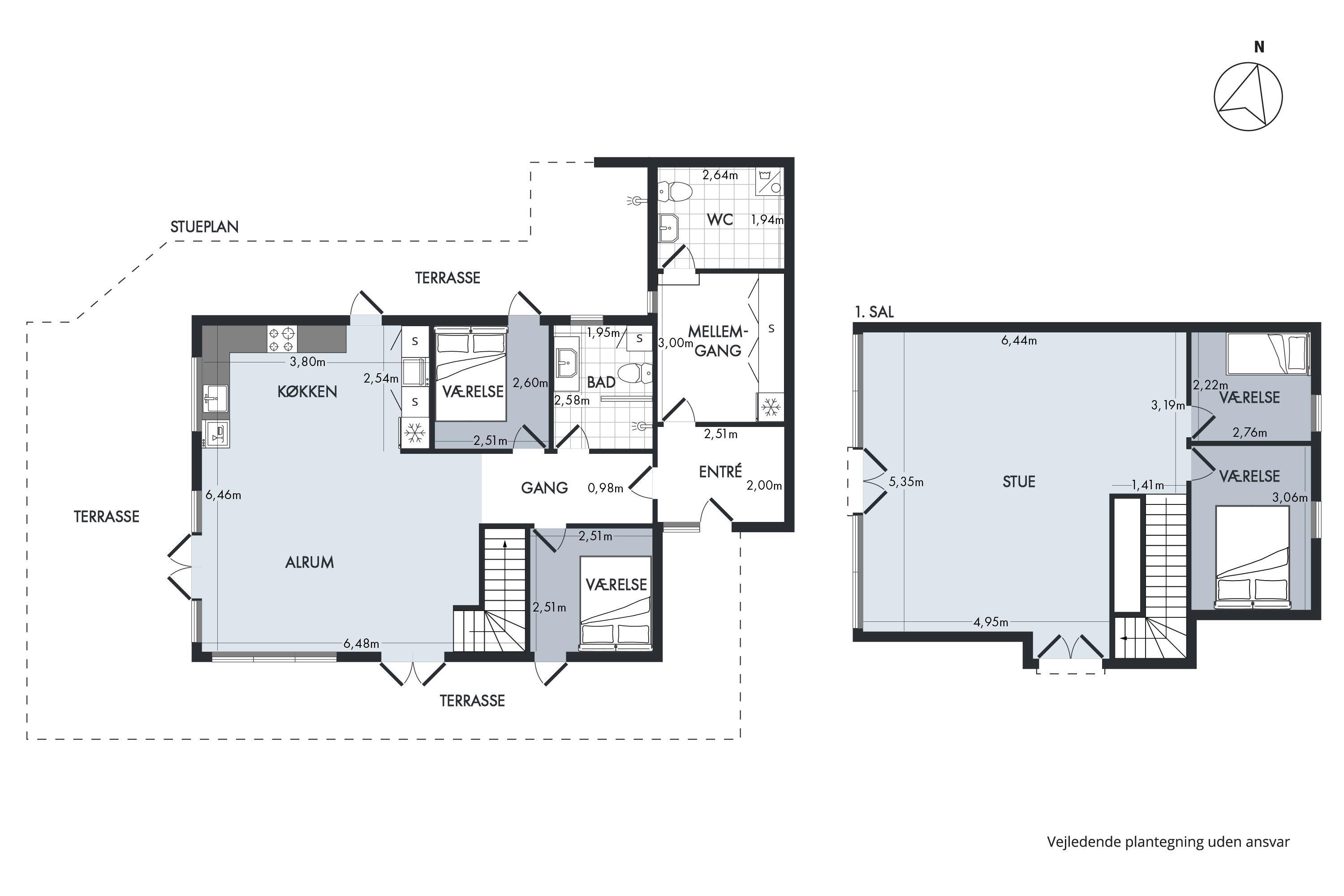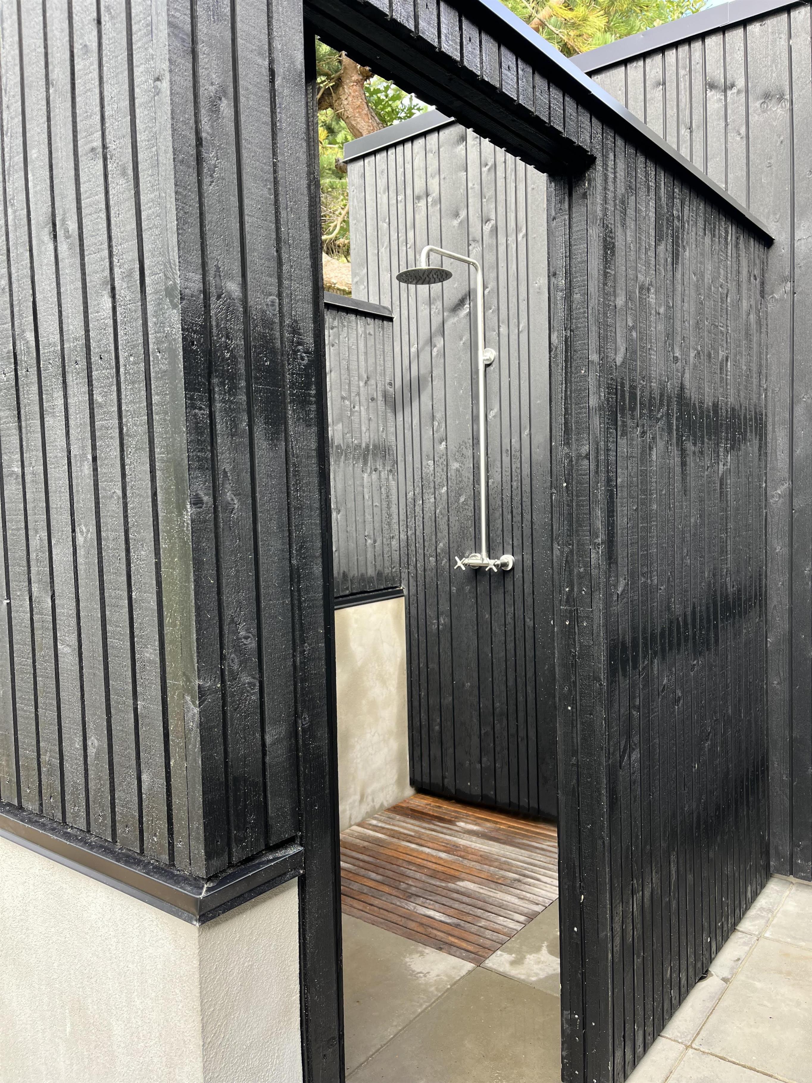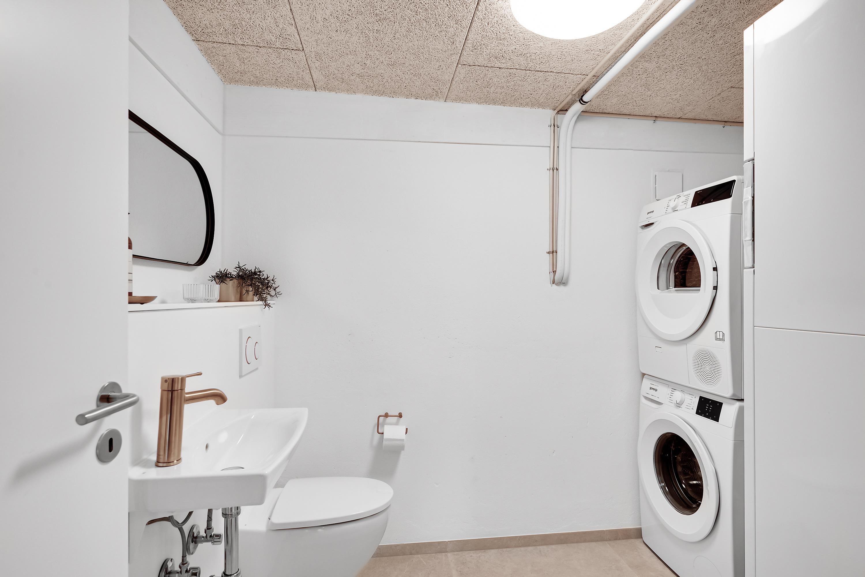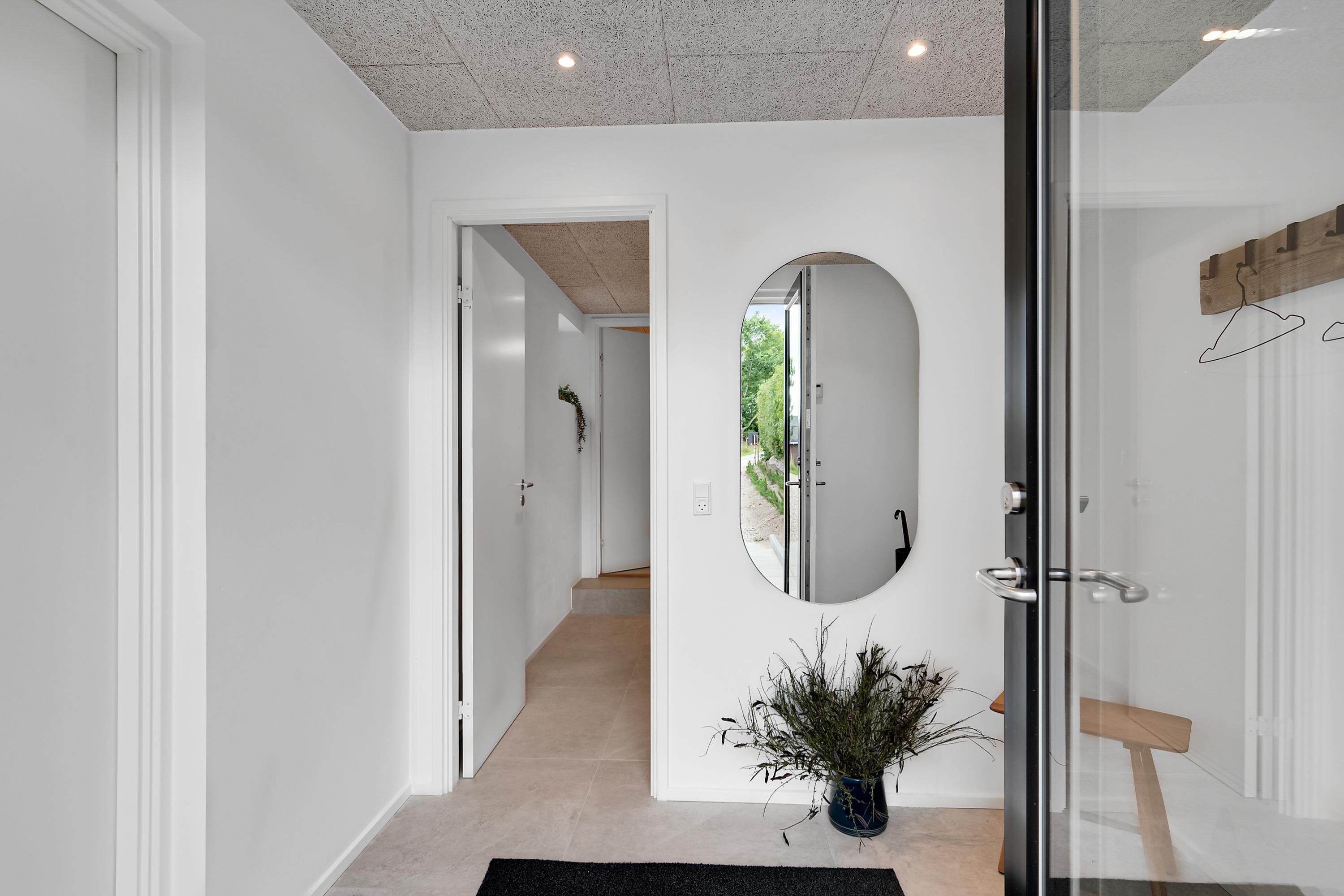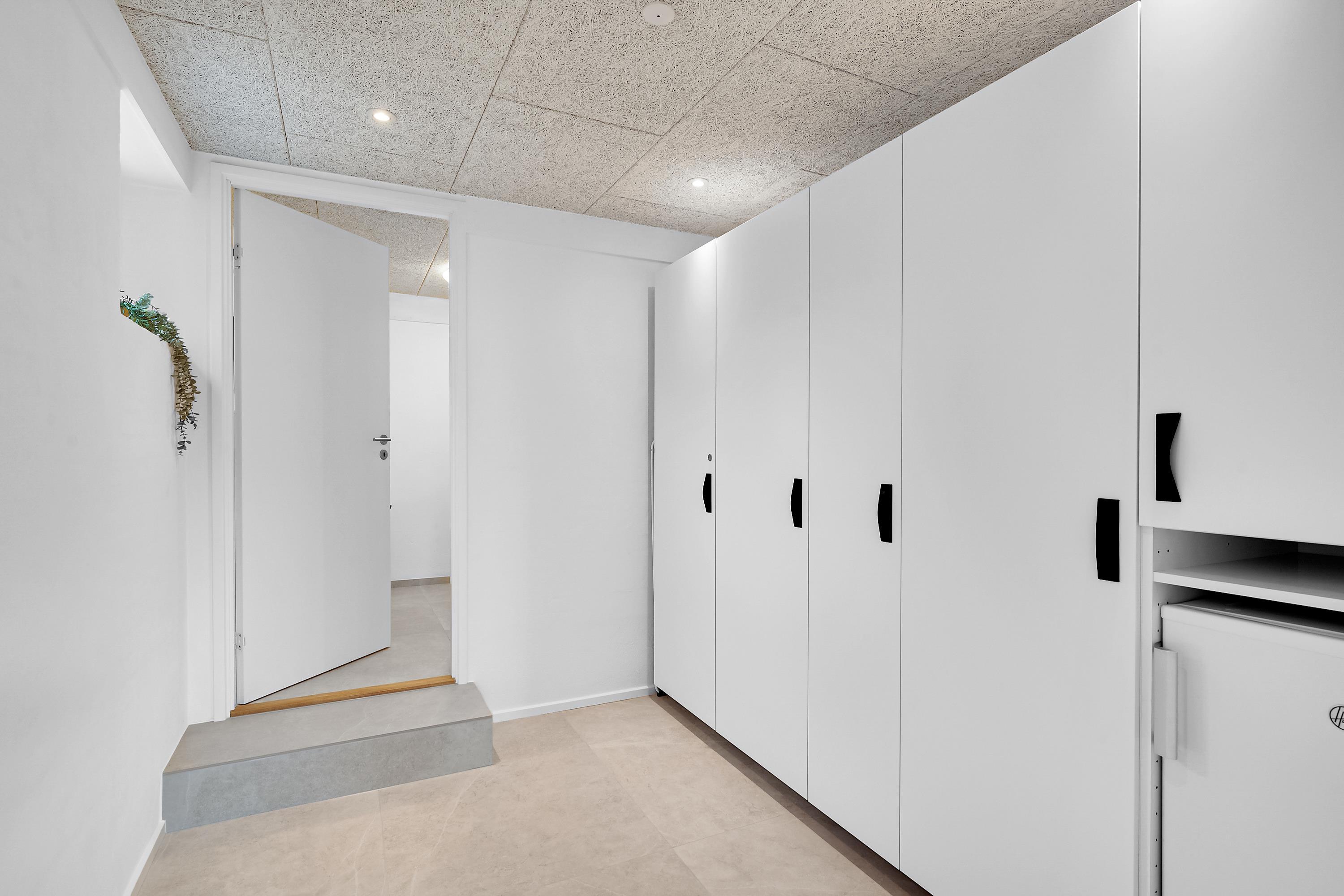 In the lower level, you'll also find two of the house's bedrooms, as well as a beautiful bathroom with a shower niche and underfloor heating. There is also a guest toilet with access to a washing machine and dryer. A beautiful staircase leads to the first floor, where you will find the lovely living room with a TV (Smart TV) and the most stunning view over the bay and Mols Bjerge. On the first floor, you will also find the last two bedrooms. All rooms have underfloor heating. Outdoors, there is a lovely secluded outdoor shower. The house is situated on a sloping plot with a lawn in front, perfect for play.