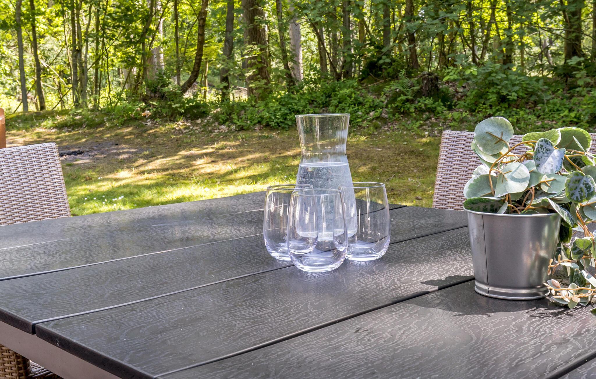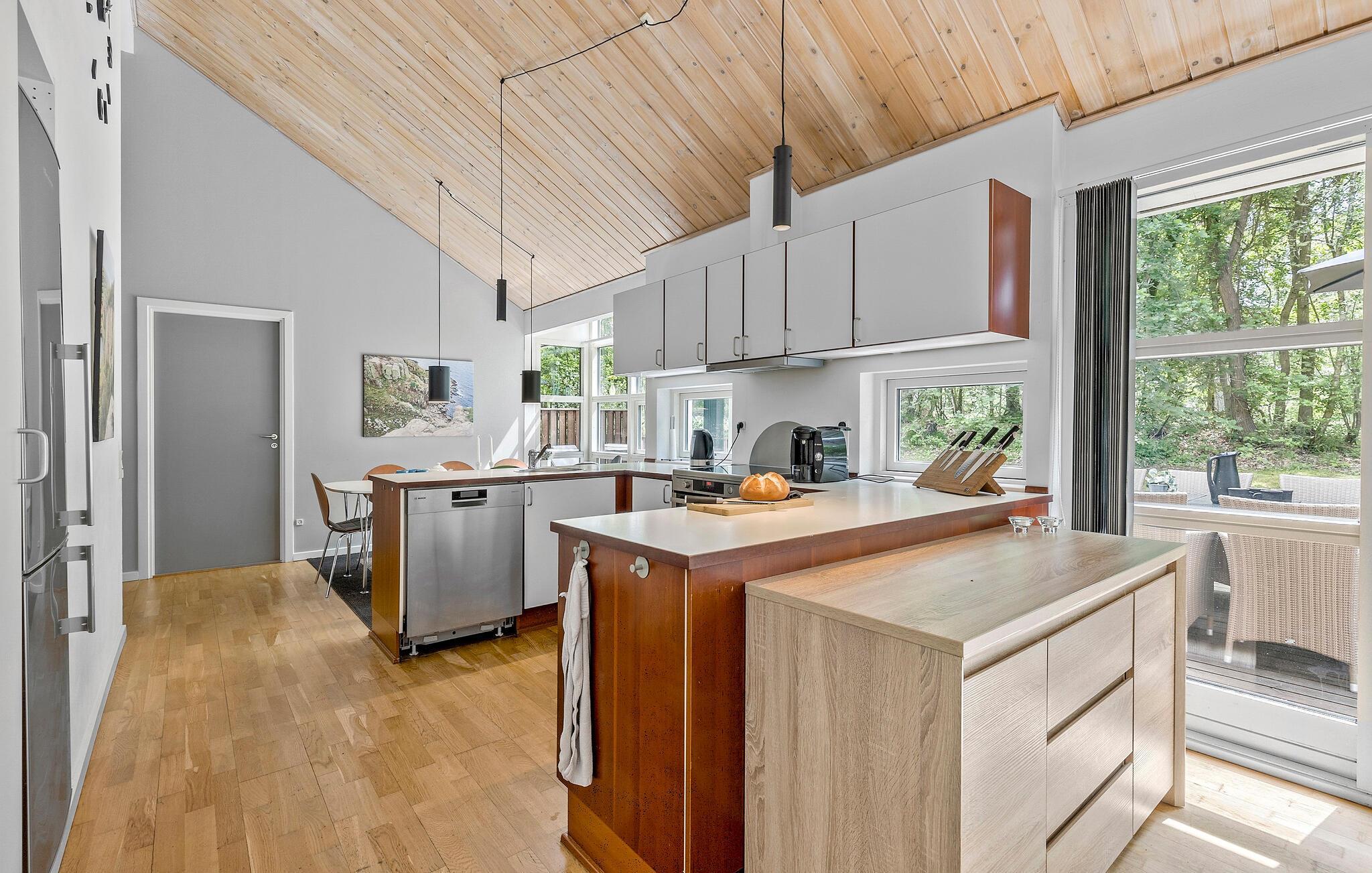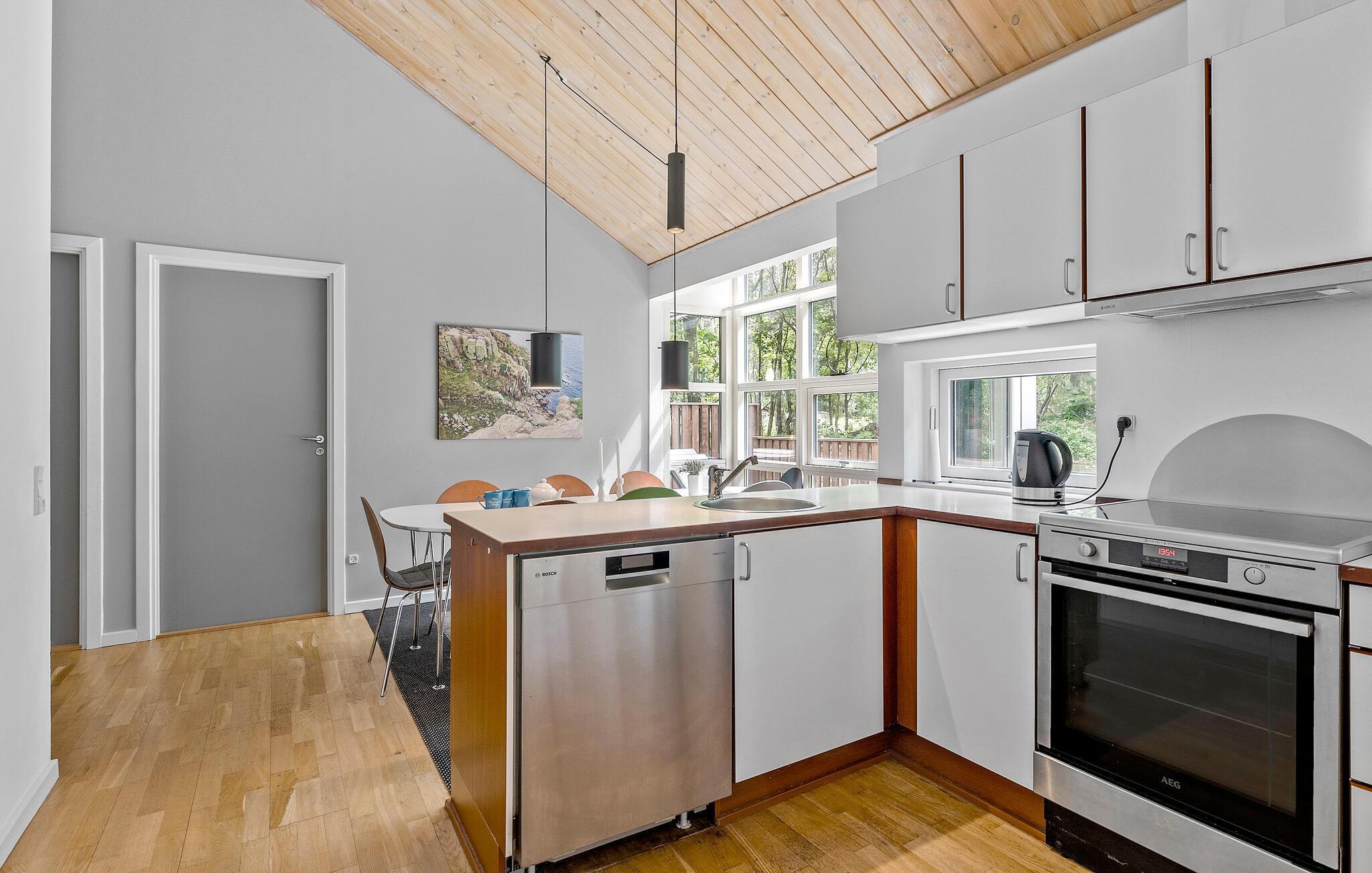 Huset ønsker deg velkommen med en vakker, lys og romslig stue med en hyggelig utsikt over skogen og utgang til terrassen. Denne er delvis overbygd og byr på koselige sitteplasser for sosialt samvær, lek eller spising - spiseplassen ved siden av det meget velutstyrte og åpne kjøkkenet gjør det også mulig for kokken å tilberede feriemåltider i det beste selskap.