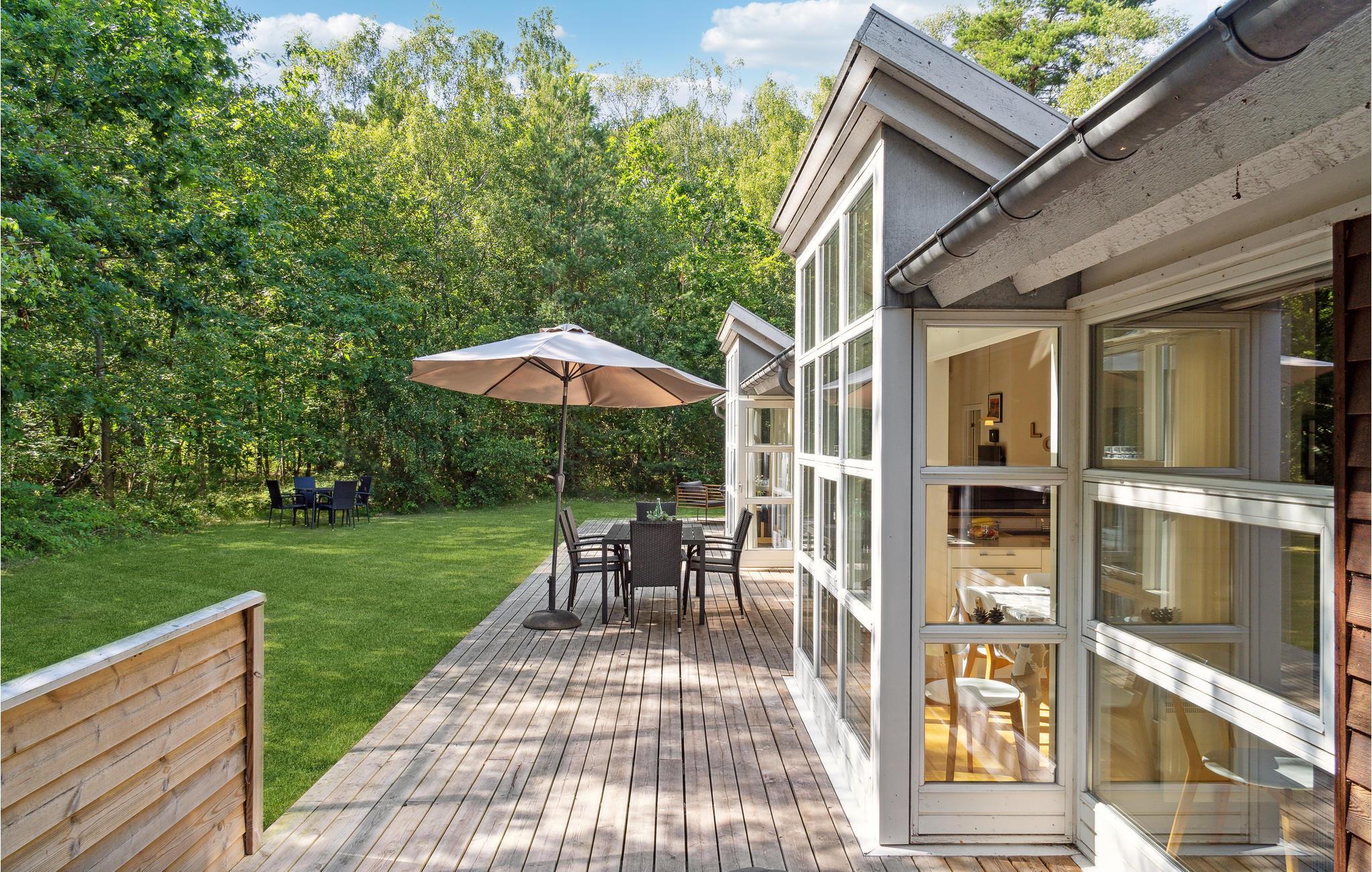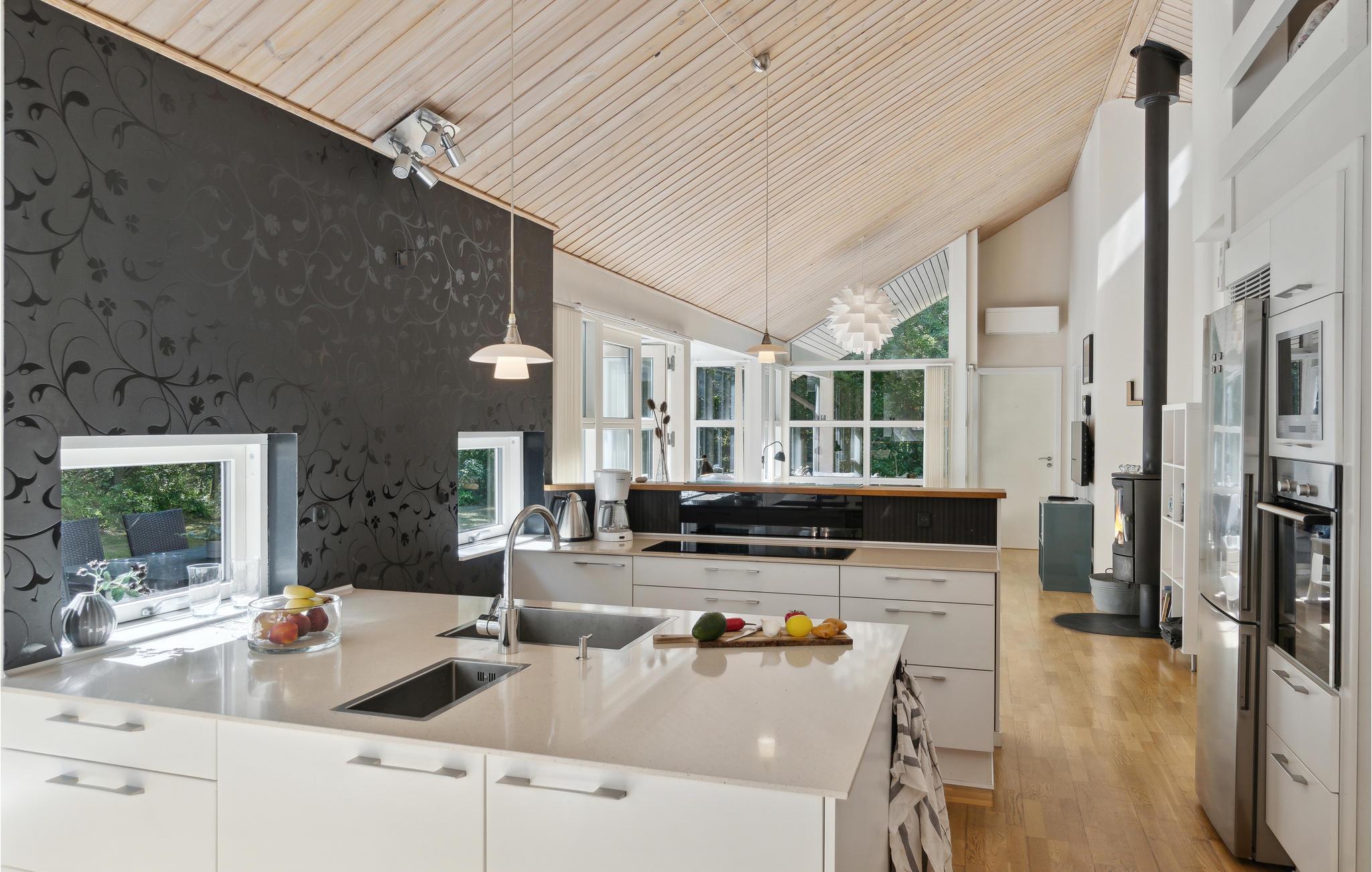 Moderne, innbydende kvalitetsferiehus med mange vakre detaljer og masse plass. Det romslige interiøret er godt utstyrt overalt. Du er på ferie i et større, barnevennlig feriehusområde. I nærheten finner du skog og strand. En stor stue med velholdte møbler og vedovn venter på deg. I tillegg sørger en varmepumpe for behagelige temperaturer. Wifi er tilgjengelig gratis, og det er fire TV-er. Det moderne kjøkkenet gjør det enkelt for deg å lage deilige feriemåltider. Du vil også være komfortabel ved spisebordet. Det luksuriøse badet er utstyrt med boblebad og badstue. På den store treterrassen foran stuen er det hyggelige hagemøbler og en grill. Her har du god plass med venner og familie. Et høyt nivå av komfort venter deg her i alle årstider.