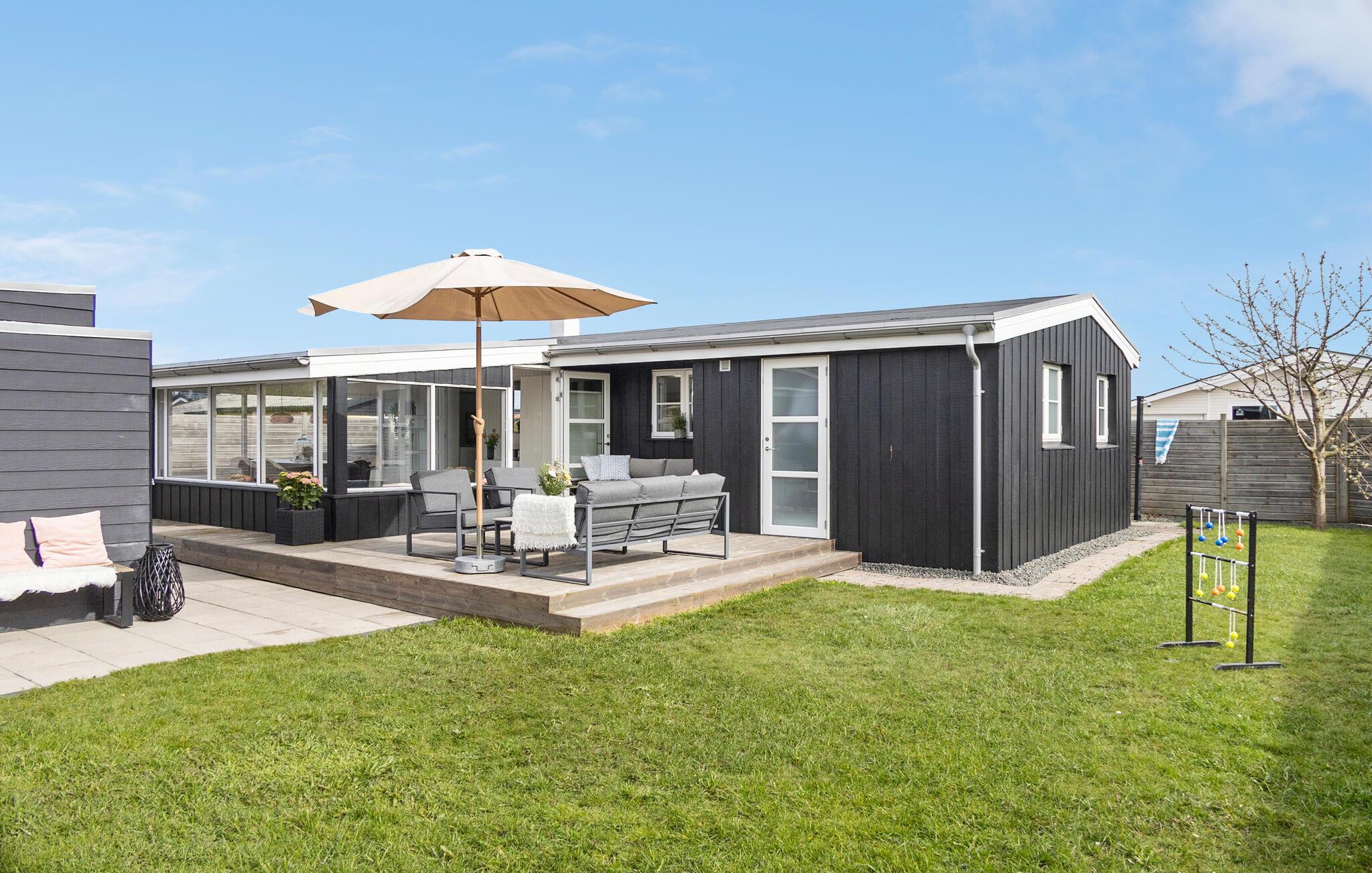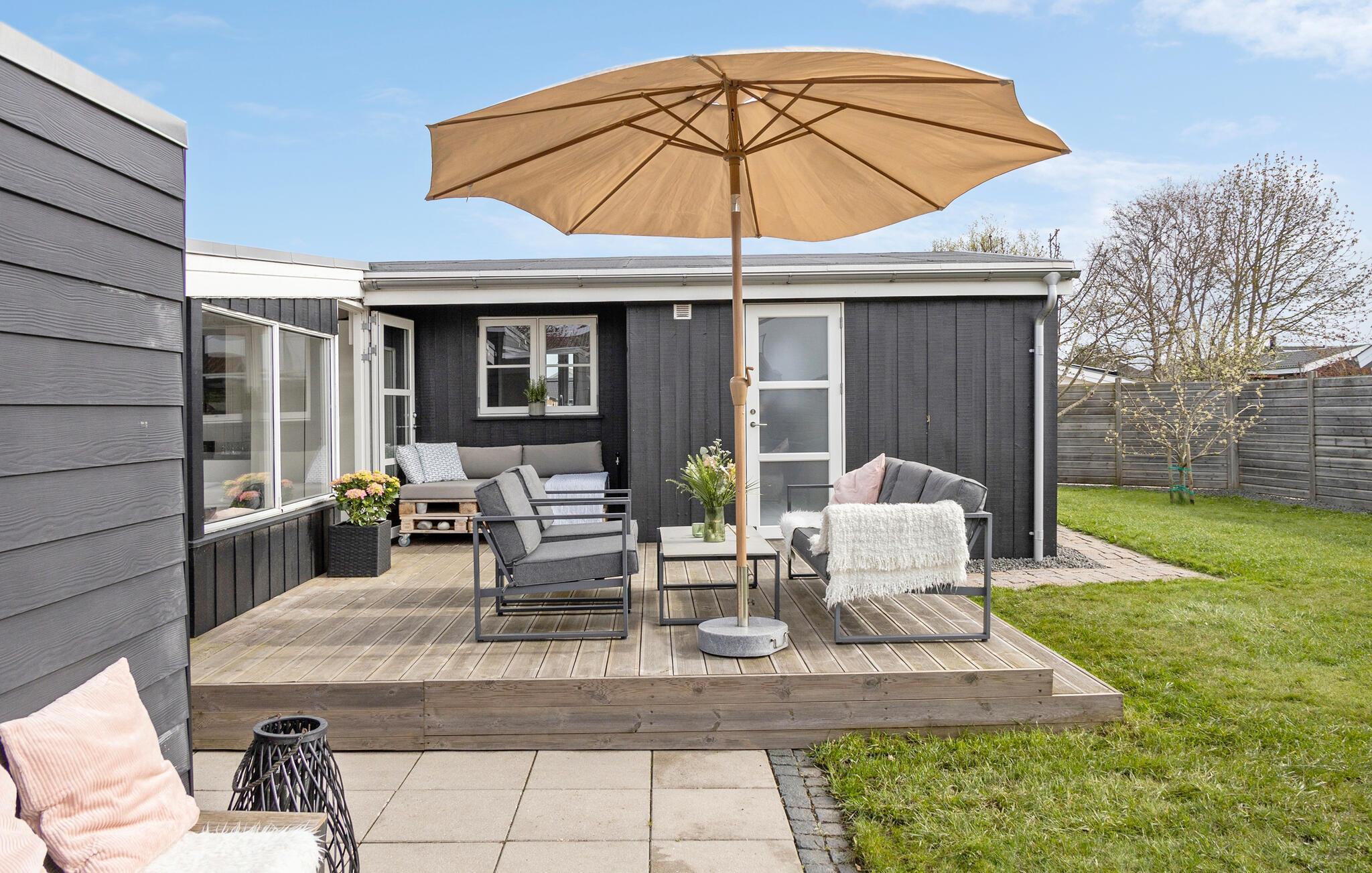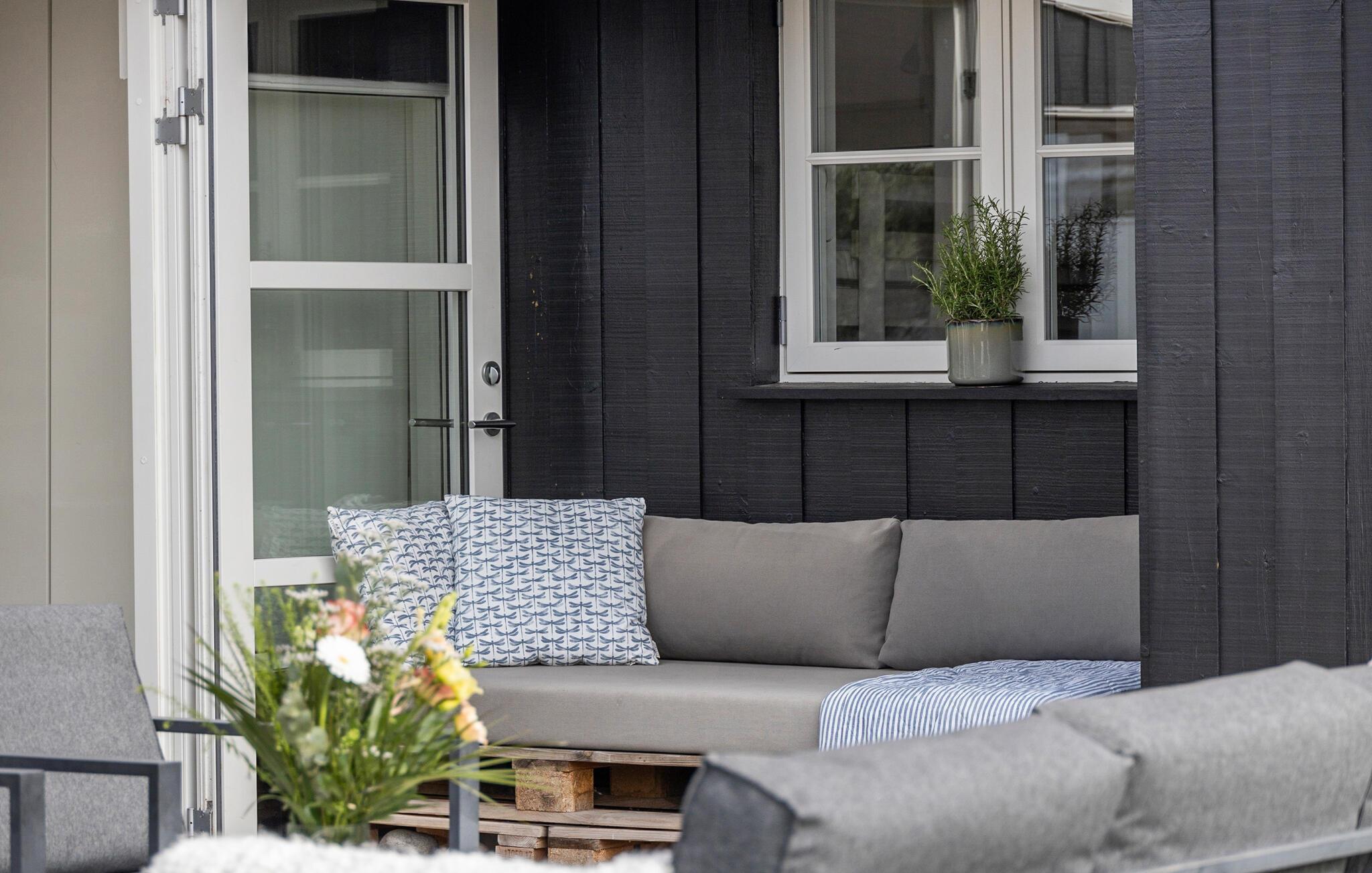 Feriehuset ditt i tradisjonell svart trestil gir deg en innbydende atmosfære. Den åpne stue- og spisestuen med store vinduer slipper inn rikelig med lys og skaper en attraktiv atmosfære. Start dagen med en avslappende kopp kaffe ved kjøkkenbenken. Spisebordet i vinterhagen er klart for familiefrokost. Her kan du også planlegge aktivitetene dine på Fyn. Hygge er høyt prioritert både i den vakre sofagruppen og på de mange komfortable sittegruppene på terrassen. Her kan dere samles for å spille brettspill, lese spennende bøker eller spille morsomme hagespill.
