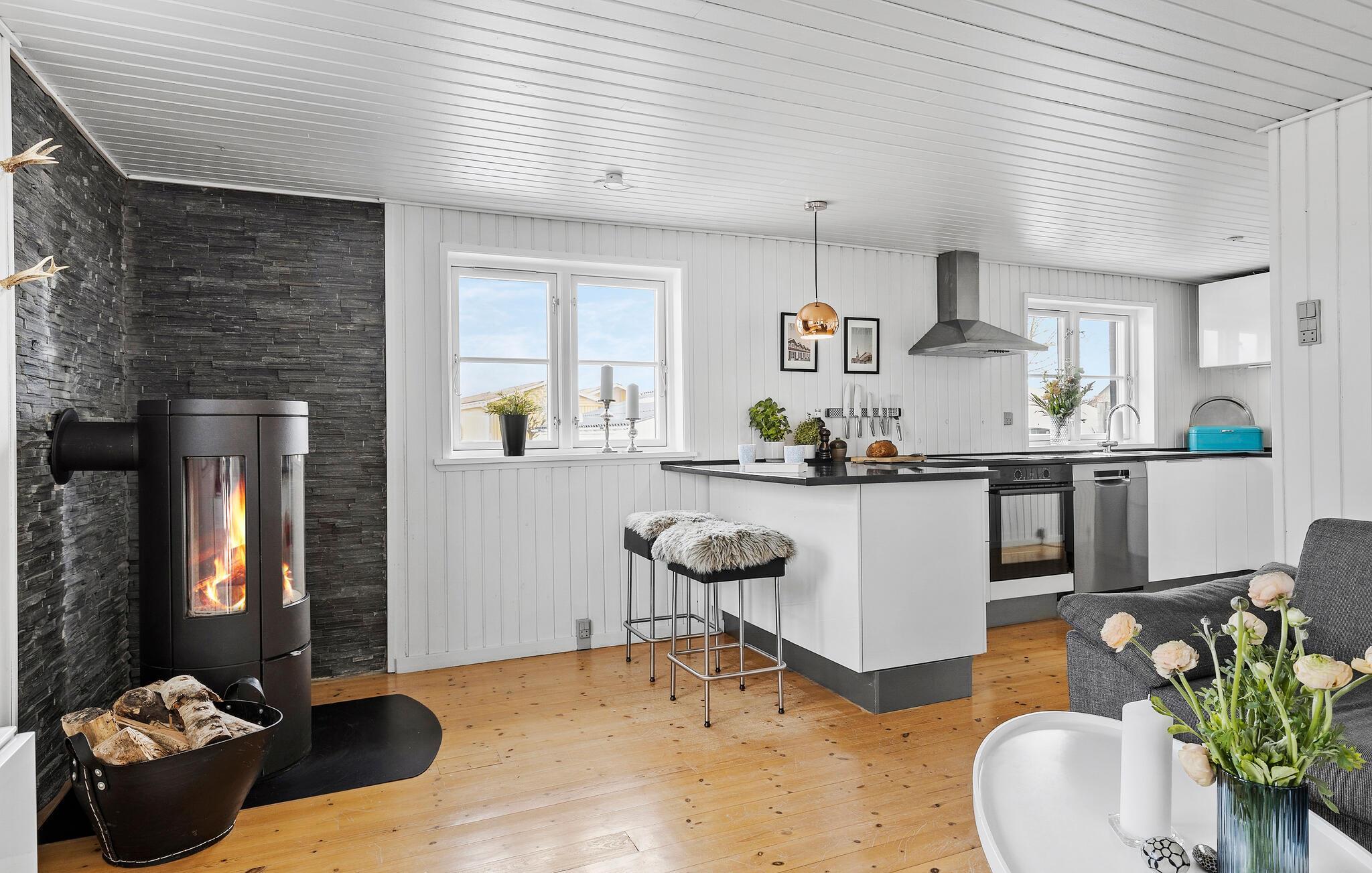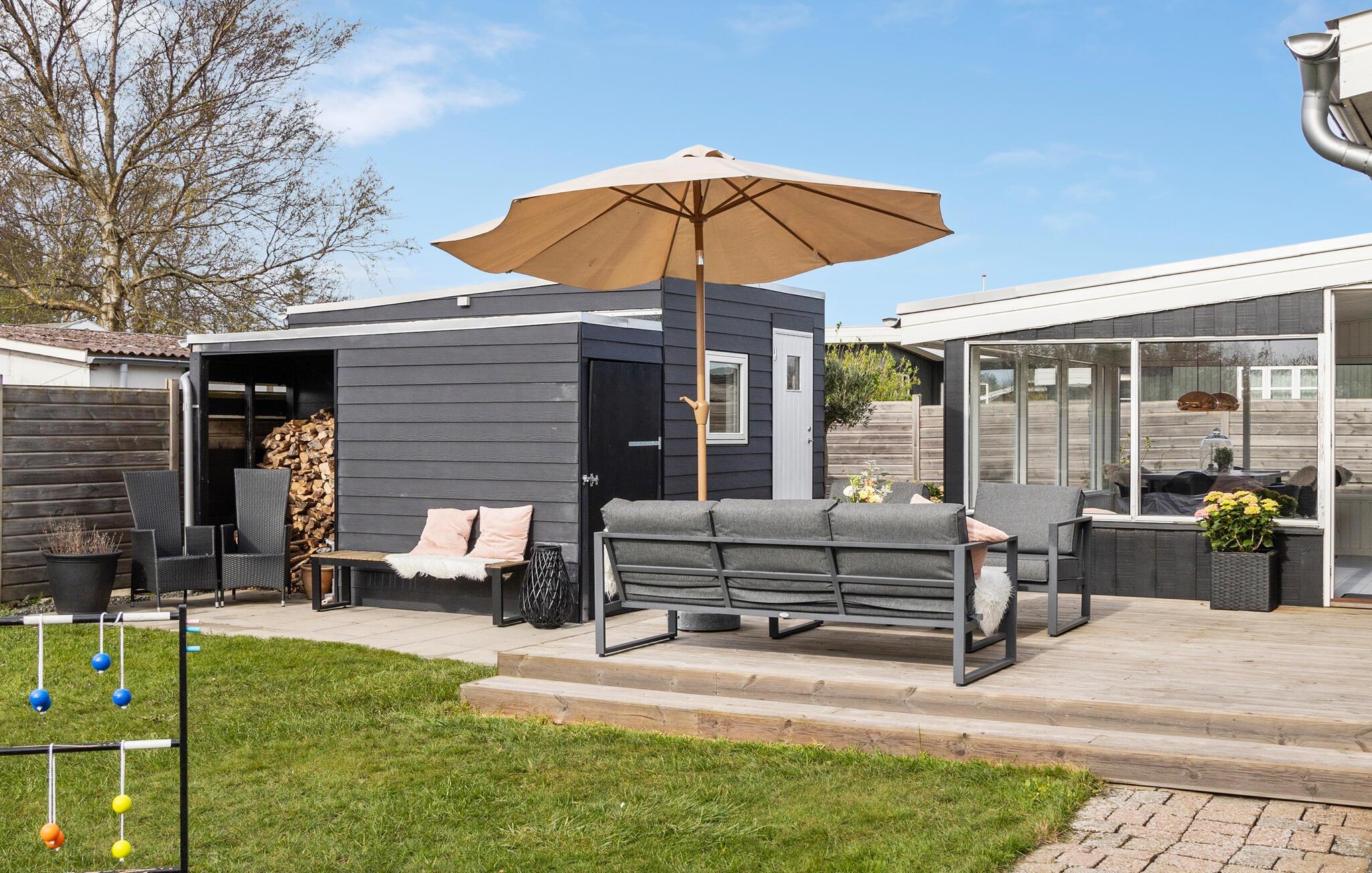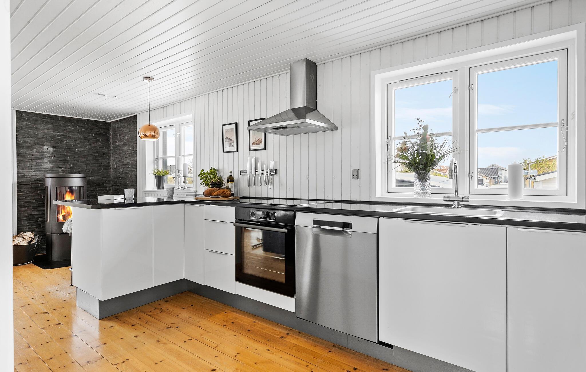 Feriehuset ditt i tradisjonell svart trestil gir deg en innbydende atmosfære. Den åpne stue- og spisestuen med store vinduer slipper inn rikelig med lys og skaper en attraktiv atmosfære. Start dagen med en avslappende kopp kaffe ved kjøkkenbenken. Spisebordet i vinterhagen er klart for familiefrokost. Her kan du også planlegge aktivitetene dine på Fyn. Hygge er høyt prioritert både i den vakre sofagruppen og på de mange komfortable sittegruppene på terrassen. Her kan dere samles for å spille brettspill, lese spennende bøker eller spille morsomme hagespill.