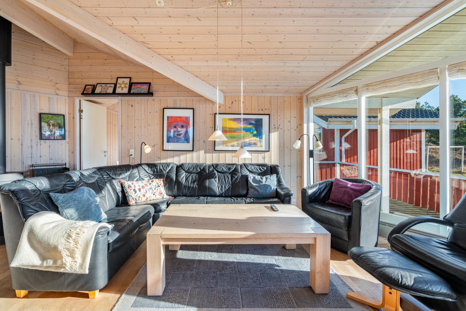 Die gemütliche Wohnstube ist geschmackvoll eingerichtet mit bequemen Ledermöbeln, die zu entspannten Abenden vor dem Kamin oder Fernseher einladen.