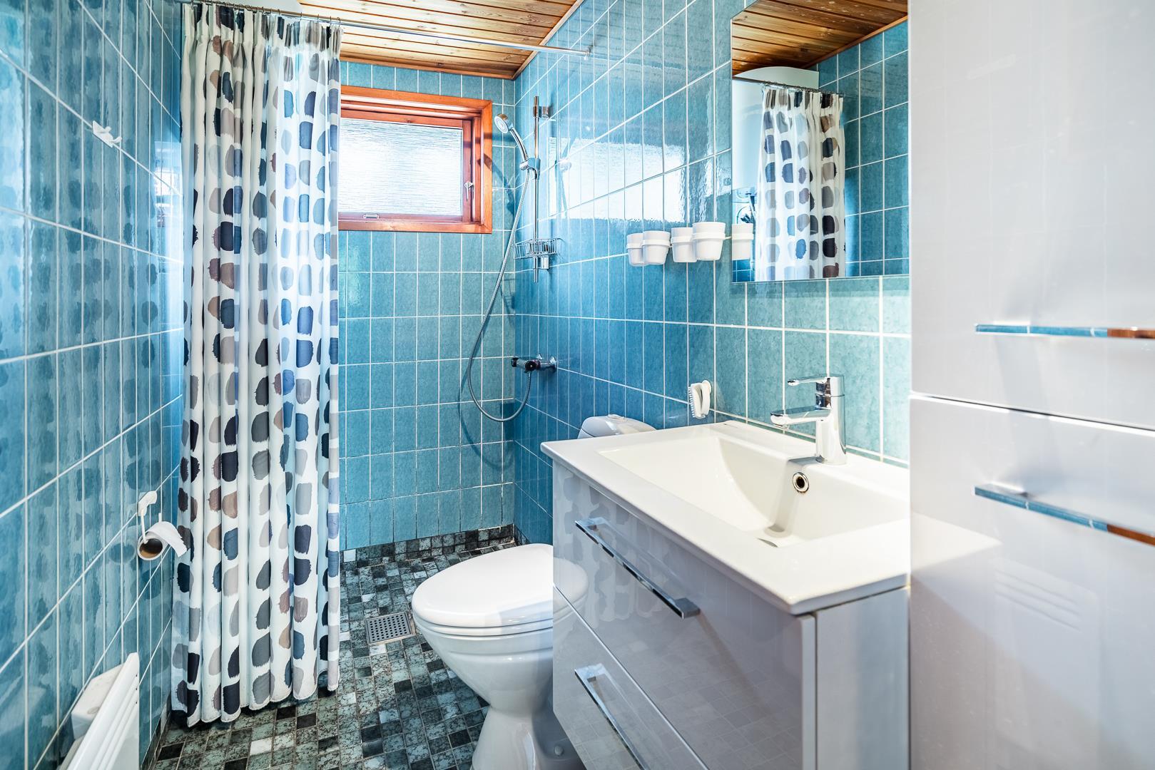 Dieses nette und gut gepflegte Holzferienhaus liegt auf einem von Kiefern umgebenen Naturgrundstück. Die Küche mit Geschirrspüler ist offen zum Essbereich und dem Wohnzimmer. Hier kann man es sich auf einem der beiden Sofas vor dem offenen Kamin gemütlich machen. Das Haus umgibt teilweise überdachte Terrassen, die nach Ost, Süd und West ausgerichtet sind. So hat man die Möglichkeit sich entweder in der Sonne oder im Schatten zu entspannen. Für die Kleinen gibt es eine Sandkiste. Das Haus ist für fünf Personen zugelassen und hat die Schlafplätze verteilt auf drei Schlafzimmer.