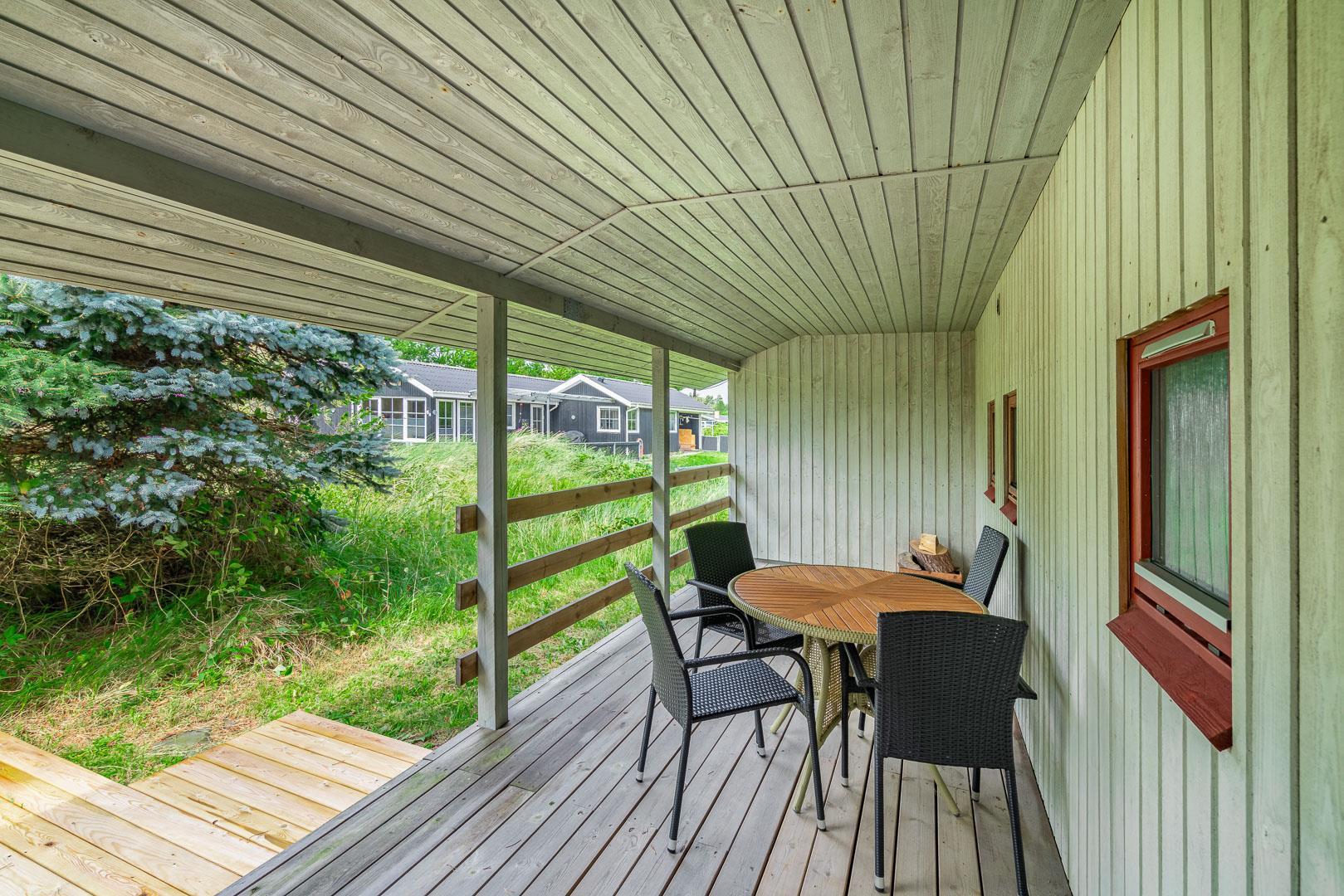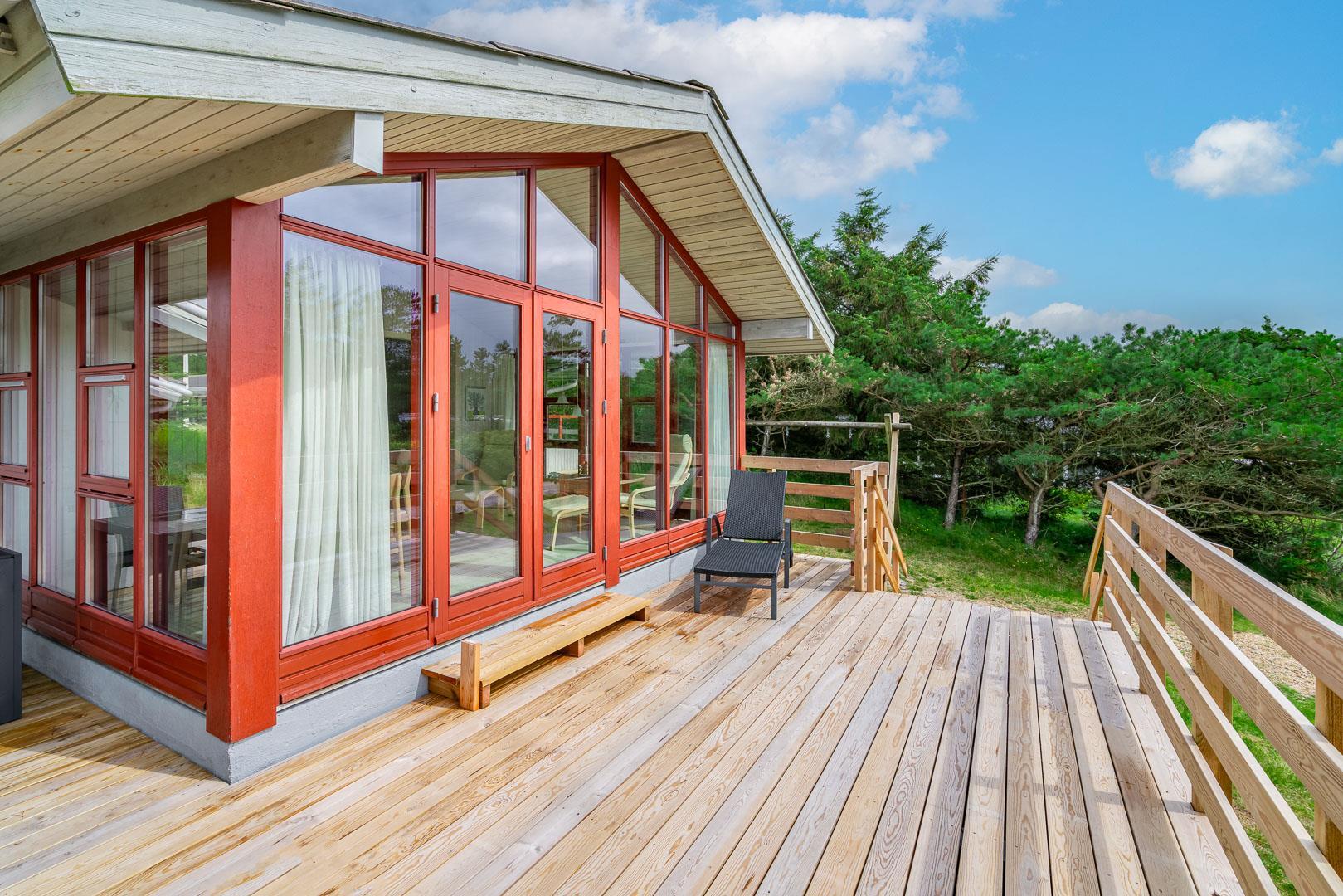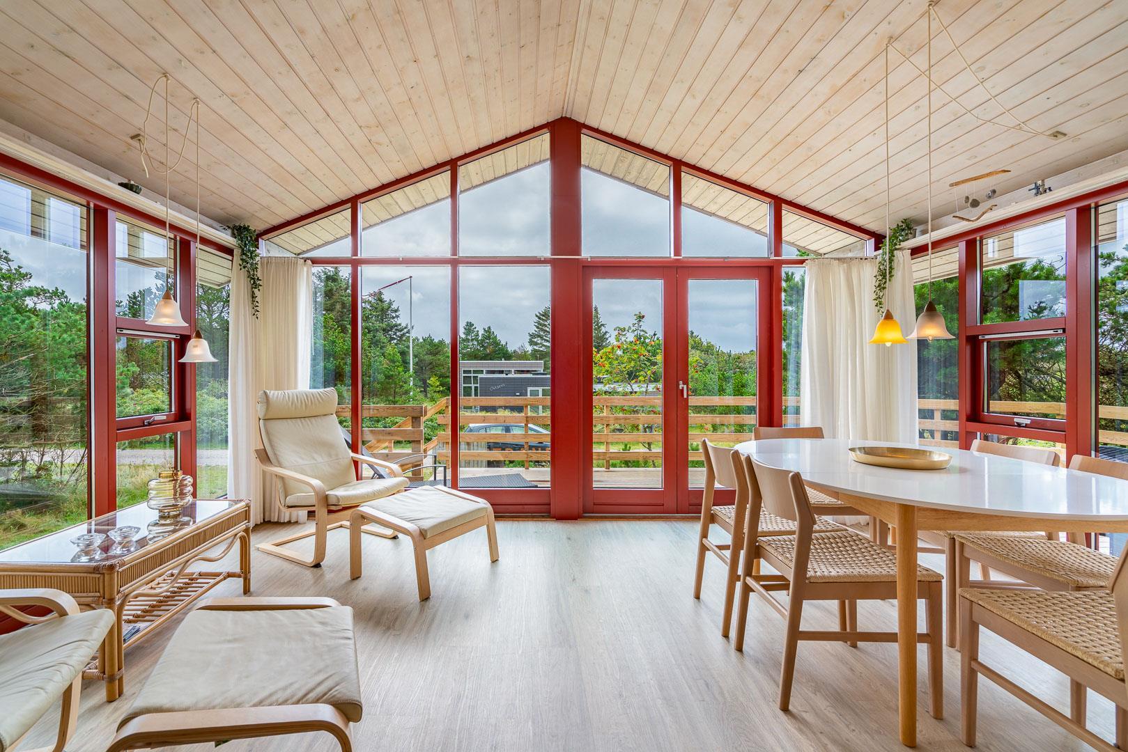 Der angrenzende Wintergarten führt auf eine große Terrasse, die zum Essen im Freien oder Sonnenbaden einlädt. Eine überdachte Terrasse mit Blick auf die Heide und die Blåbjerg Plantage rundet das Outdoor-Erlebnis ab – ideal, um auch bei wechselhaftem Wetter draußen zu sitzen.