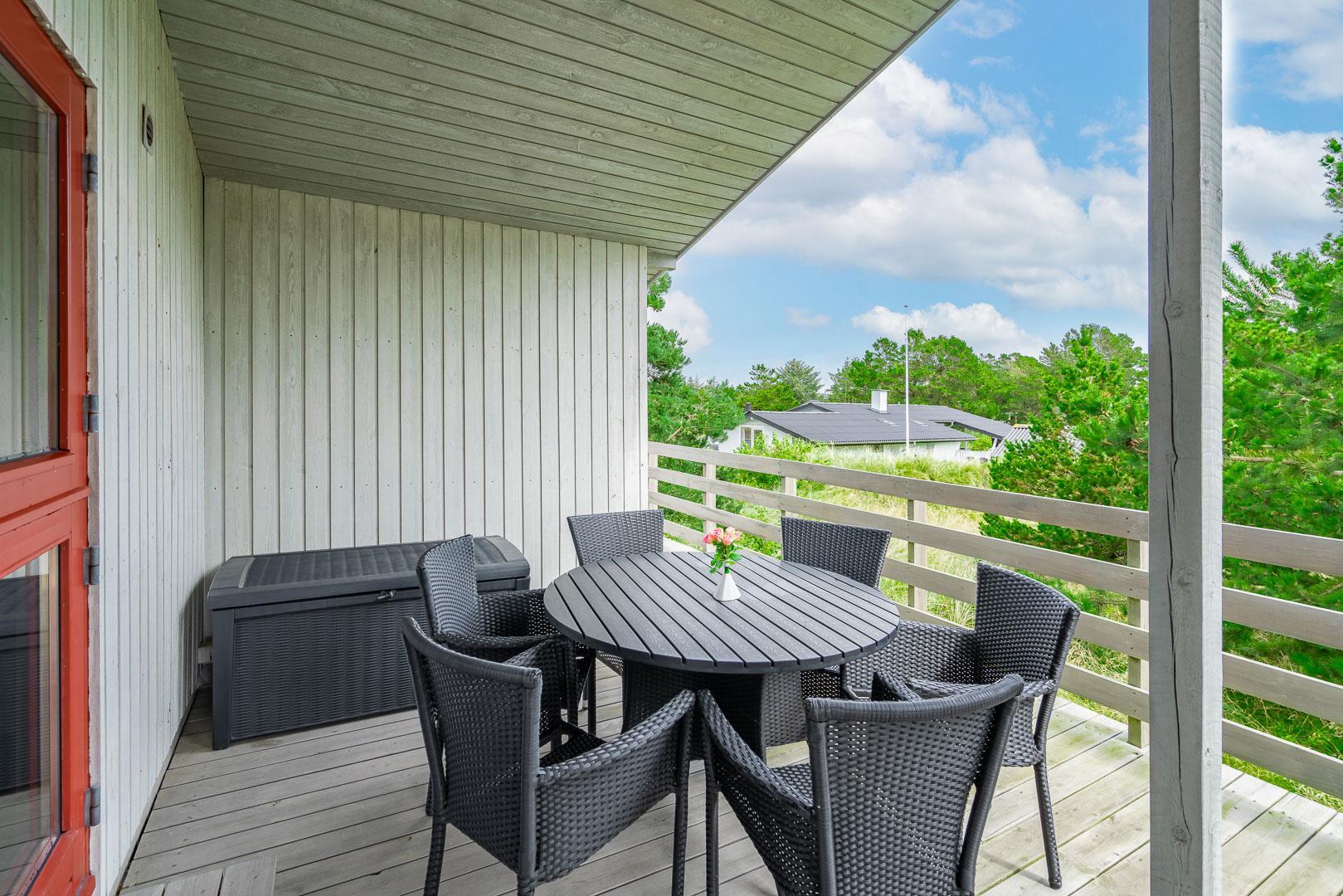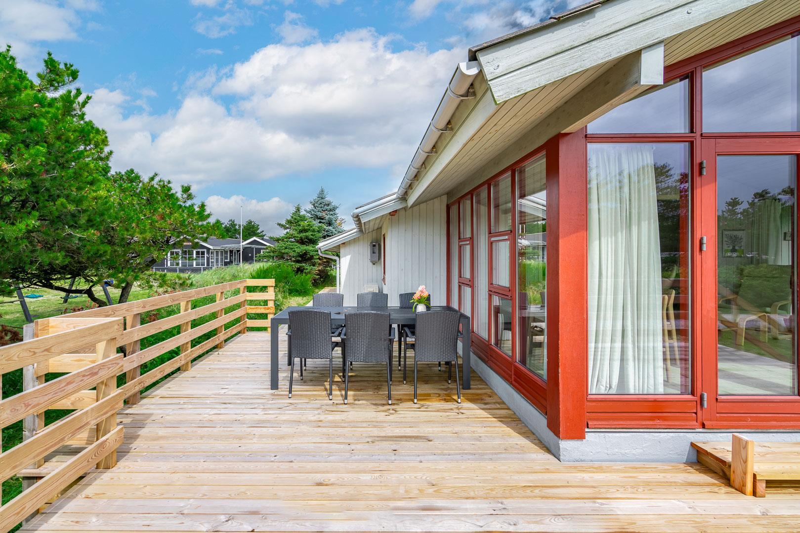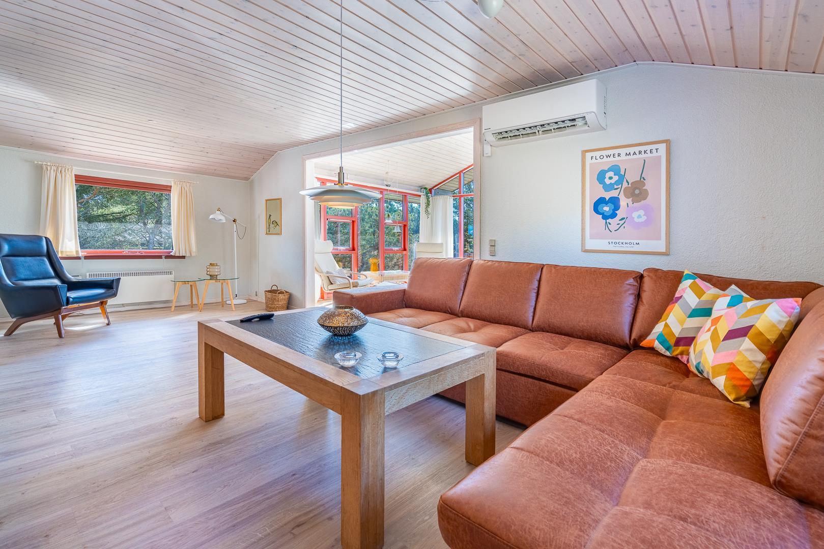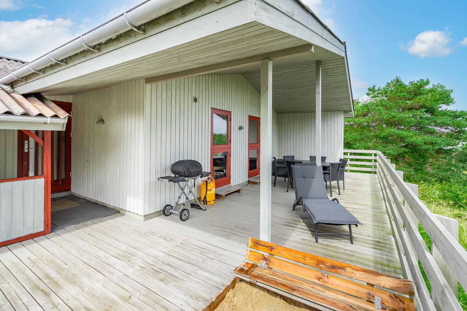 Der angrenzende Wintergarten führt auf eine große Terrasse, die zum Essen im Freien oder Sonnenbaden einlädt. Eine überdachte Terrasse mit Blick auf die Heide und die Blåbjerg Plantage rundet das Outdoor-Erlebnis ab – ideal, um auch bei wechselhaftem Wetter draußen zu sitzen.