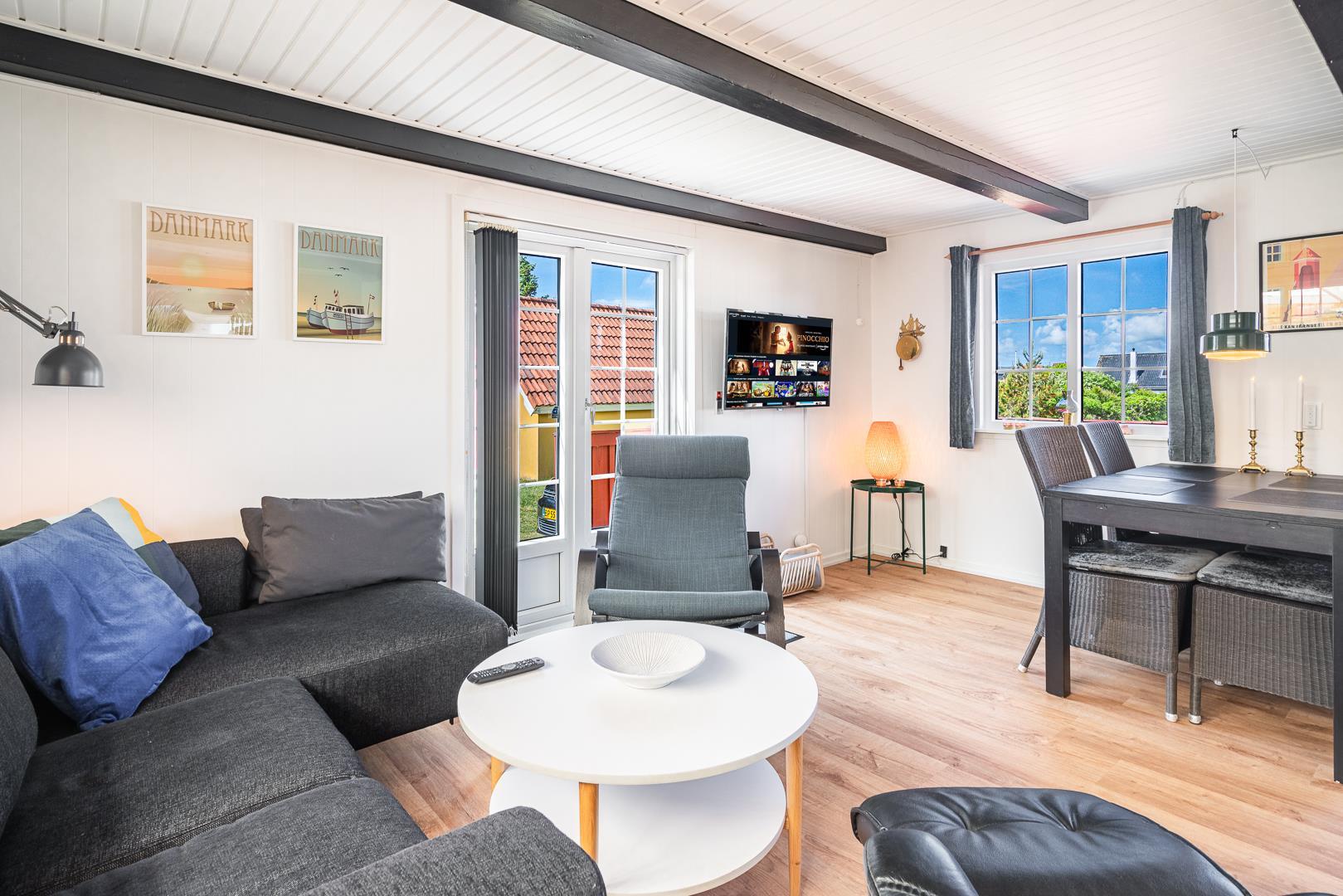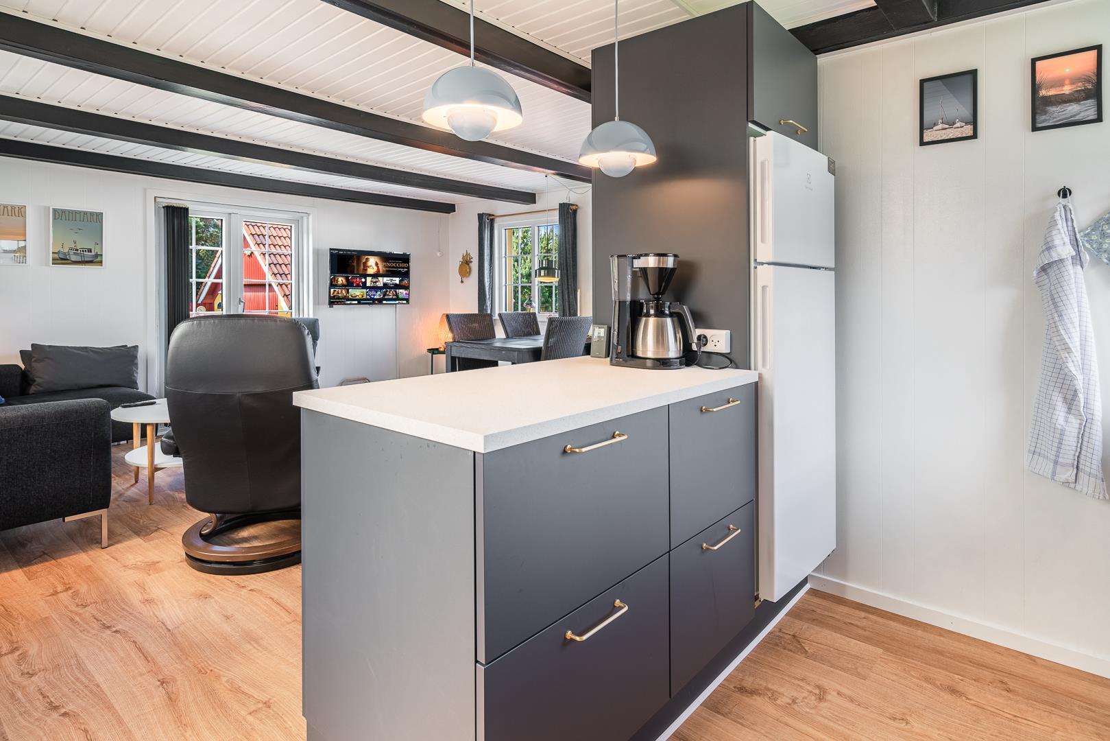 Das Haus ist schön eingerichtet mit guten Möbeln, Vorraum/Wintergarten mit viel Platz für Schuhe und Oberbekleidung und hier gibt es auch einen kleinen Essbereich. Neue schöne Küche ab März 2022.Auf der 1. Etage befinden sich die 2 Schlafzimmer des Hauses mit Doppelbetten. Die Treppe führt steil hinauf in die 1. Etage.
