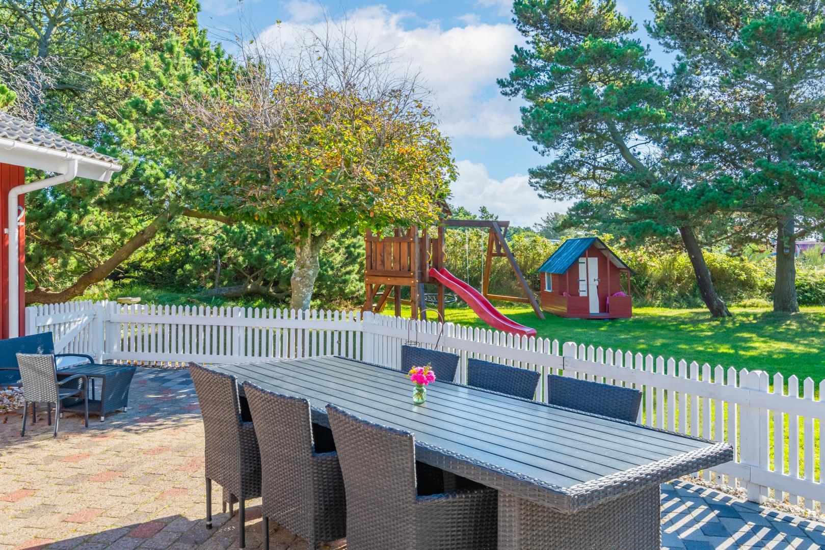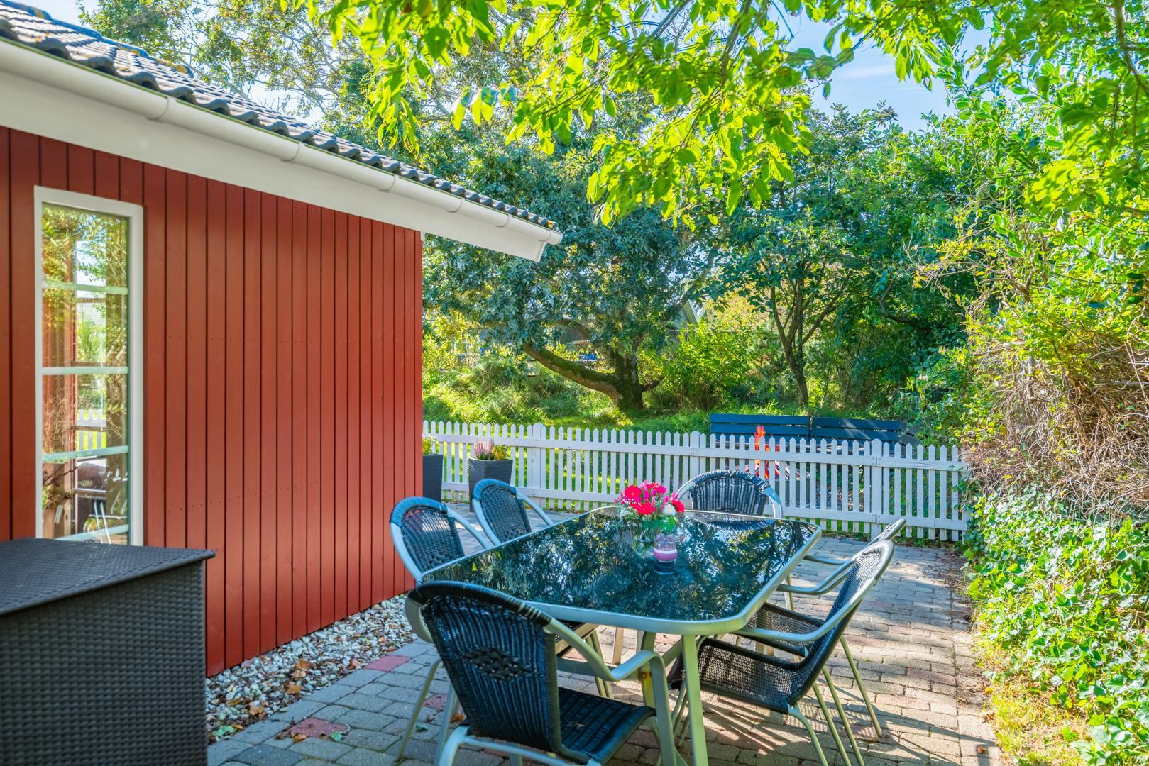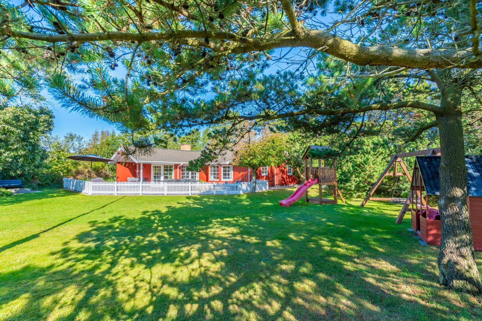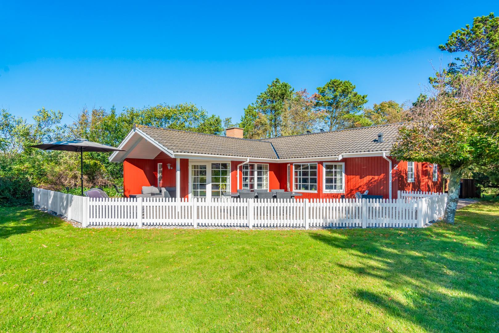 Dieses sehr gepflegte und gemütlich eingerichtete Ferienhaus mit hohen Decken liegt auf einem kinderfreundlichen, bewachsenen Naturgrundstück. Das Haus bietet einen modernen Küchen (2015)- und Essbereich und ein mit guten Möbeln ausgestattetes Wohnzimmer. Eines der Badezimmer verfügt über eine Waschmaschine und einen Trockner. Vom Wohnbereich hat man Zugang zu einer schönen, geschlossenen und ungestörten Terrasse. Für Kinder ist ein Spielhaus auf dem Grundstück vorhanden.