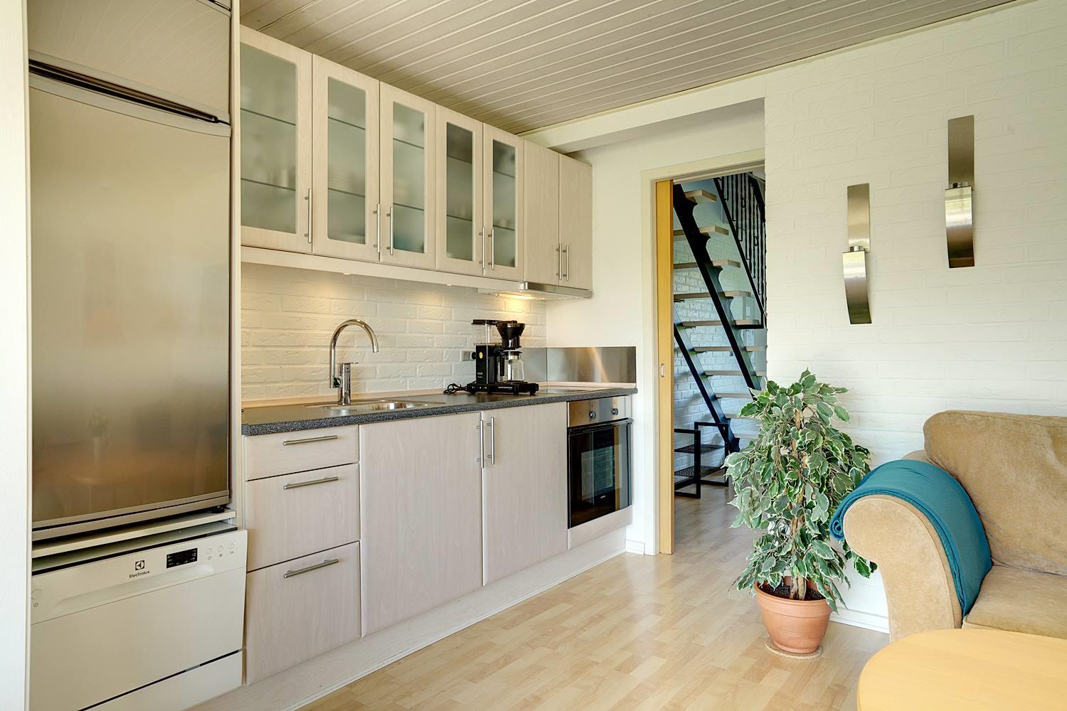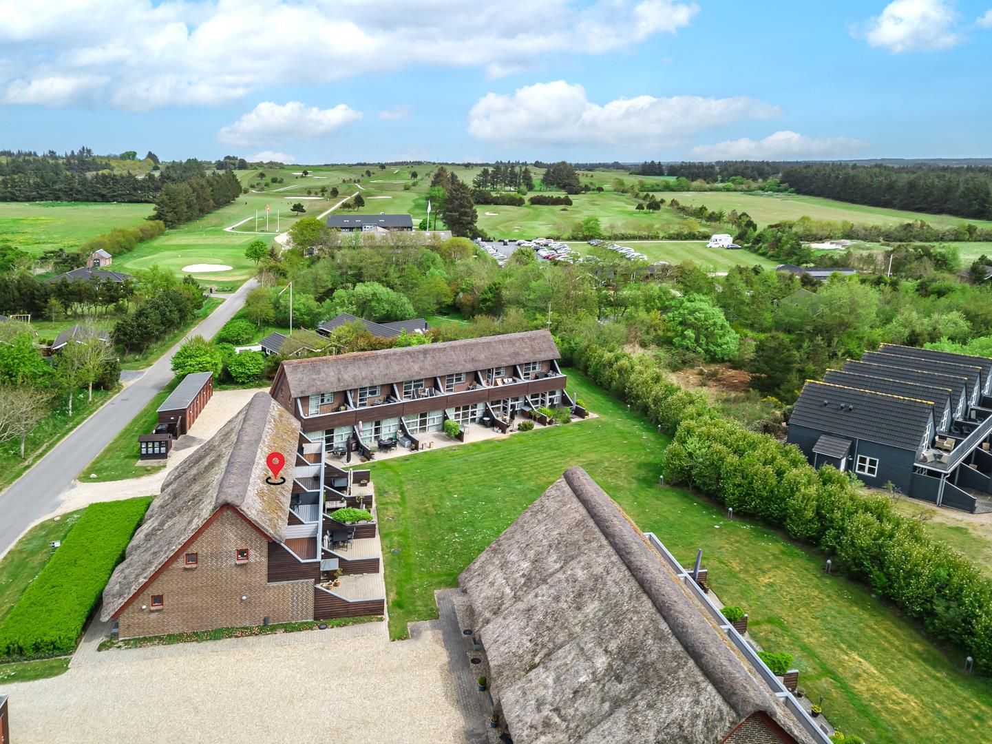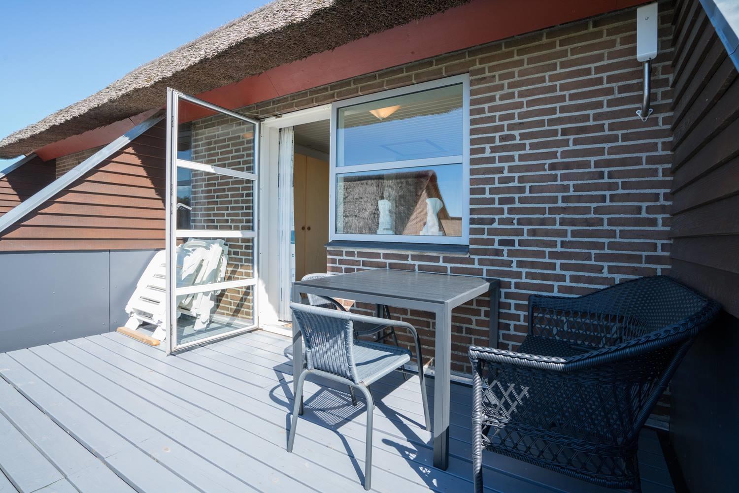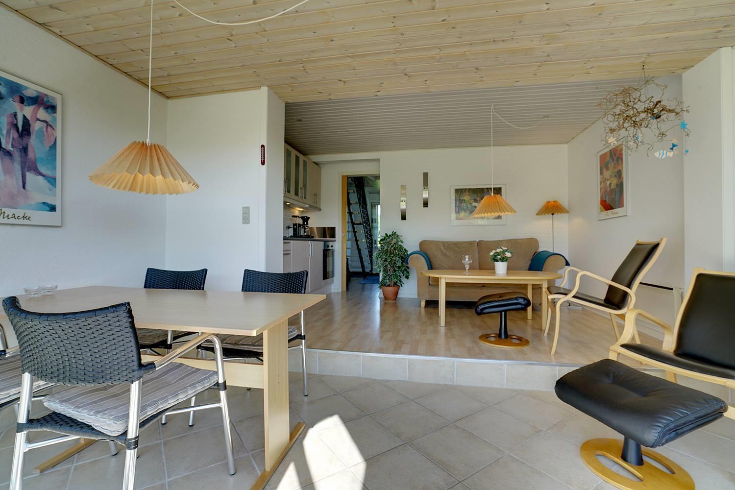 In ruhiger Umgebung und nur wenige hundert Meter vom 18-Loch-Golfplatz entfernt liegt diese schöne Ferienwohnung über zwei Etagen in einem reetgedeckten Klinkerbau. Die Ferienwohnung verfügt über eine neuere Küche und eine moderne Möblierung. Der Essbereich und der Wohnraum sind durch eine Stufe unterteilt und man gelangt auf eine Südterrasse. Im 1.Stock befinden sich ein großer Schlafraum und ein Südbalkon. Auf dem Gemeinschaftsgrund besteht die Möglichkeit für Ballspiele. In der Zeit von Ostern bis Herbst sind es 200m bis zum Camping Platz, wo es einen kleinen Einkaufsmarkt gibt.