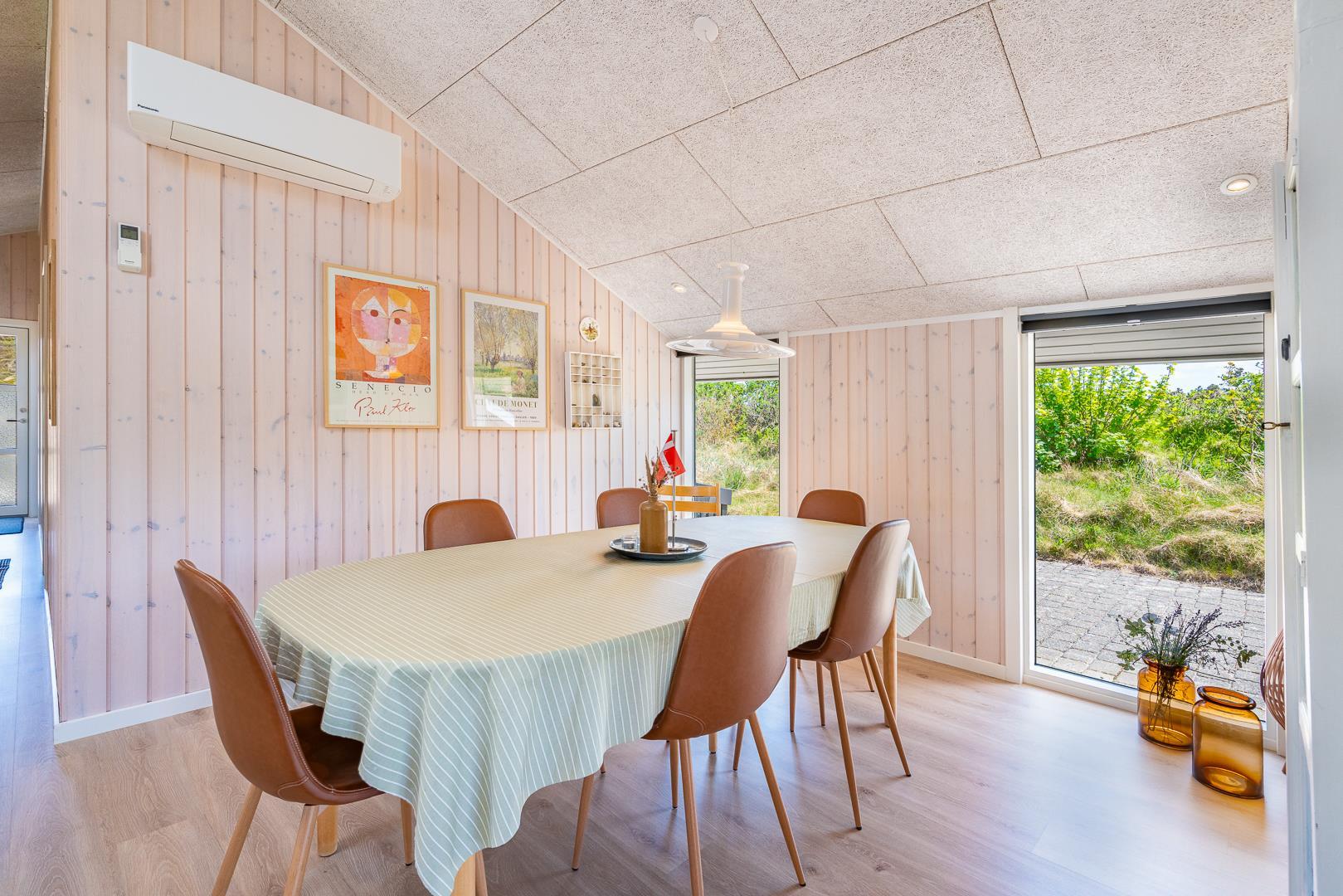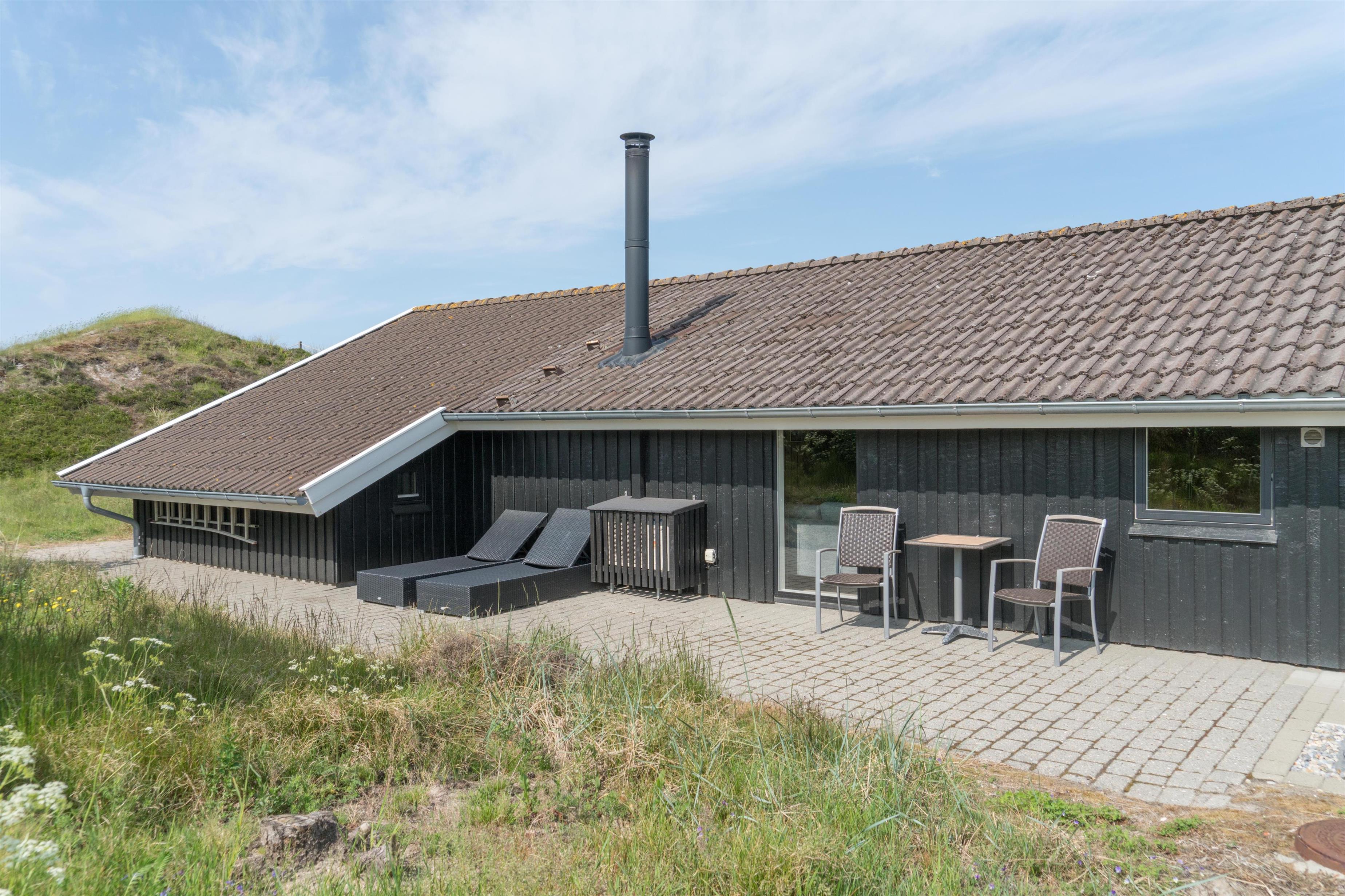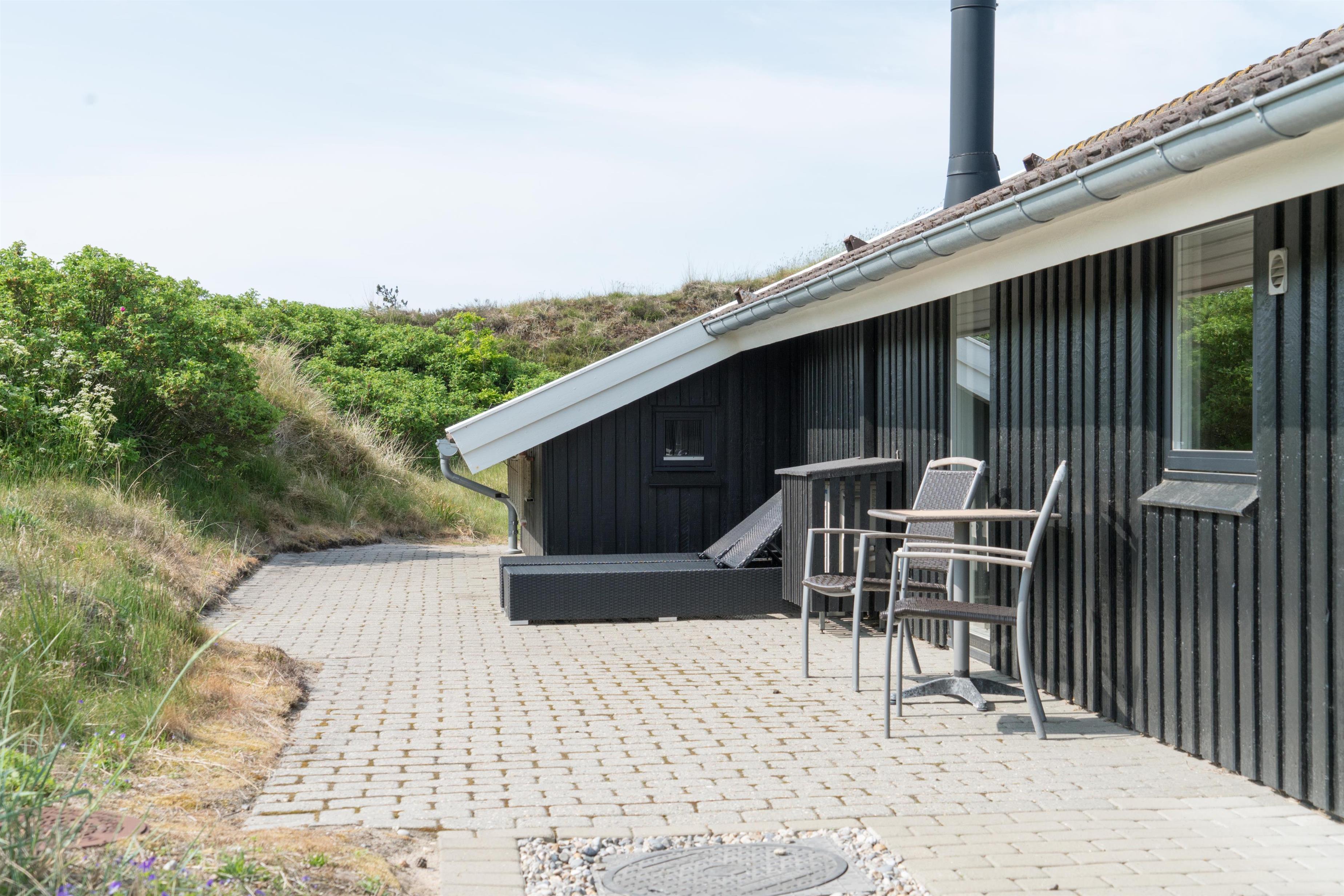 Dieses stimmungsvolle und komplett renovierte Ferienhaus mit Carport befindet sich am Hjelmevej 134 in Henne Strand. Das Haus liegt auf einem abgelegenen Dünengrundstück und ist von schönen Terrassen umgeben, von denen eine überdacht ist.