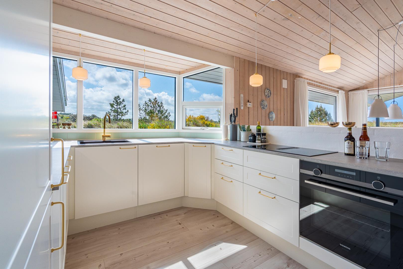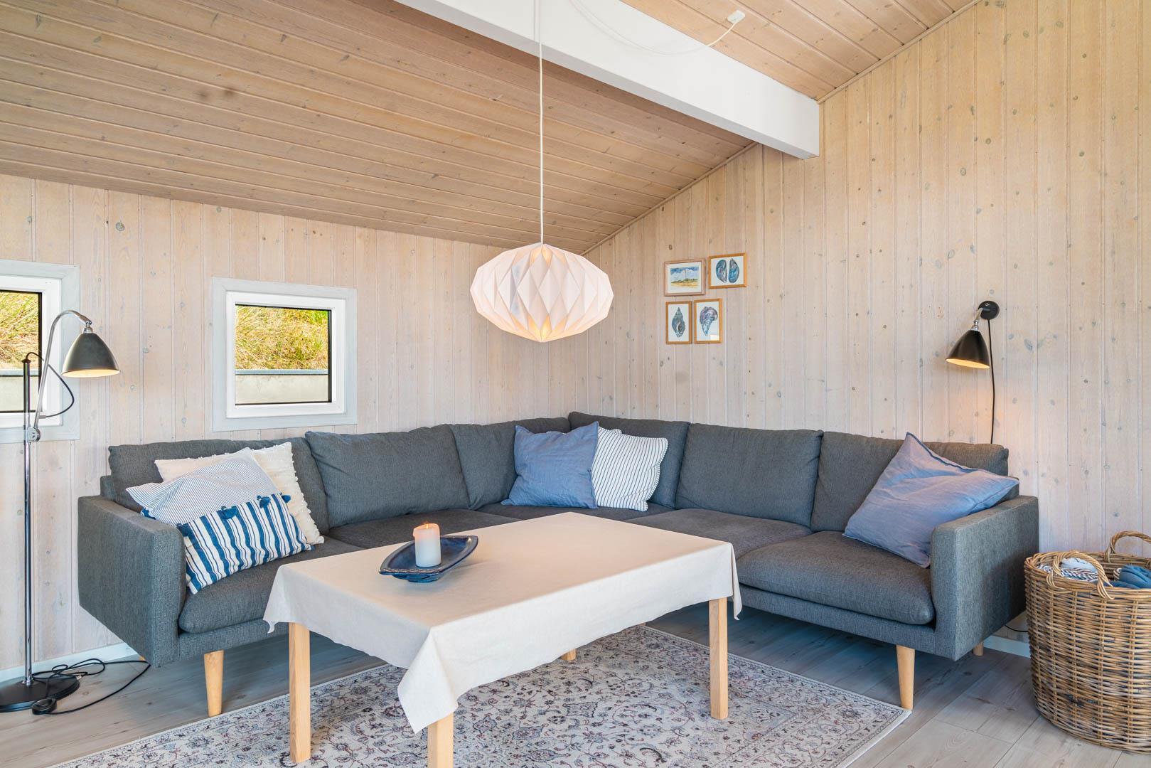 Das Haus liegt auf einer Düne in fantastischer Lage. Durch die großen Fensterfronten hat man die beste Aussicht. Das Haus ist hell und hat hoffe Decken. Dies alles schafft eine einladende Atmosphäre.